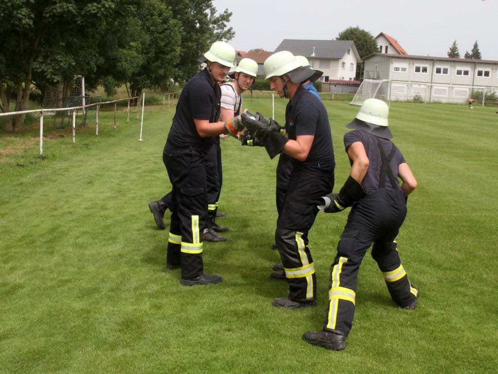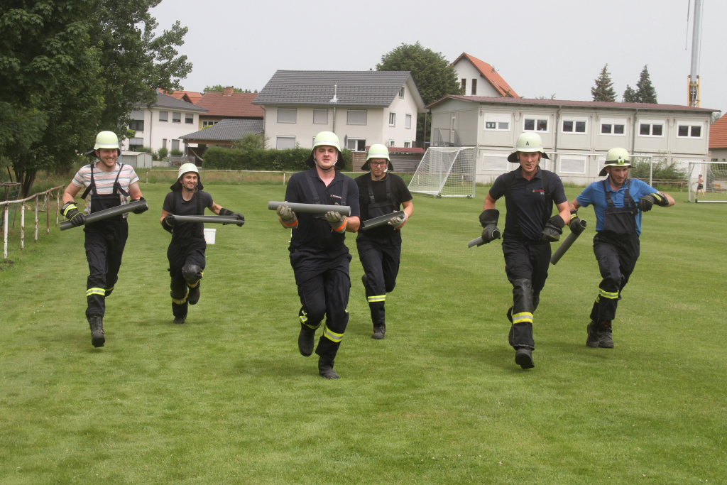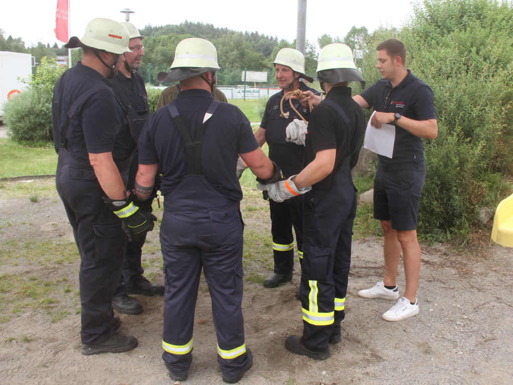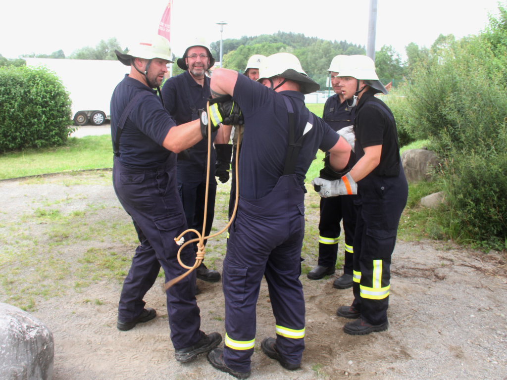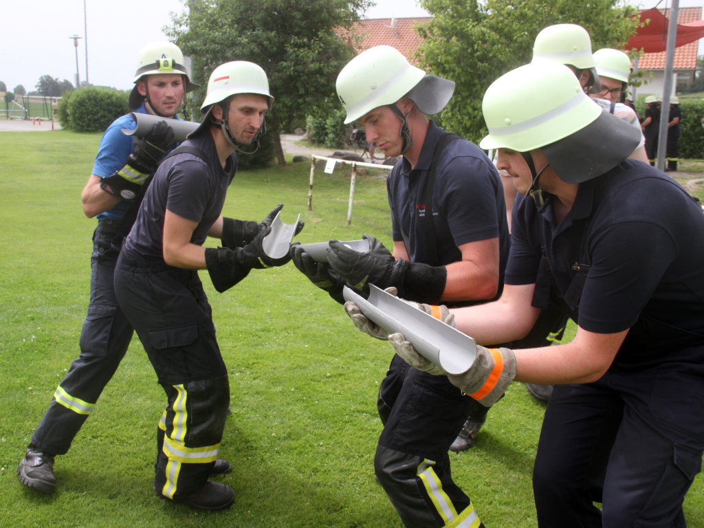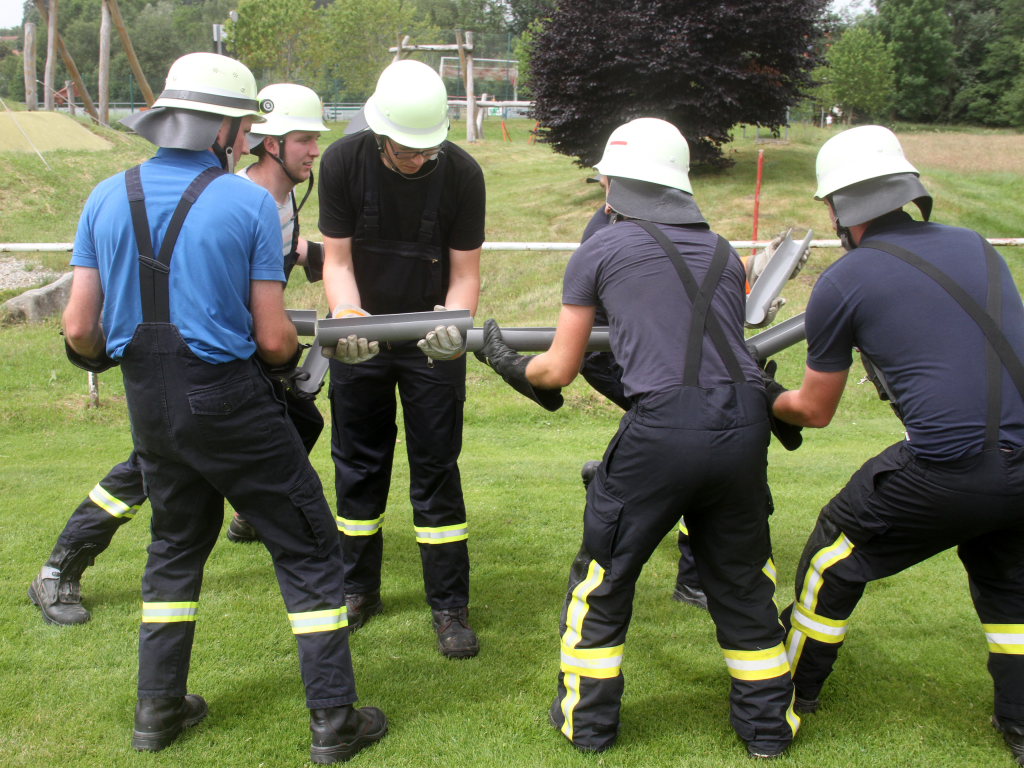 Somit machten sich zwölf Mannschaften mit Jugendfeuerwehr und als Gast die Wehr aus Diepolshofen daran, die sechs Aufgaben zu lösen. Los ging es beim Feuerwehrhaus, wo zunächst die Köpfe zu rauchen begannen, kein Wunder bei über 30 Grad im Schatten. Dabei mussten die Teams feuerwehrtechnische Fragen beantworten, aber auch Fragen der Allgemeinbildung: z.B „Wer schrieb die deutsche Nationalhymne, „Wann wurde die Freiheitsstatue gebaut?“ oder „Wie hoch ist die Zugspitze?“