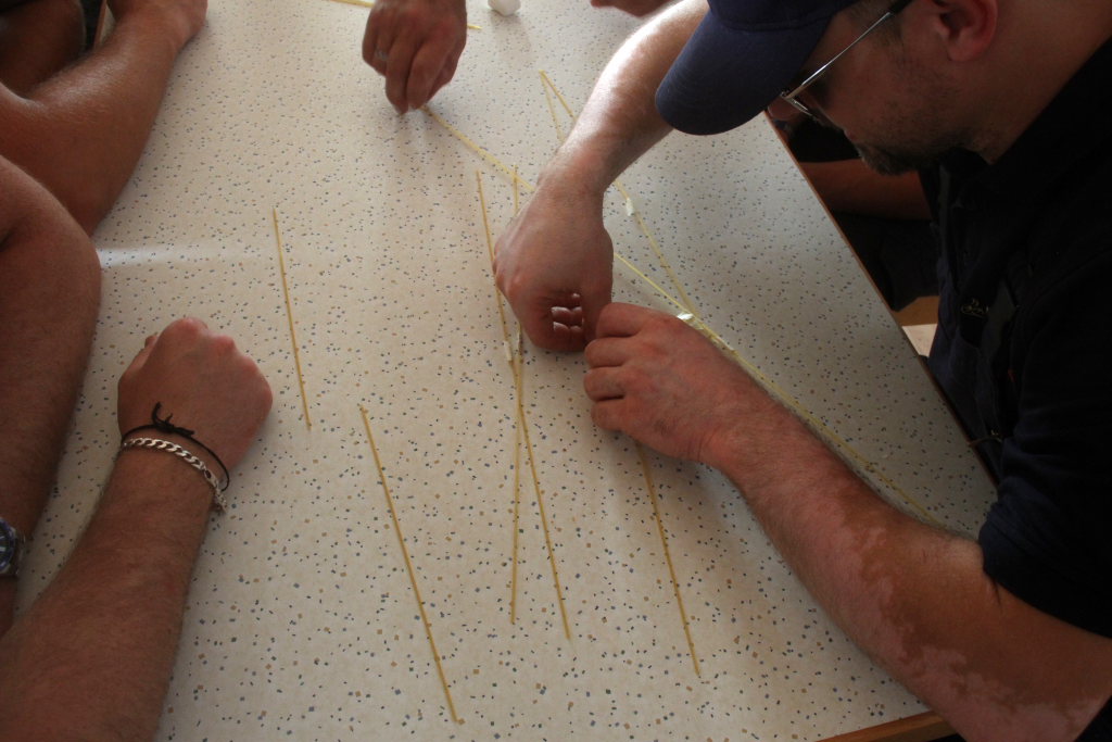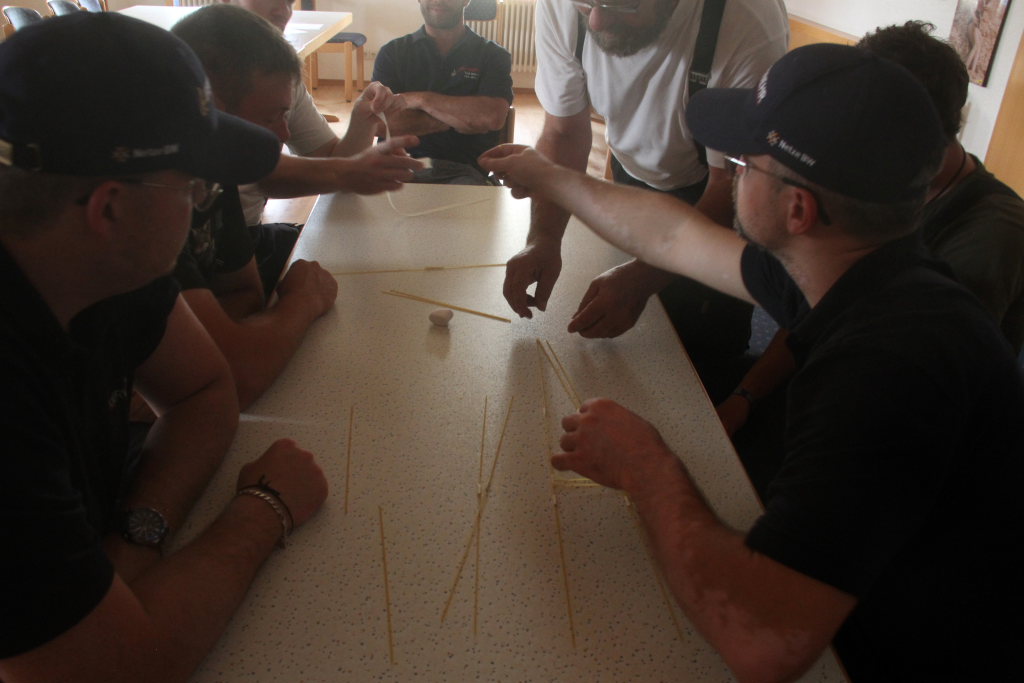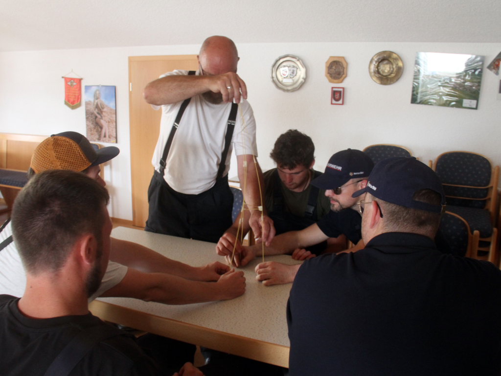 Deutlich kühler war es dann im Floriansstüble, wo an der zweiten Station viel Feingefühl und konstruktives Wissen gefragt war, denn die Wehrleute mussten hier aus Gründen des Teambbuildings aus 25 Stück Spagetti und einem Meter Klebeband einen möglichst hohen Turm bauen, auf dessen Spitze das Marshmellow thronen sollte.