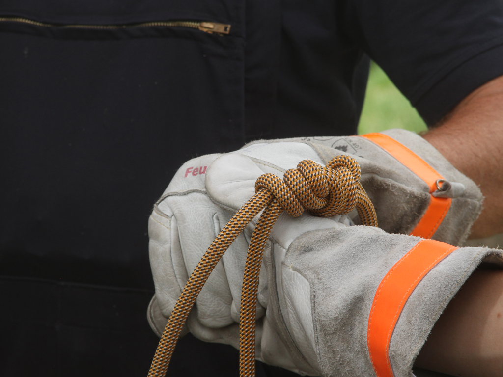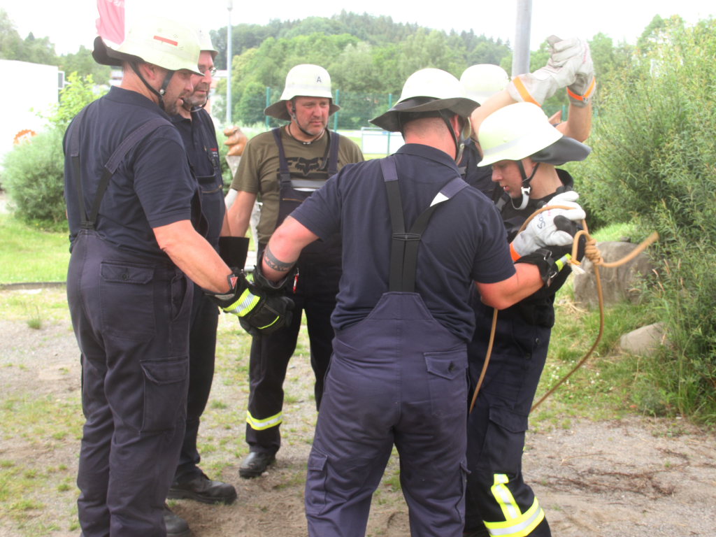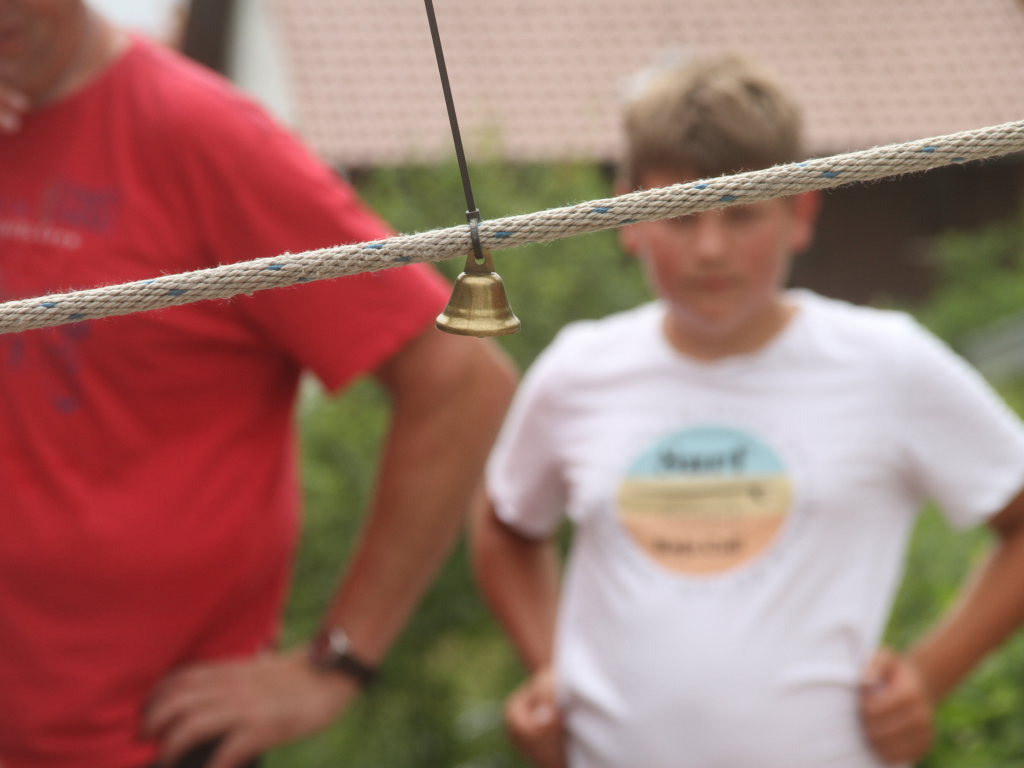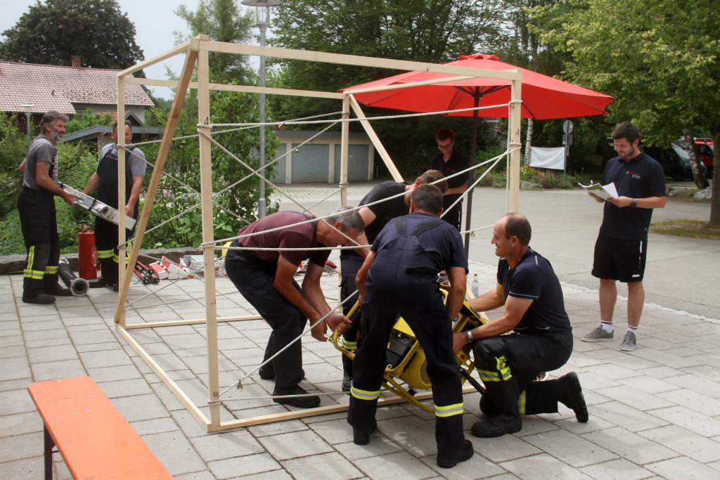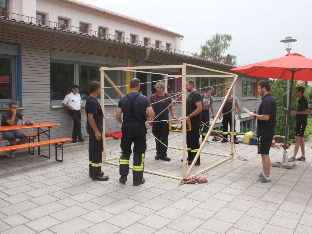 Fingerspitzengefühl, aber auch Kraft und ein gutes Auge war beim anderen Spiel auf dem Schulhof beim Bildungshaus erforderlich: Diverse Feuerwehrgerätschaften mussten wie durch ein Spinnennetz von der einen zur anderen Seite eines Quaders transportiert werden. Dabei durfte jedes Segment nur einmal benutzt und die Seile nicht berührt werden.