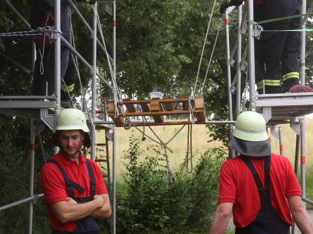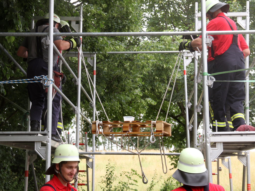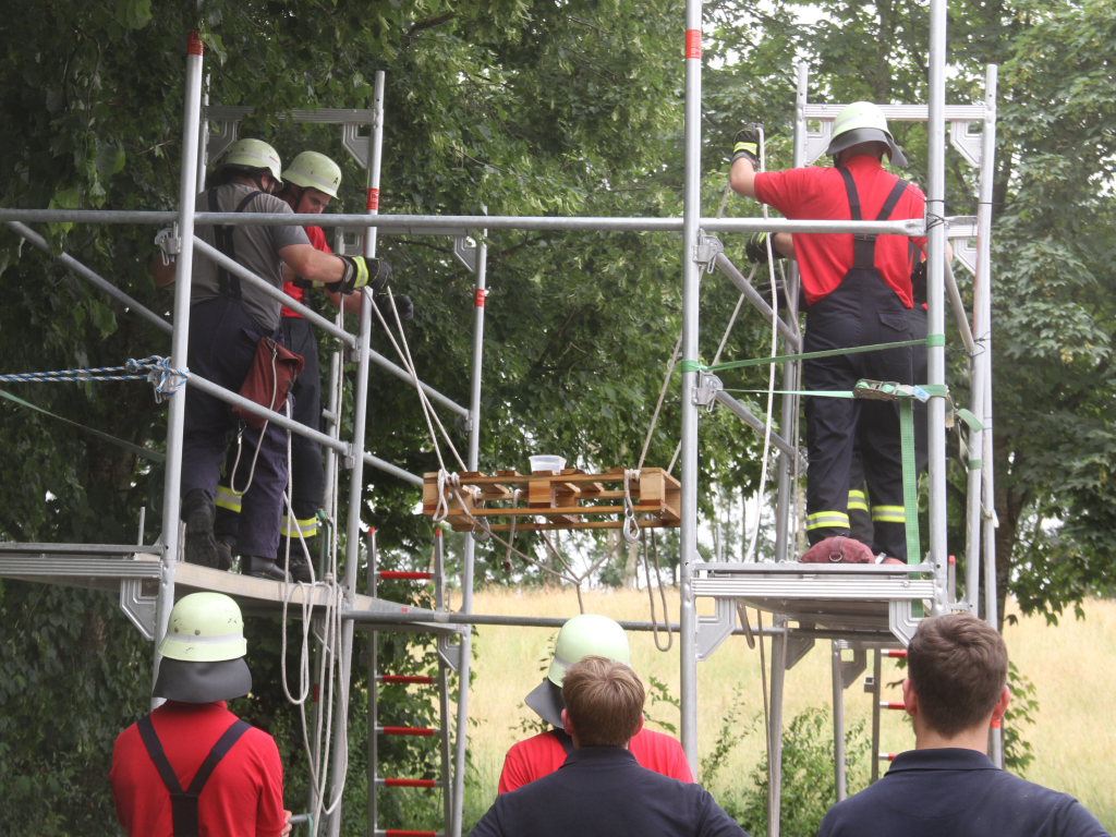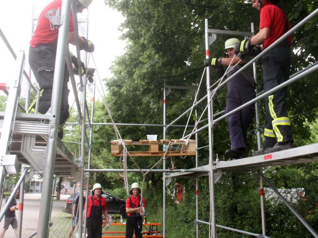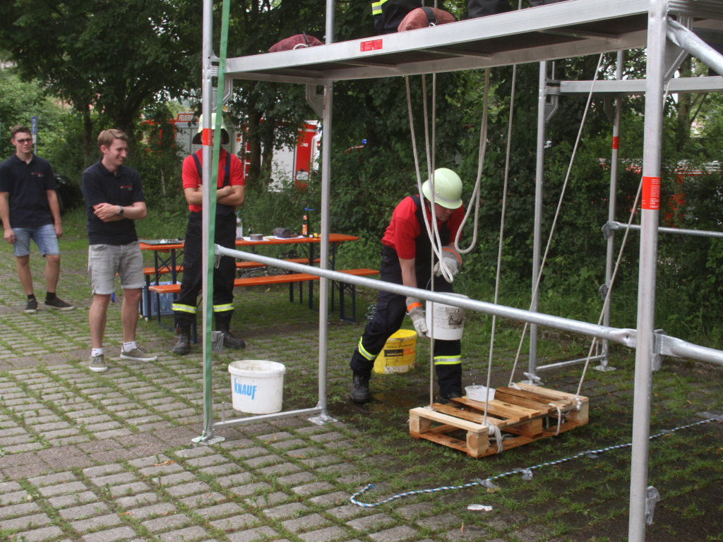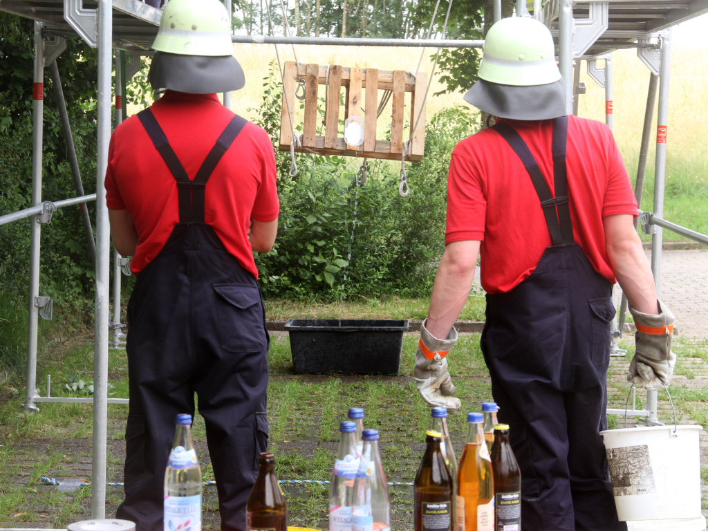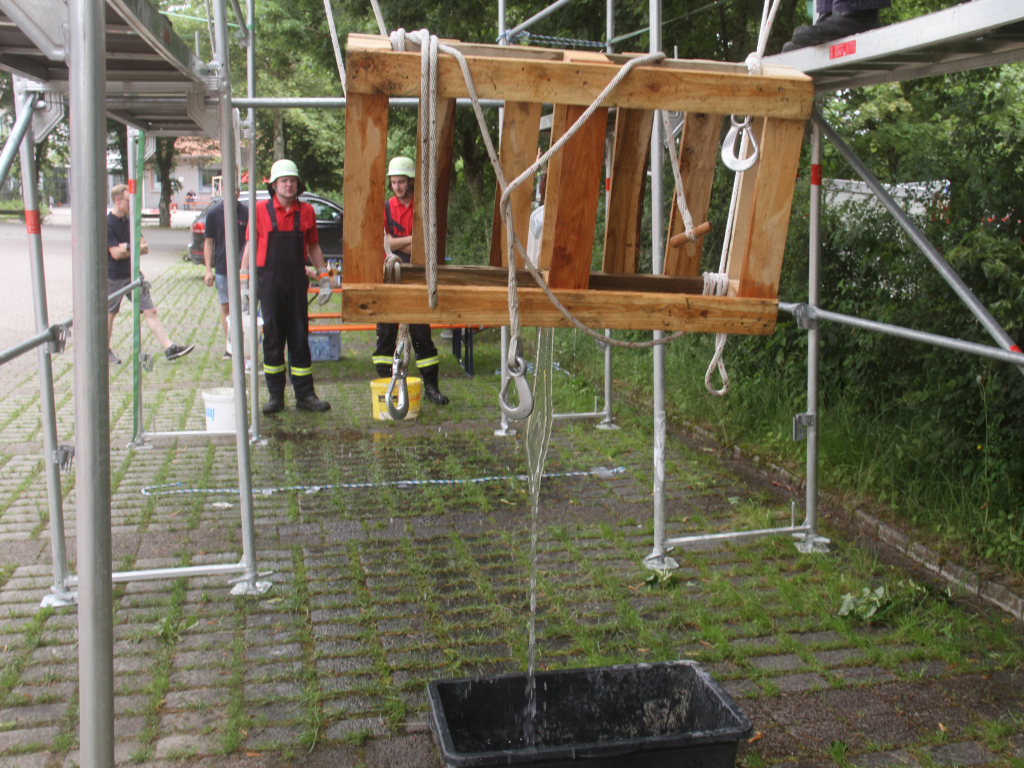 Ein wenig kamen sich die Sechser-Mannschaften der zwölf Teams an der Station auf dem Parkplatz bei der Turn- und Festhalle vor wie beim Marionettentheater. Denn vier von ihnen mussten eine Palette mit einem Wasserbehälter samt Inhalt auf einem Baugerüst von A nach B transportieren, um dort die Wassermenge möglichst verlustfrei in das Ziel-Behältnis abzukippen.