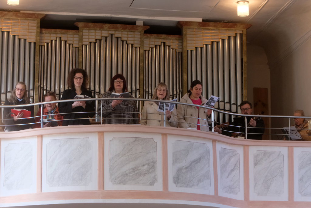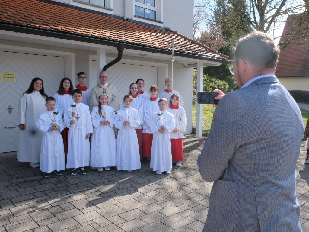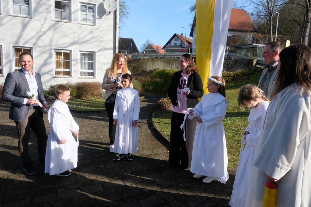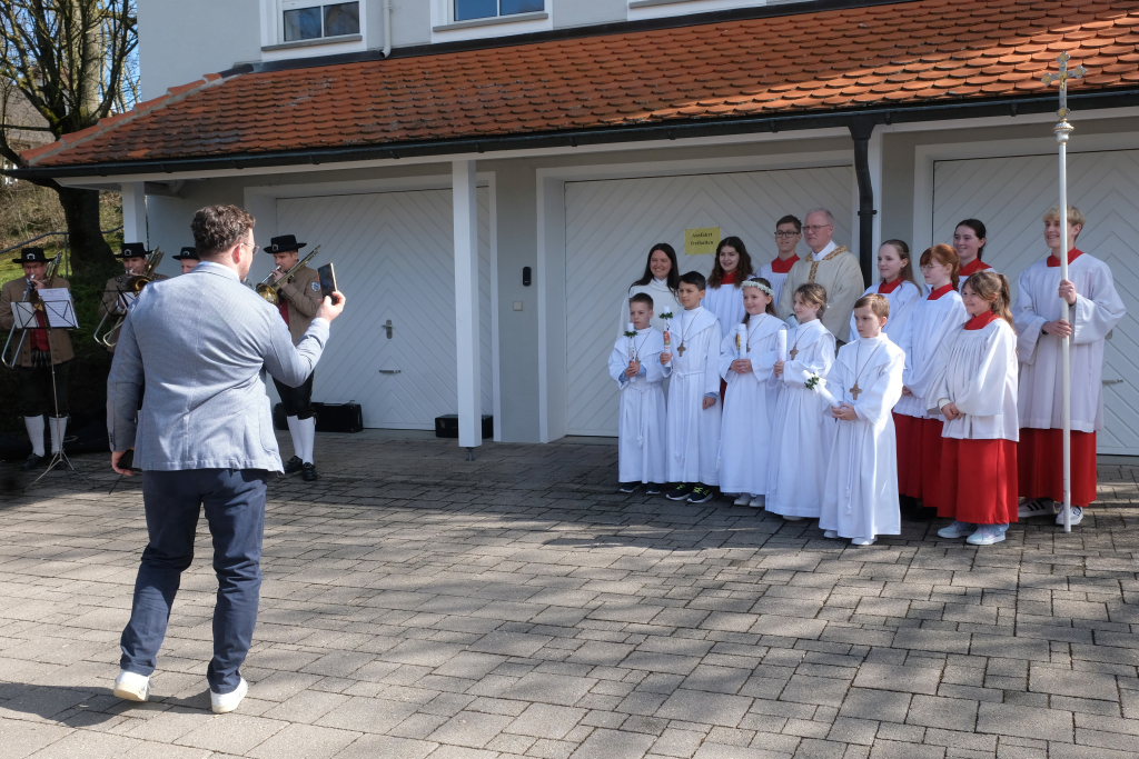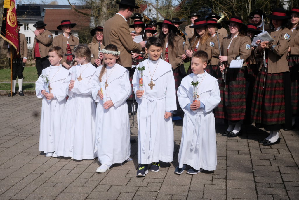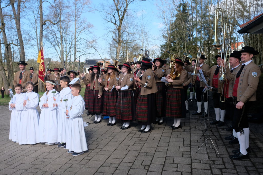 Eine Band unter der Leitung von Winfried Boneberger gab den gesungenen Liedern Lebendigkeit und Tiefe und Wolfgang Miller gab ihnen an der Orgel den feierlichen Rahmen. Nach dem Gottesdienst führte die Musikkapelle die Kinder zurück zum Gemeindehaus, wo sie für die Erstkommunionkinder und ihre Familien noch ein kleines Standkonzert gab.