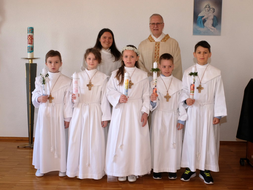 Seit vergangenem Herbst haben sich Kilian Angele, Sophie Berle, Julian Przeliorz, Anton Riedle und Lillith Trüstedt zusammen mit ihren Familien auf diesen Tag vorbereitet. Los ging es für sie bei einem gemeinsamen Treffen mit allen 88 Erstkommunionkindern der Seelsorgeeinheit Bad Wurzach im vergangenen November. Seitdem haben die fünf Dietmannser Kinder die großen kirchlichen Feste Weihnachten und Ostern miterlebt, sich mit ihren Eltern zu Gruppenstunden getroffen, eine Hostienbäckerei besucht, Rosenkränze geknüpft und einiges mehr gemeinsam erlebt. Zusammen mit ihren Familien haben sie sich beim „Weg der Versöhnung“ mit Versöhnung in der Familie beschäftigt und sich auf ihre Erstbeichte in Dietmanns mit Pfarrer Stefan Maier vorbereitet, der an ihrem großen Tag auch den Kommuniongottesdienst zelebrierte. Begleitet wurden dabei die Kinder und ihre Familien von Heidrun Neher und Claudia Tanner, die in Dietmanns alljährlich die Erstkommunionvorbereitung koordinieren und organisieren.
