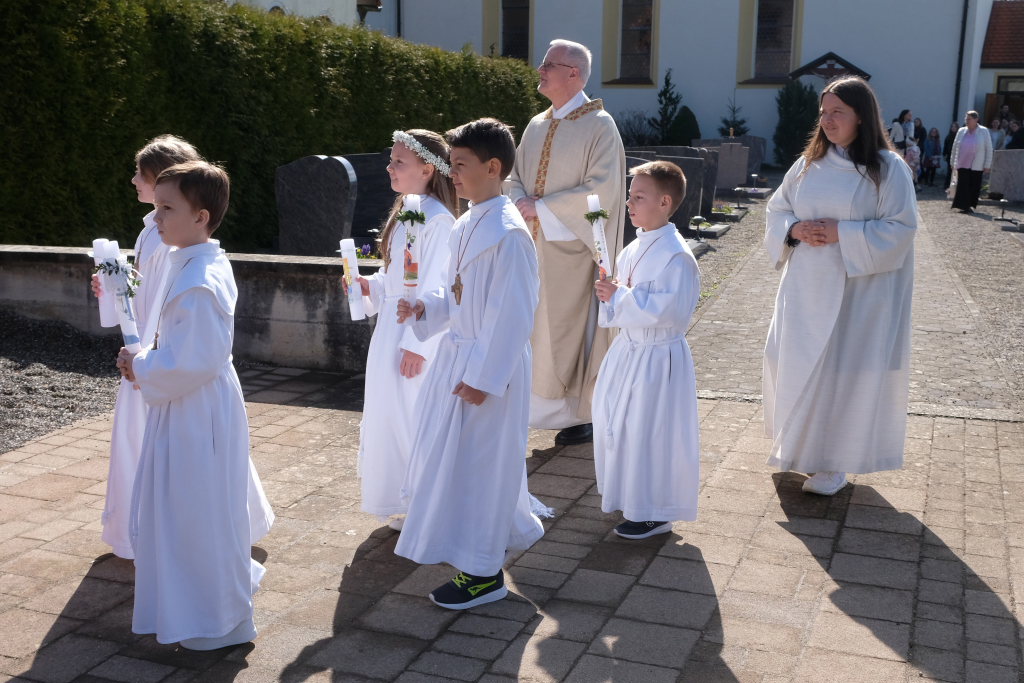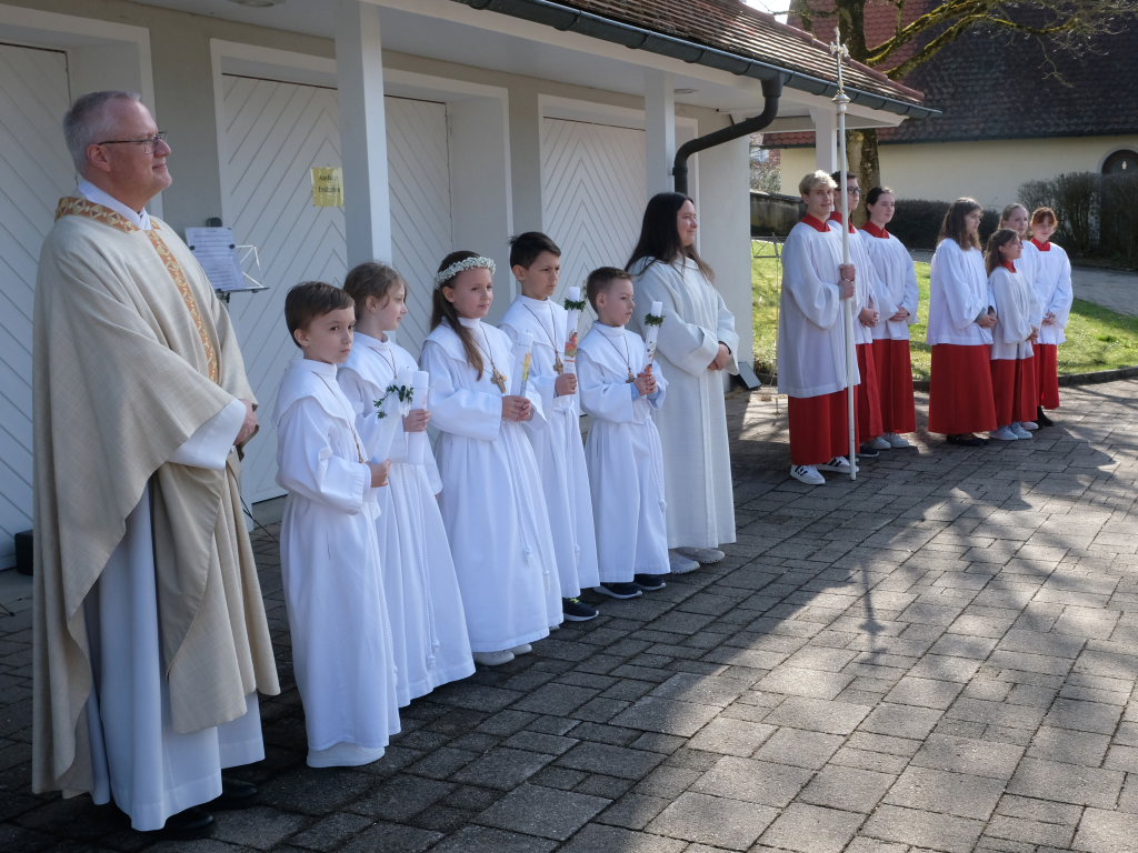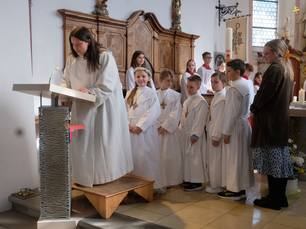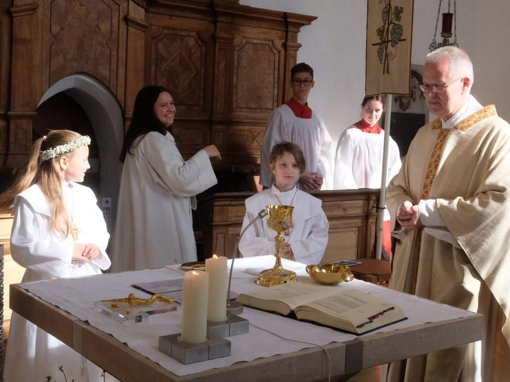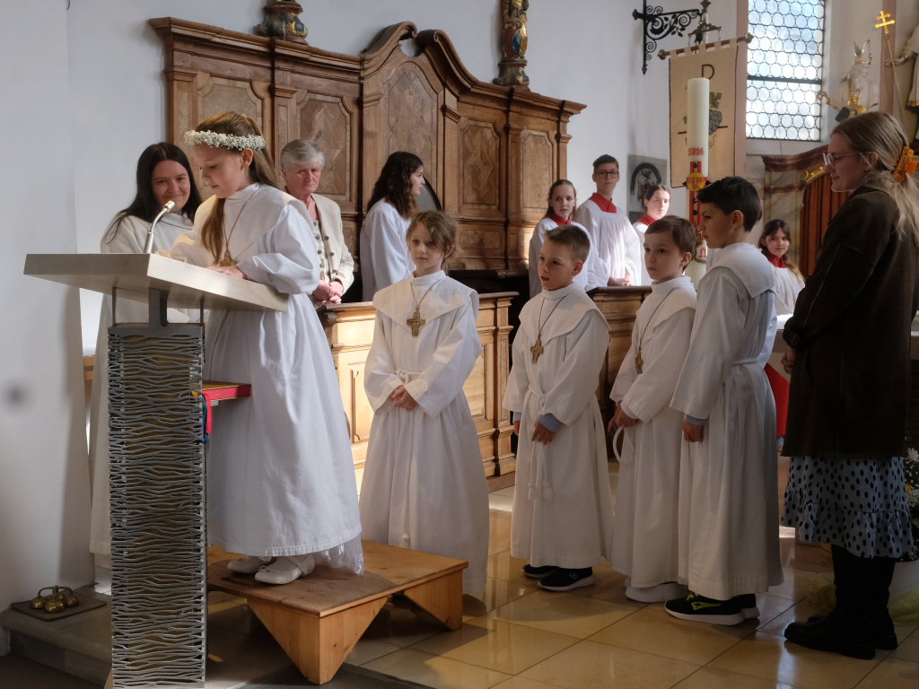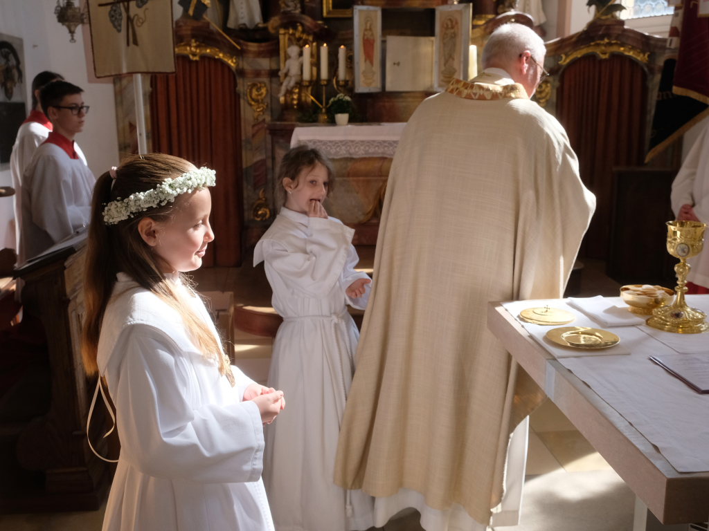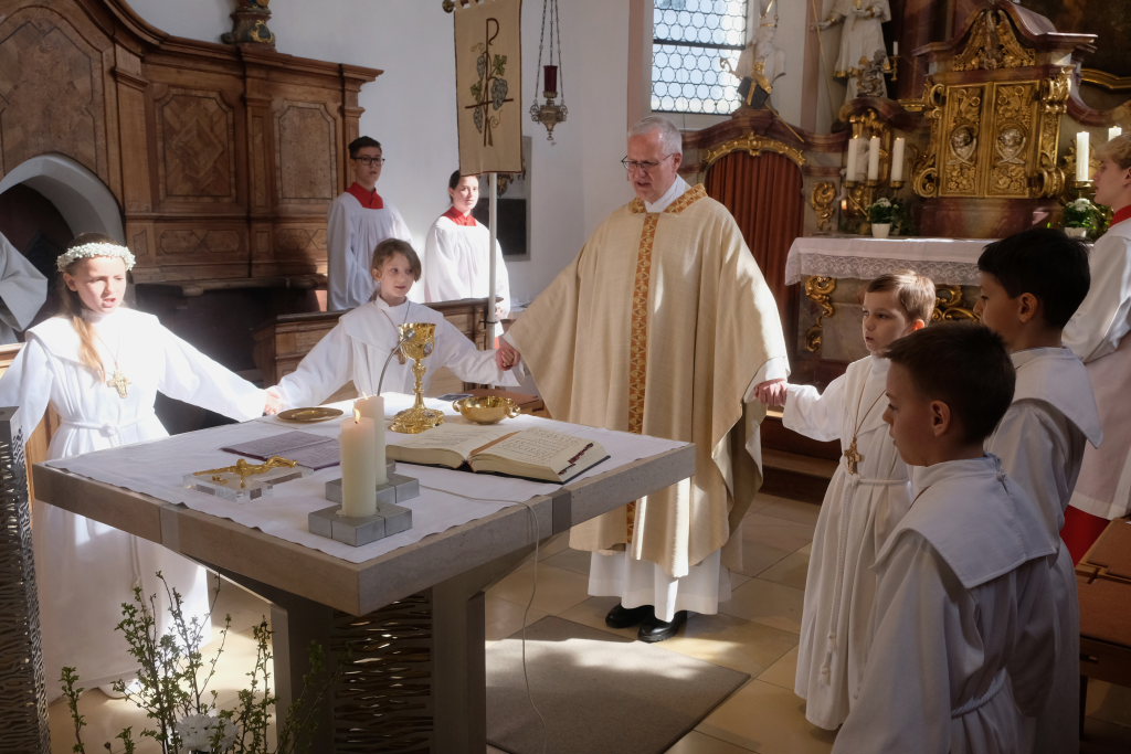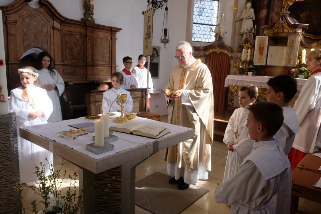 Zur Gabenbereitung versammelten sich die Kinder, die zuvor sich schon mit Fürbitten aktiv an der Gottesdienstgestaltung beteiligt hatten, daher gemeinsam mit dem Pfarrer im Halbkreis um den Altar, wo sie nach Sanctus, Friedensgruß und Agnus Dei gemeinsam zum ersten Mal aus den Händen von Pfarrer Stefan Maier die Hostie empfingen und damit zu vollwertigen Mitgliedern der Kirchengemeinde wurden.