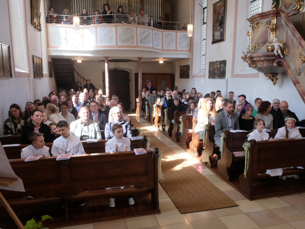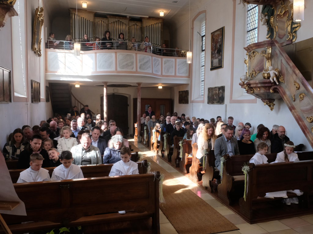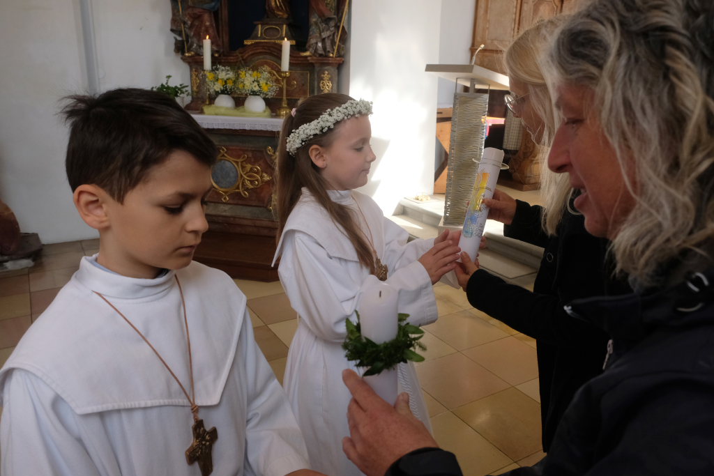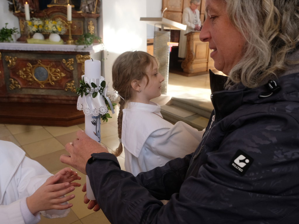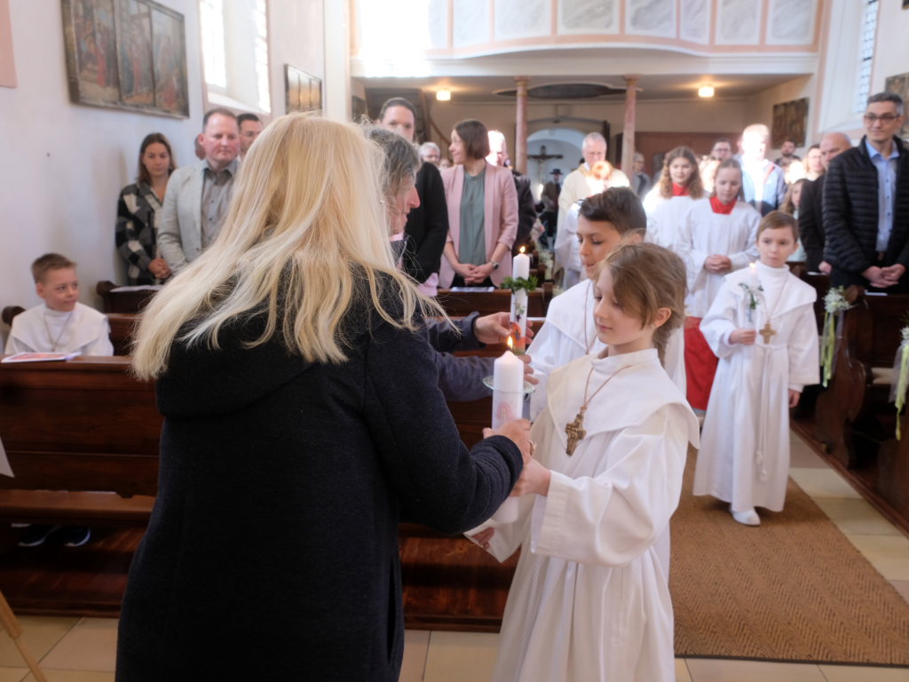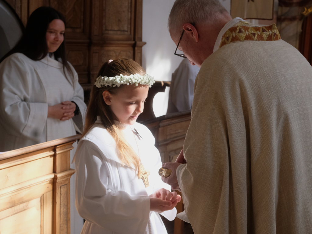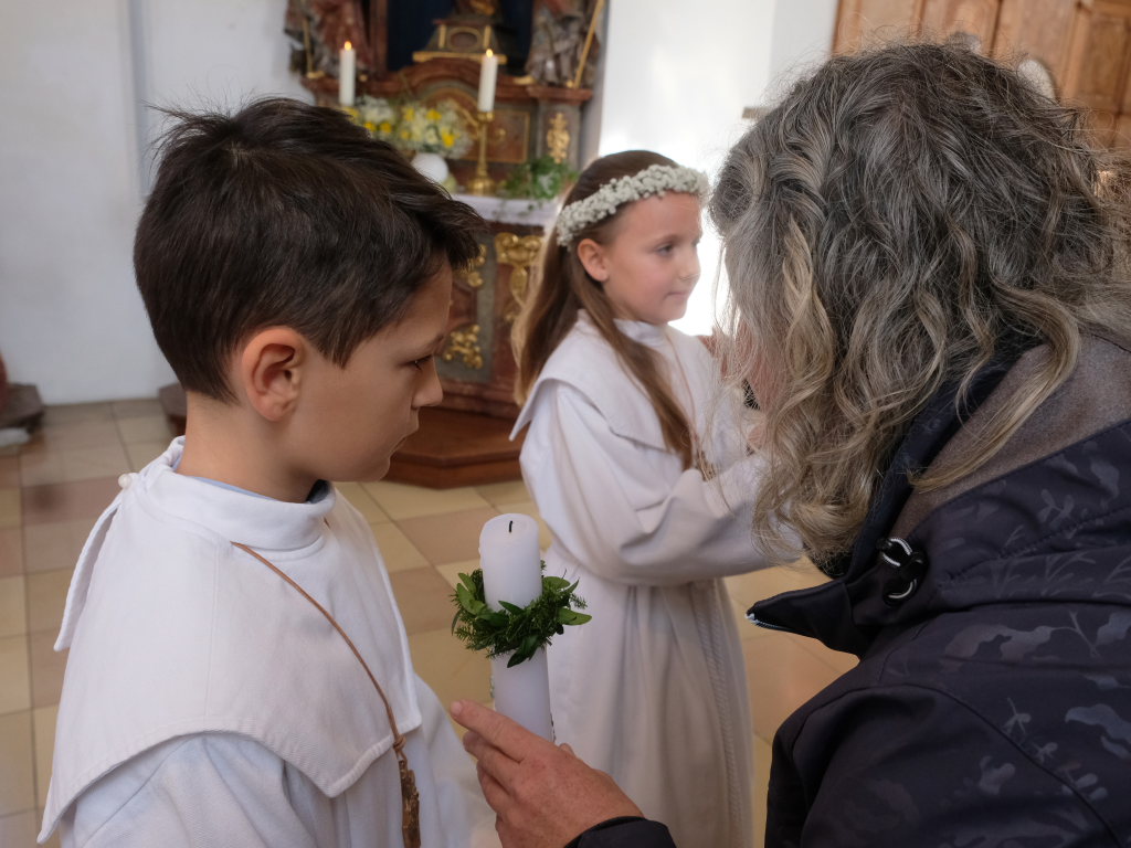 Zur Gabenbereitung versammelten sich die Kinder, die zuvor sich schon mit Fürbitten aktiv an der Gottesdienstgestaltung beteiligt hatten, daher gemeinsam mit dem Pfarrer im Halbkreis um den Altar, wo sie nach Sanctus, Friedensgruß und Agnus Dei gemeinsam zum ersten Mal aus den Händen von Pfarrer Stefan Maier die Hostie empfingen und damit zu vollwertigen Mitgliedern der Kirchengemeinde wurden.