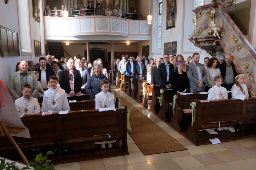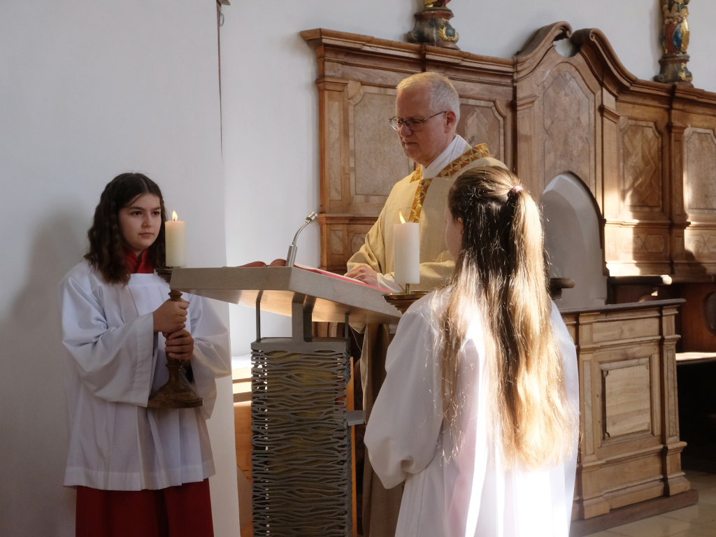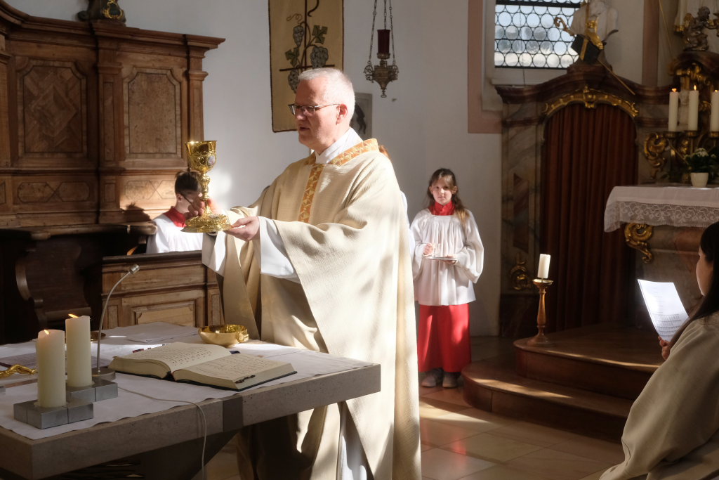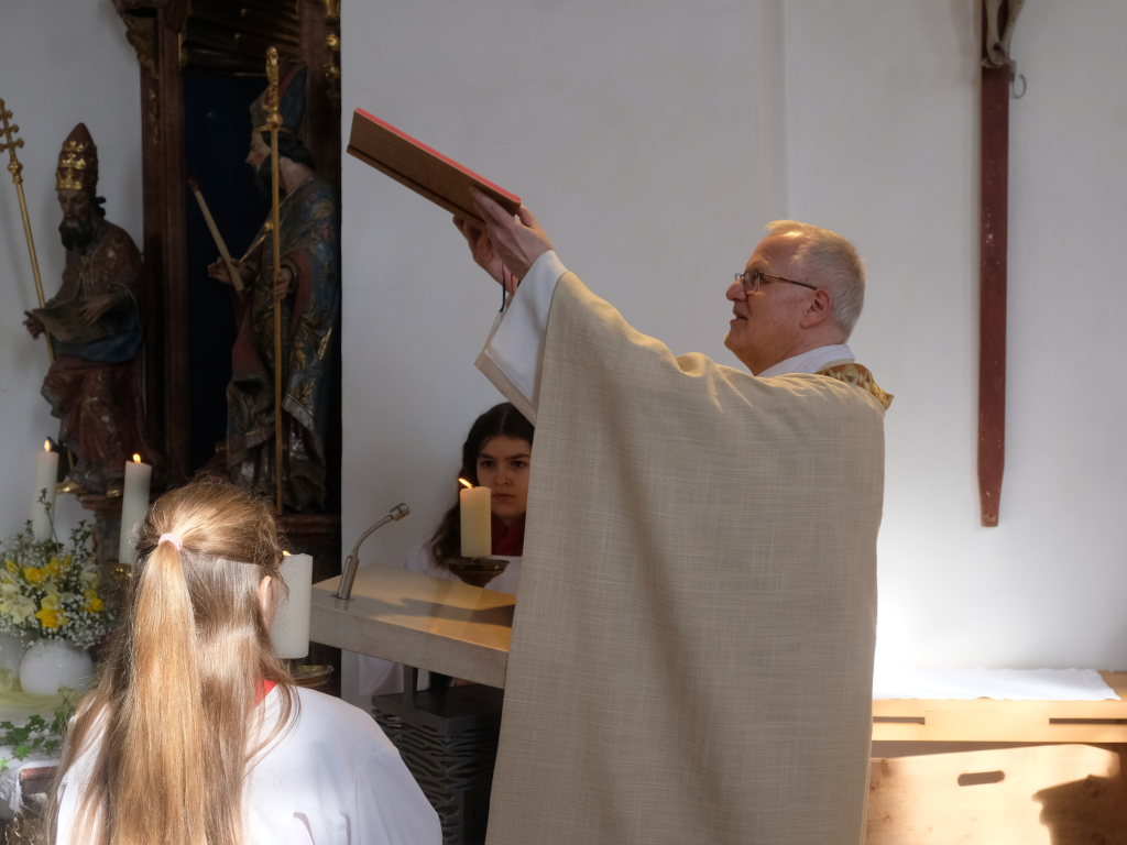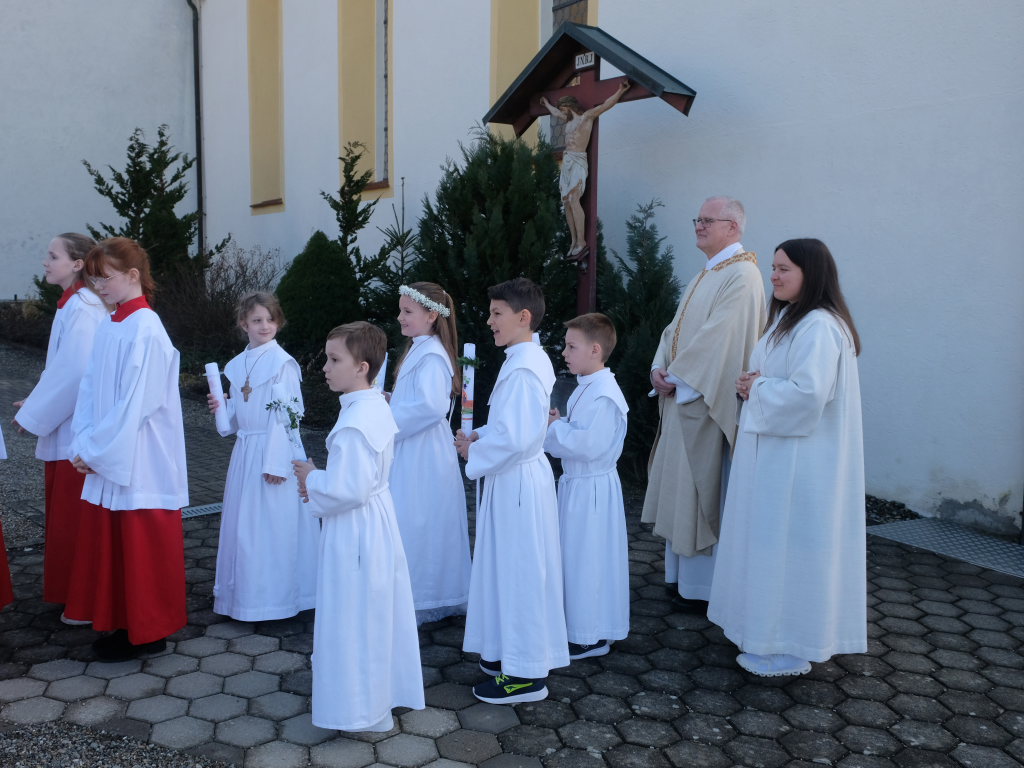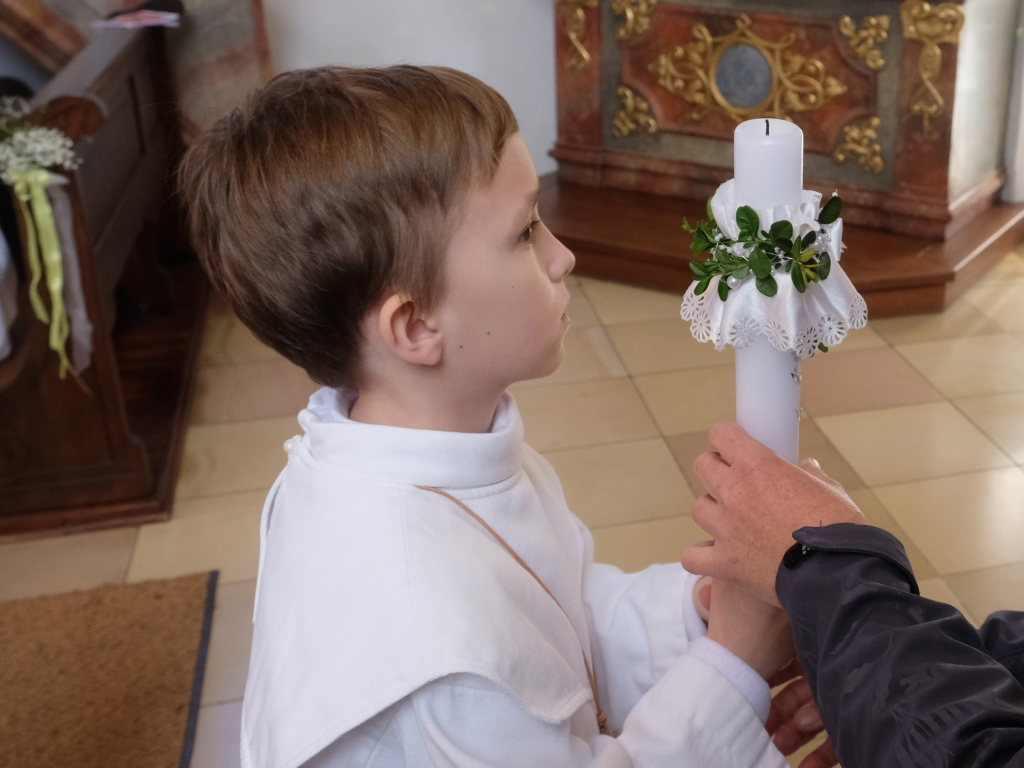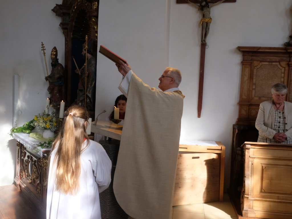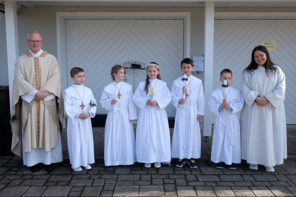 Zur Gabenbereitung versammelten sich die Kinder, die zuvor sich schon mit Fürbitten aktiv an der Gottesdienstgestaltung beteiligt hatten, daher gemeinsam mit dem Pfarrer im Halbkreis um den Altar, wo sie nach Sanctus, Friedensgruß und Agnus Dei gemeinsam zum ersten Mal aus den Händen von Pfarrer Stefan Maier die Hostie empfingen und damit zu vollwertigen Mitgliedern der Kirchengemeinde wurden.
