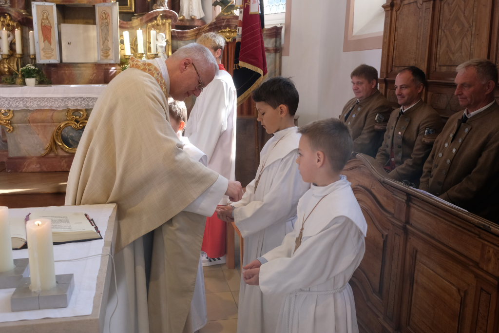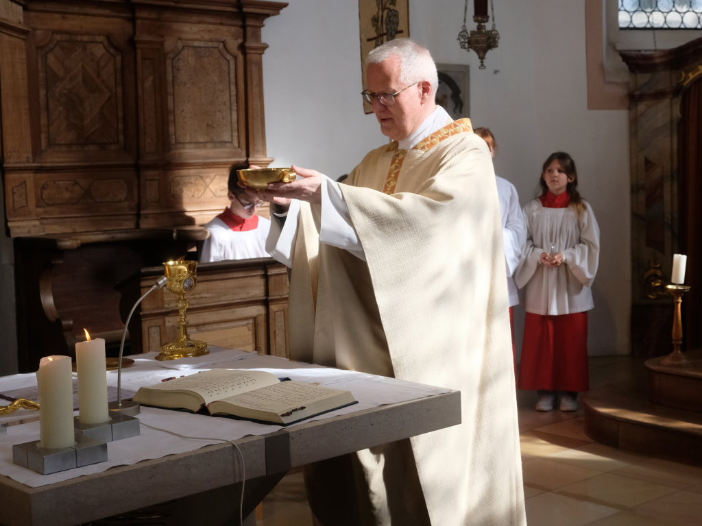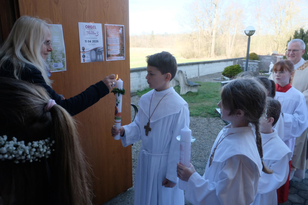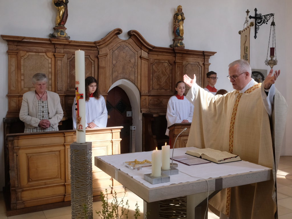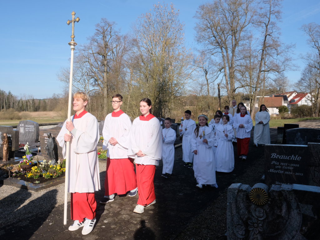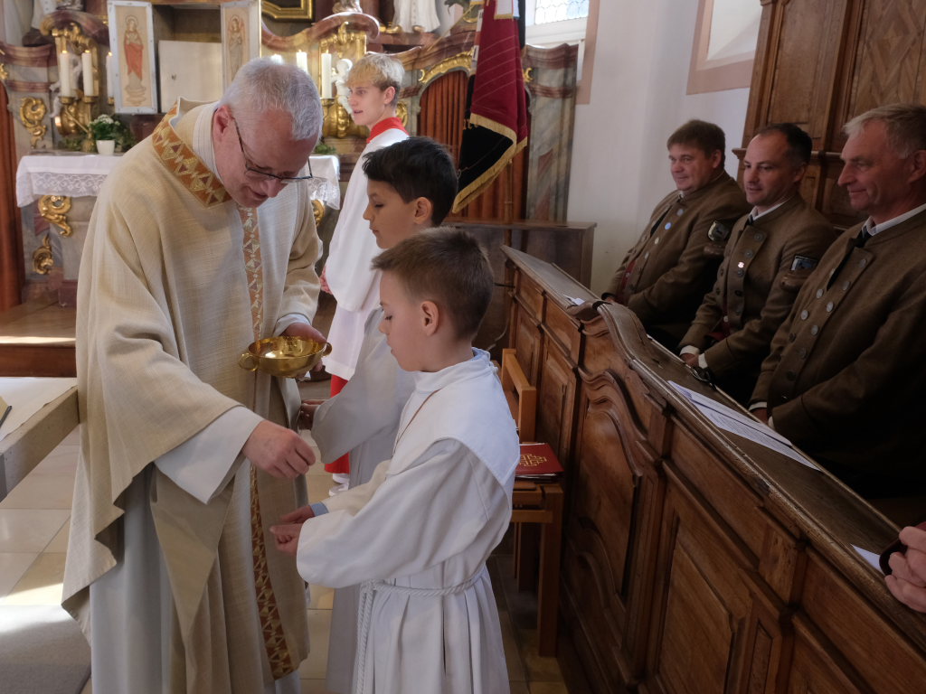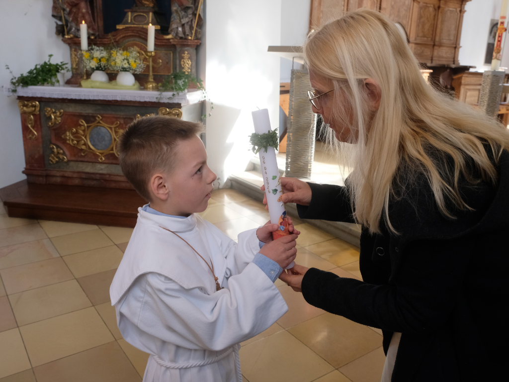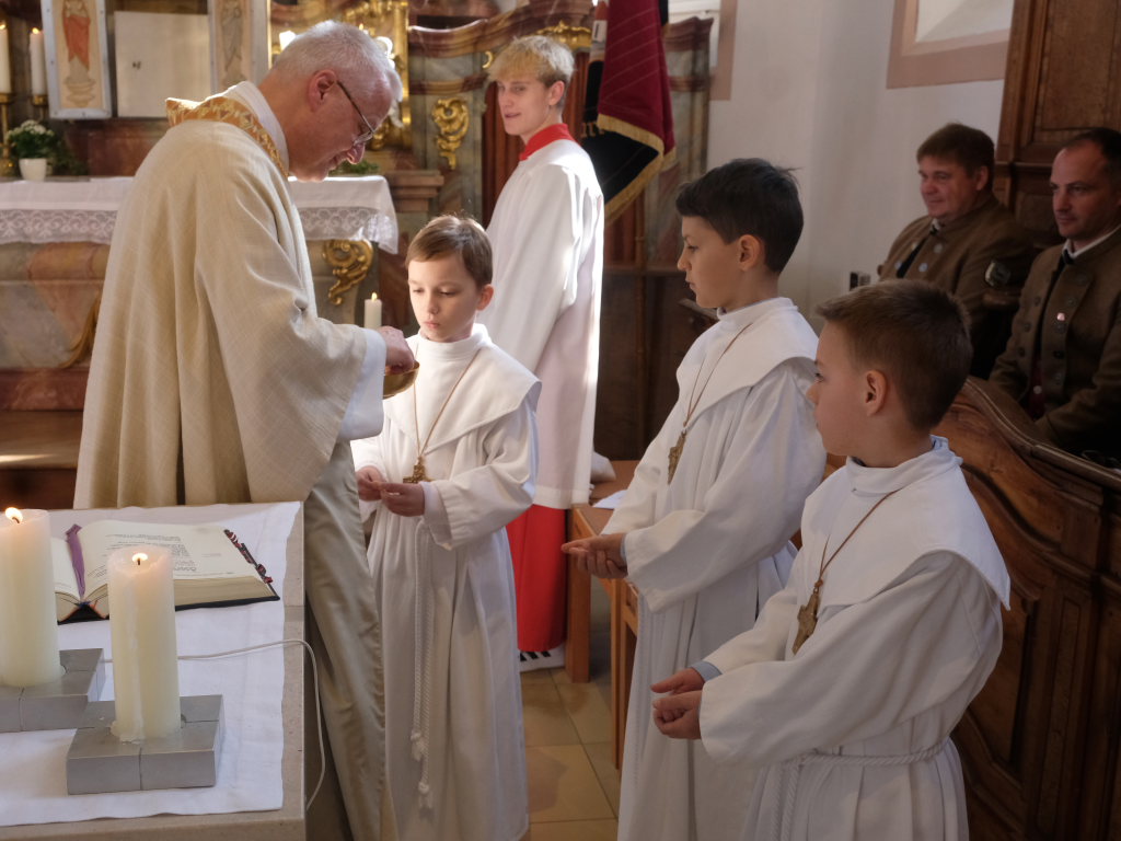 Zur Gabenbereitung versammelten sich die Kinder, die zuvor sich schon mit Fürbitten aktiv an der Gottesdienstgestaltung beteiligt hatten, daher gemeinsam mit dem Pfarrer im Halbkreis um den Altar, wo sie nach Sanctus, Friedensgruß und Agnus Dei gemeinsam zum ersten Mal aus den Händen von Pfarrer Stefan Maier die Hostie empfingen und damit zu vollwertigen Mitgliedern der Kirchengemeinde wurden.