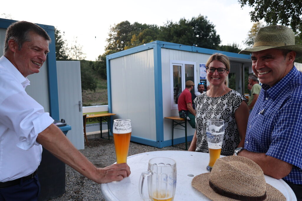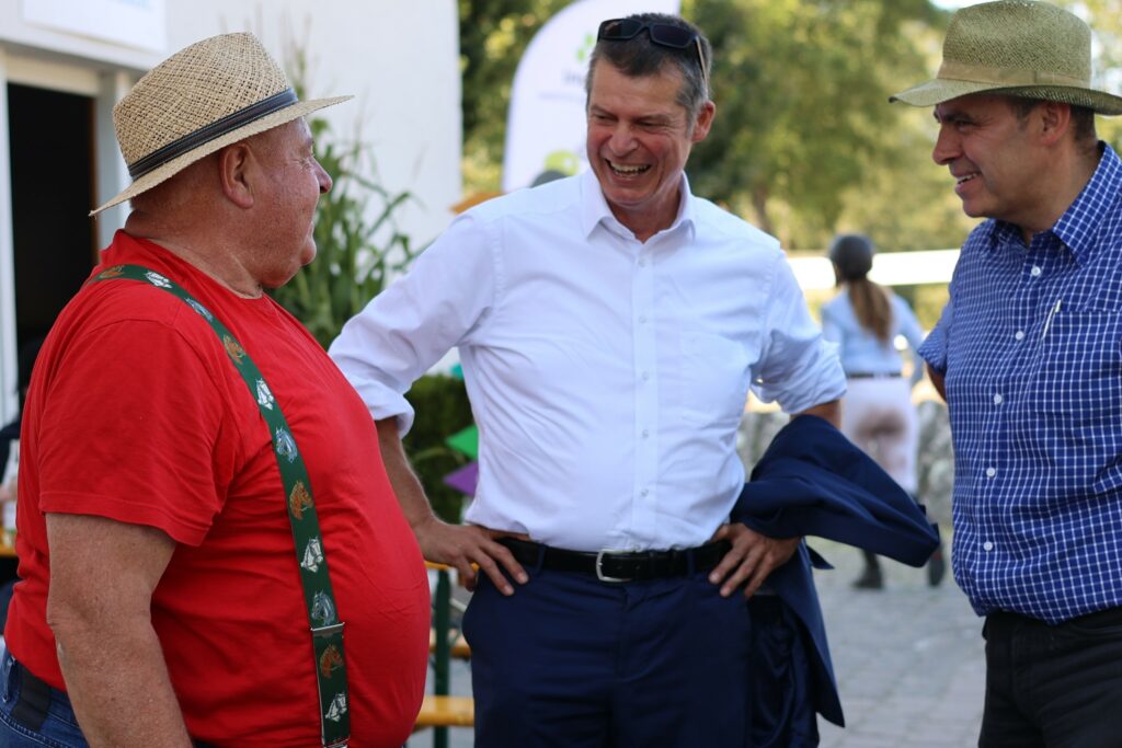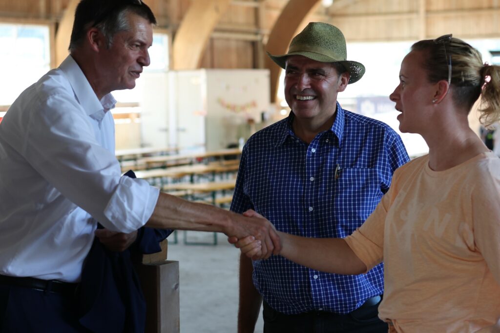 Hauerz-Urgestein und Gründungsmitglied des Reitvereins Anton Mang (links) im Gespräch mit Josef Dobler jun. (rechts) und Axel Müller MdB.