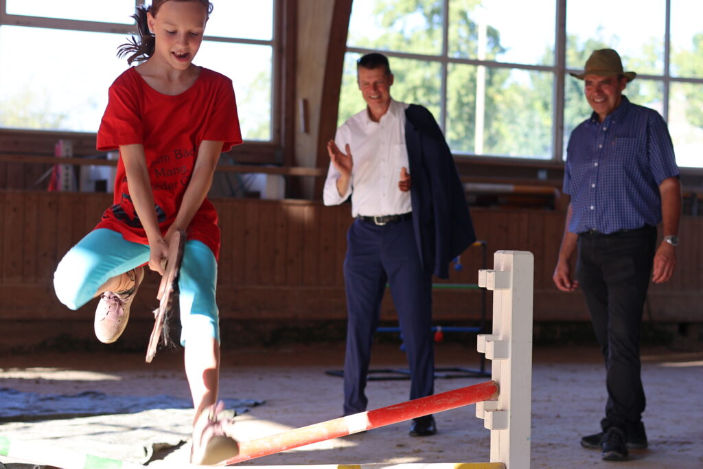 Emily Schöllhorn, Enkelin von Anton Mang, überwindet ein Hindernis mit dem Steckenpferd.