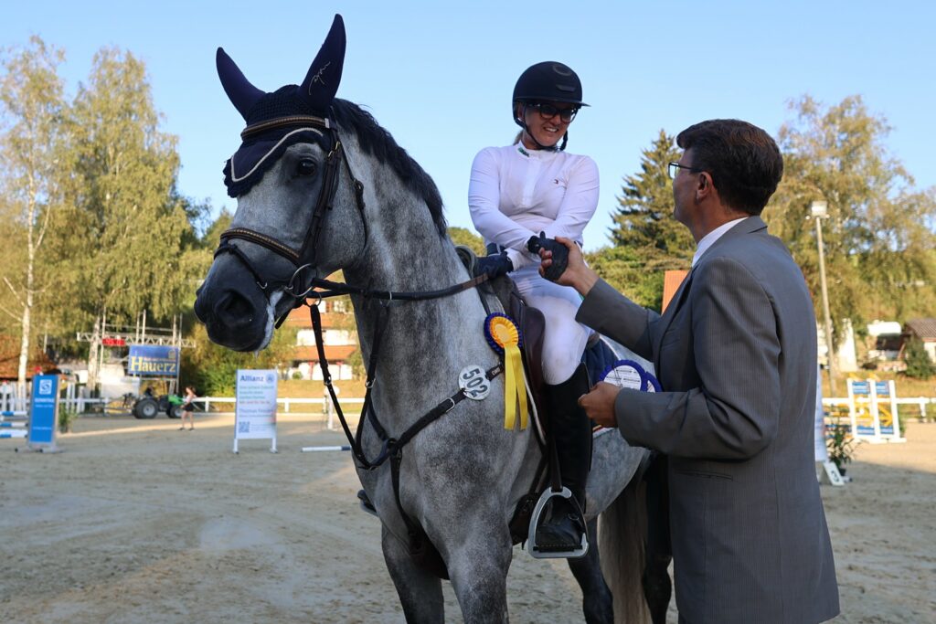 Siegerehrung der Springpferdeprüfung Klasse L: Steffi Paul wird von Richter Holger Martin beglückwünscht.