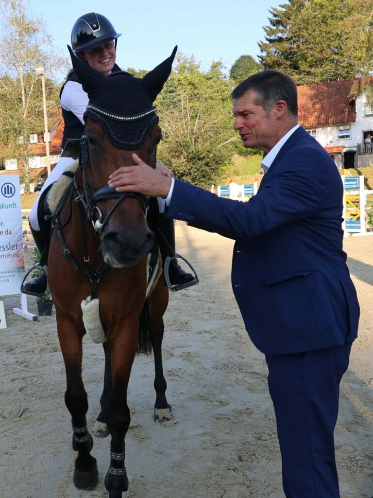 Der Abgeordnete gratuliert Pferd und Reiterin.