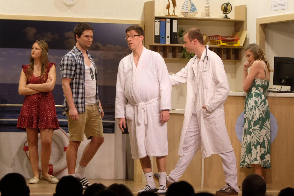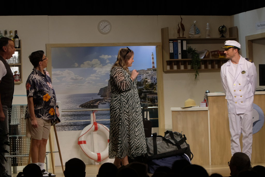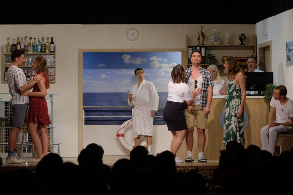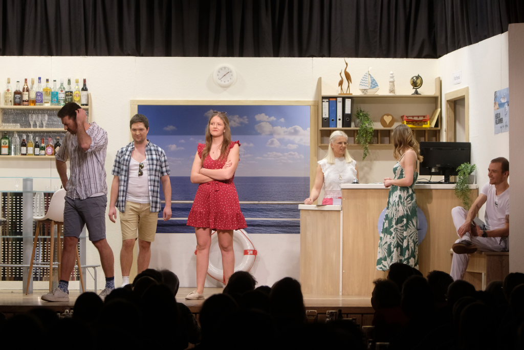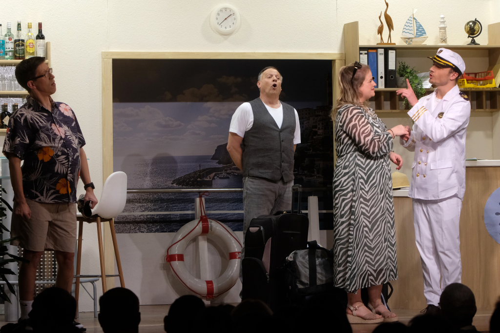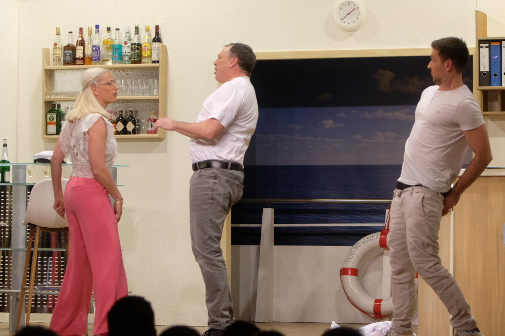 Traditionell begrüßt der Spielleiter, bevor sich der Bühnenvorhang vor einer Aufführung das erste Mal hebt, die Ehrengäste und Gruppierungen. Neben einigen Ehrenmitgliedern des Musikvereines konnte Tapper in diesem Jahr auch Bürgermeisterin Alexandra Scherer mit ihrem Gatten zur Premiere begrüßen. Mit recht großen Abordnungen besuchten unter anderem der Kirchenchor Arnach und die Fußballabteilung des SV Arnach die Premiere. Matthias Tapper wollte vom Publikum wissen, wer denn schon einmal auf einer Kreuzfahrt dabei war, denn immerhin befördern die Kreuzfahrtschiffe jährlich 30 Millionen Passagiere. Nachdem sich nur sehr wenige gemeldet hatten, konnte er guten Gewissens das Ergebnis einer englischen Umfrage bekanntgeben. Laut dieser Erhebung macht jeder fünfte Passagier auf einer Kreuzfahrt einen Seitensprung, obwohl bei 80 % der Fahrten der Partner mit an Bord ist.