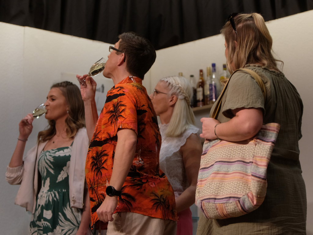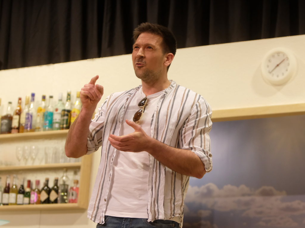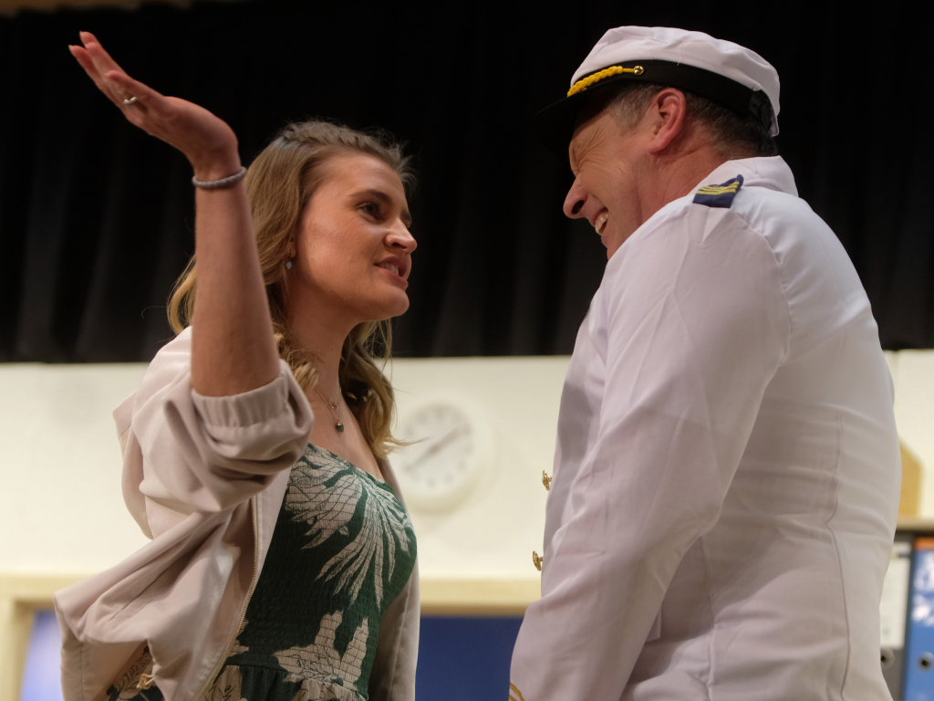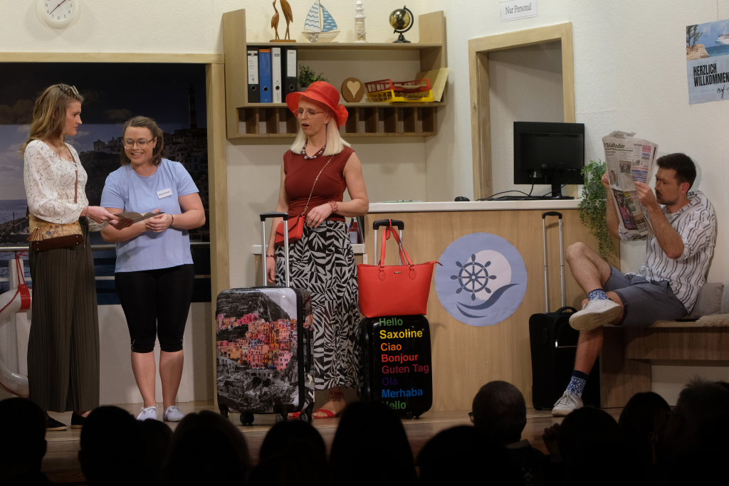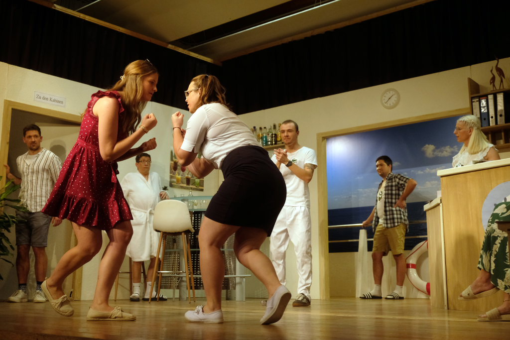 Traditionell begrüßt der Spielleiter, bevor sich der Bühnenvorhang vor einer Aufführung das erste Mal hebt, die Ehrengäste und Gruppierungen. Neben einigen Ehrenmitgliedern des Musikvereines konnte Tapper in diesem Jahr auch Bürgermeisterin Alexandra Scherer mit ihrem Gatten zur Premiere begrüßen. Mit recht großen Abordnungen besuchten unter anderem der Kirchenchor Arnach und die Fußballabteilung des SV Arnach die Premiere. Matthias Tapper wollte vom Publikum wissen, wer denn schon einmal auf einer Kreuzfahrt dabei war, denn immerhin befördern die Kreuzfahrtschiffe jährlich 30 Millionen Passagiere. Nachdem sich nur sehr wenige gemeldet hatten, konnte er guten Gewissens das Ergebnis einer englischen Umfrage bekanntgeben. Laut dieser Erhebung macht jeder fünfte Passagier auf einer Kreuzfahrt einen Seitensprung, obwohl bei 80 % der Fahrten der Partner mit an Bord ist.