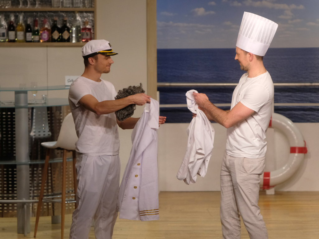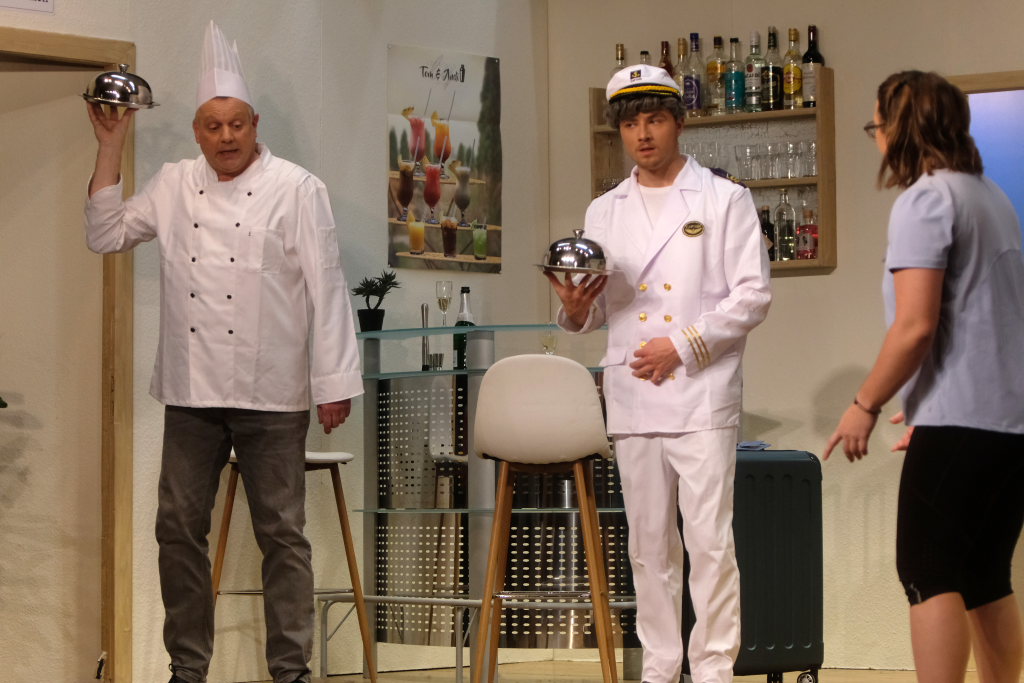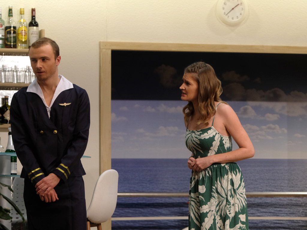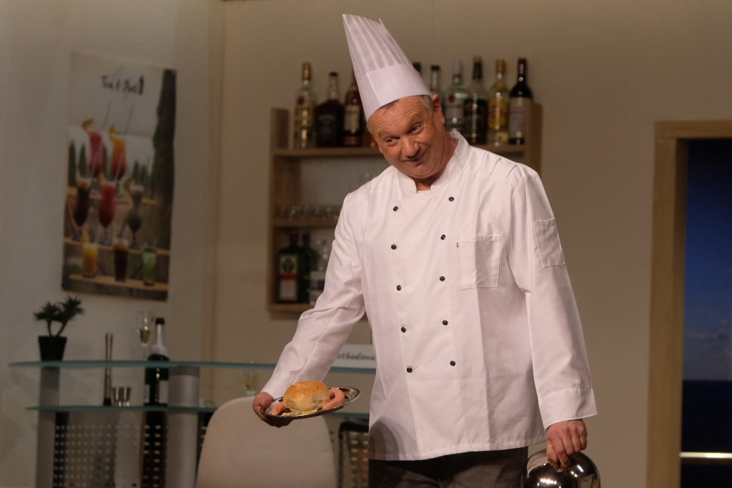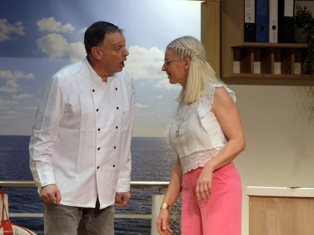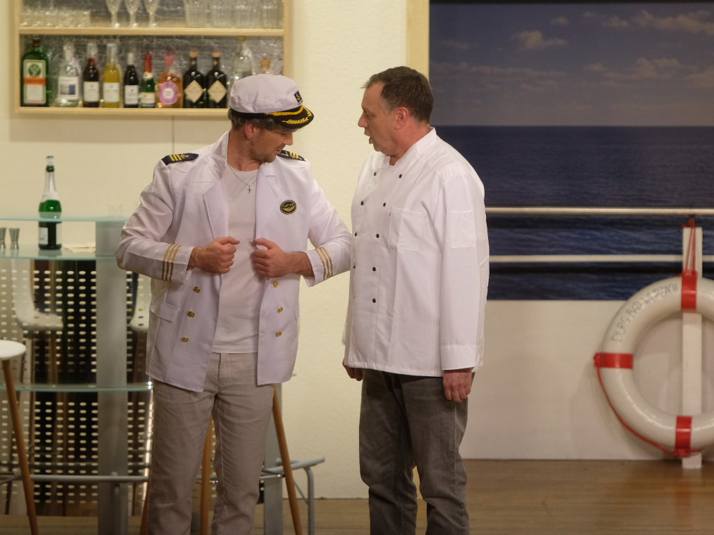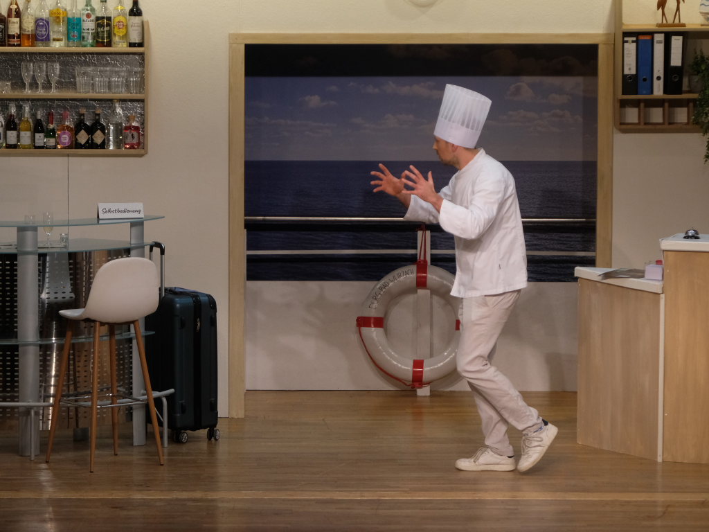 Auf dem Kreuzfahrtschiff „Ahoi“ brodelt es nicht nur in den Kochtöpfen von Schiffskoch Roland Winkler. Gebhard Baumann muss mit ihm gleich mehrere Positionen auf dem Schiff ausfüllen, denn er kämpft mit akutem Fachkräftemangel. Das Personal muss mit mehr Jobs gleichzeitig jonglieren, wie Sonja Herrlich, die von Petra Gut sehr patent dargestellte Stewardess Tabletts tragen muss, ist sie doch ebenfalls in das Multitasking involviert.