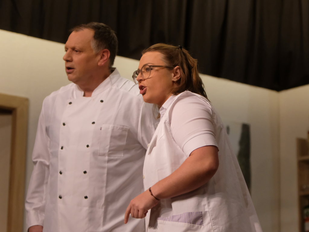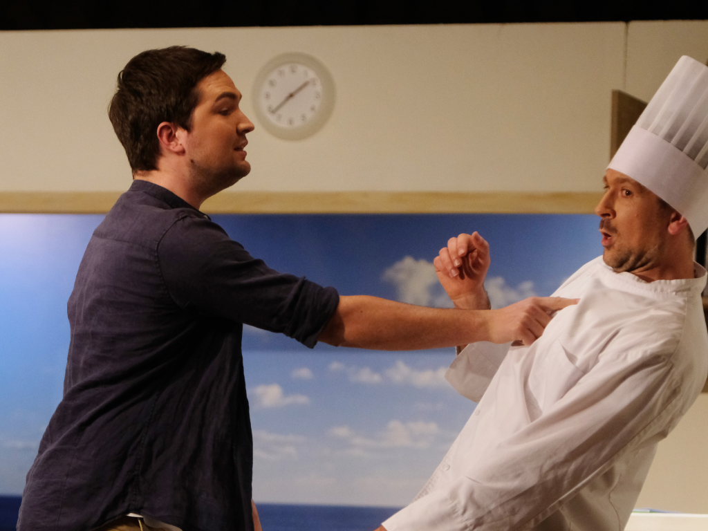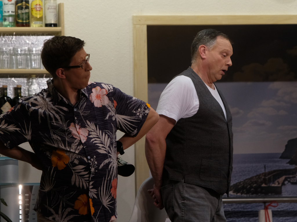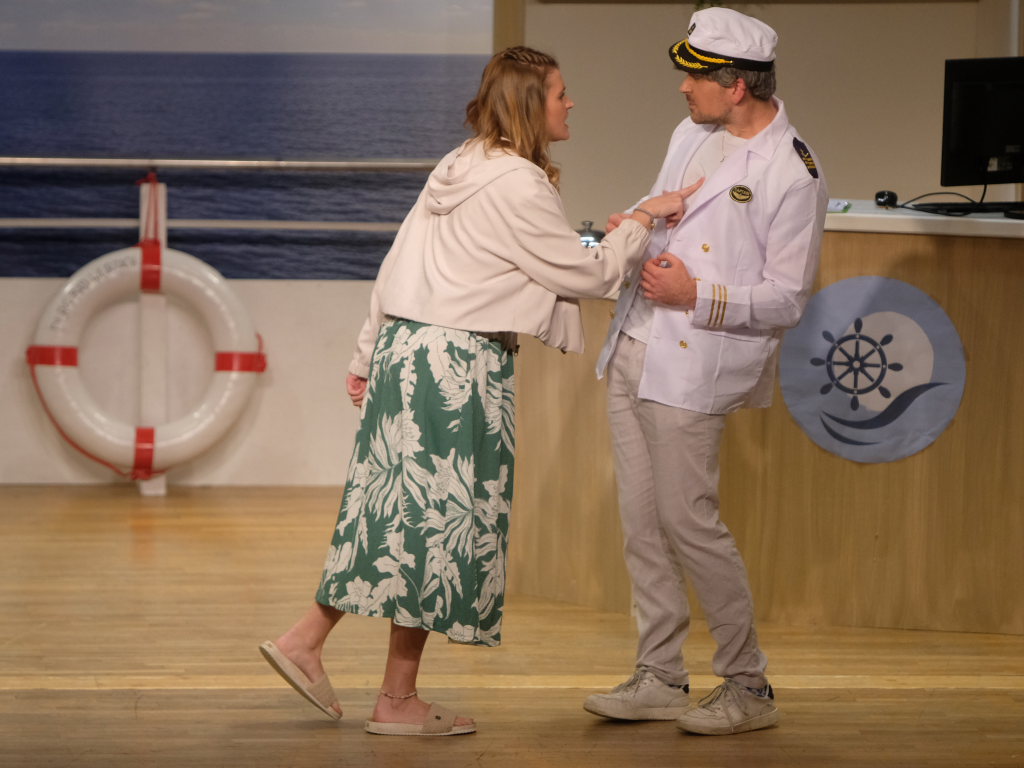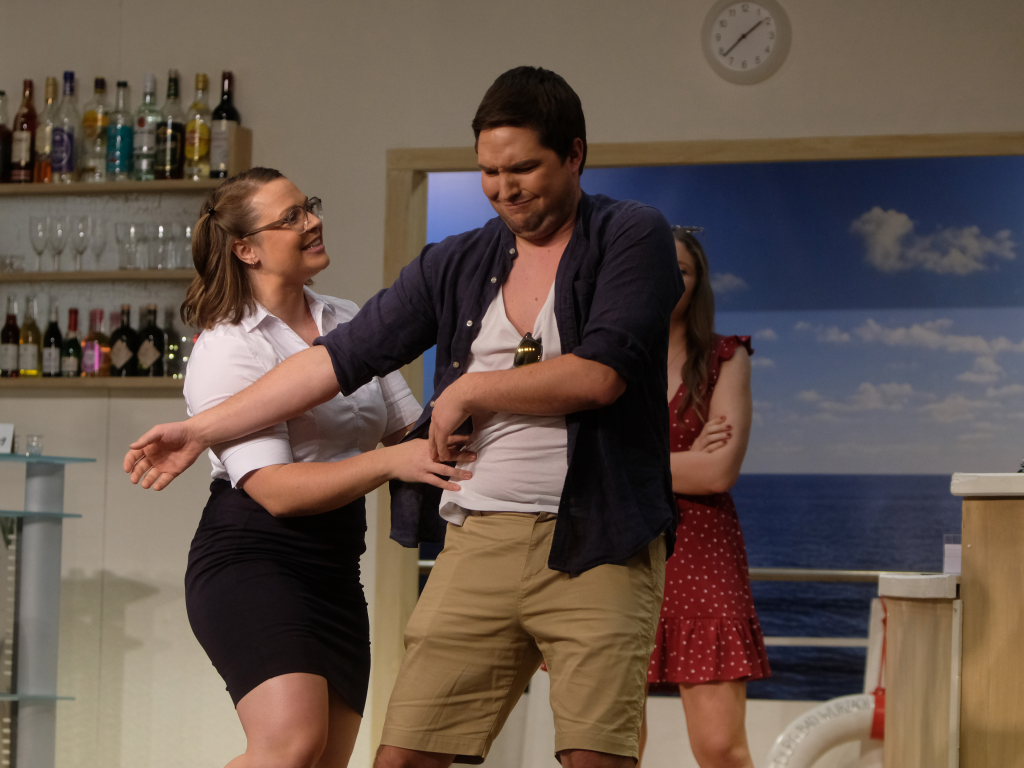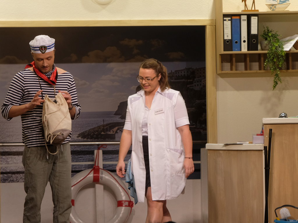 Auf dem Kreuzfahrtschiff „Ahoi“ brodelt es nicht nur in den Kochtöpfen von Schiffskoch Roland Winkler. Gebhard Baumann muss mit ihm gleich mehrere Positionen auf dem Schiff ausfüllen, denn er kämpft mit akutem Fachkräftemangel. Das Personal muss mit mehr Jobs gleichzeitig jonglieren, wie Sonja Herrlich, die von Petra Gut sehr patent dargestellte Stewardess Tabletts tragen muss, ist sie doch ebenfalls in das Multitasking involviert.
