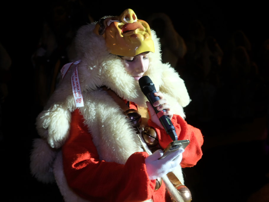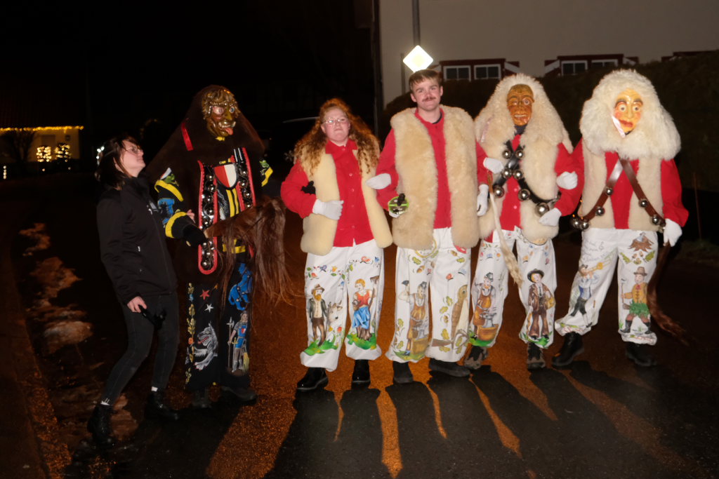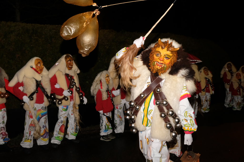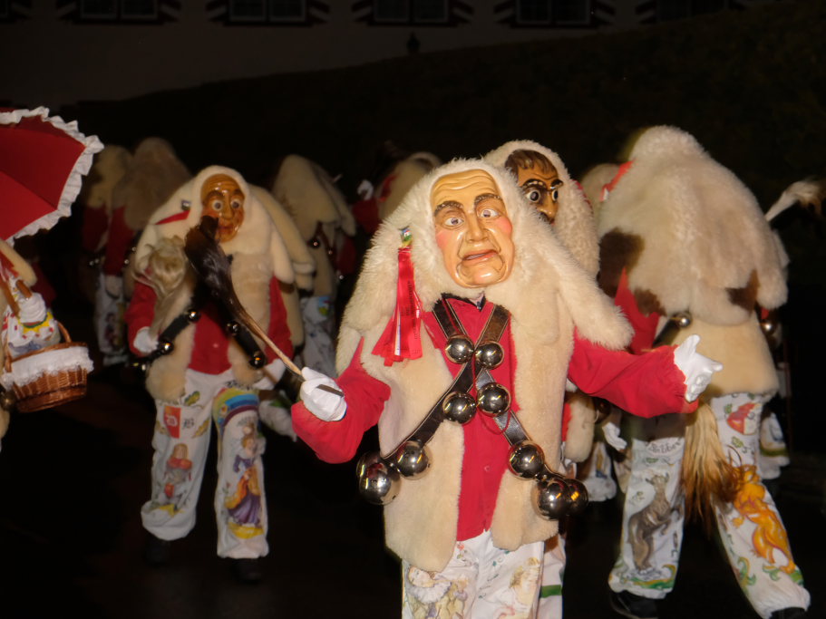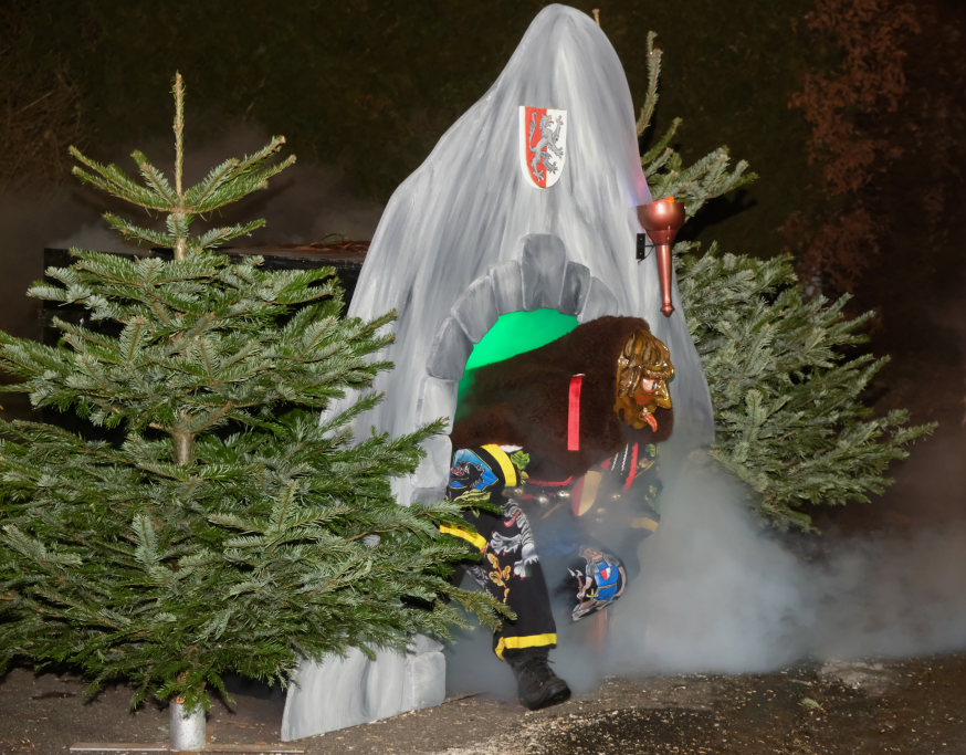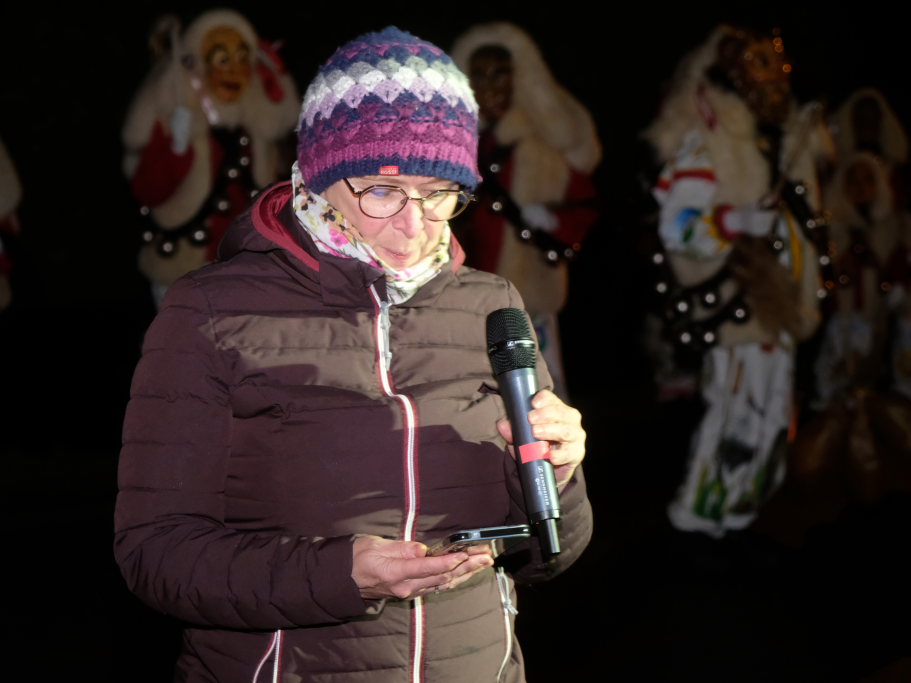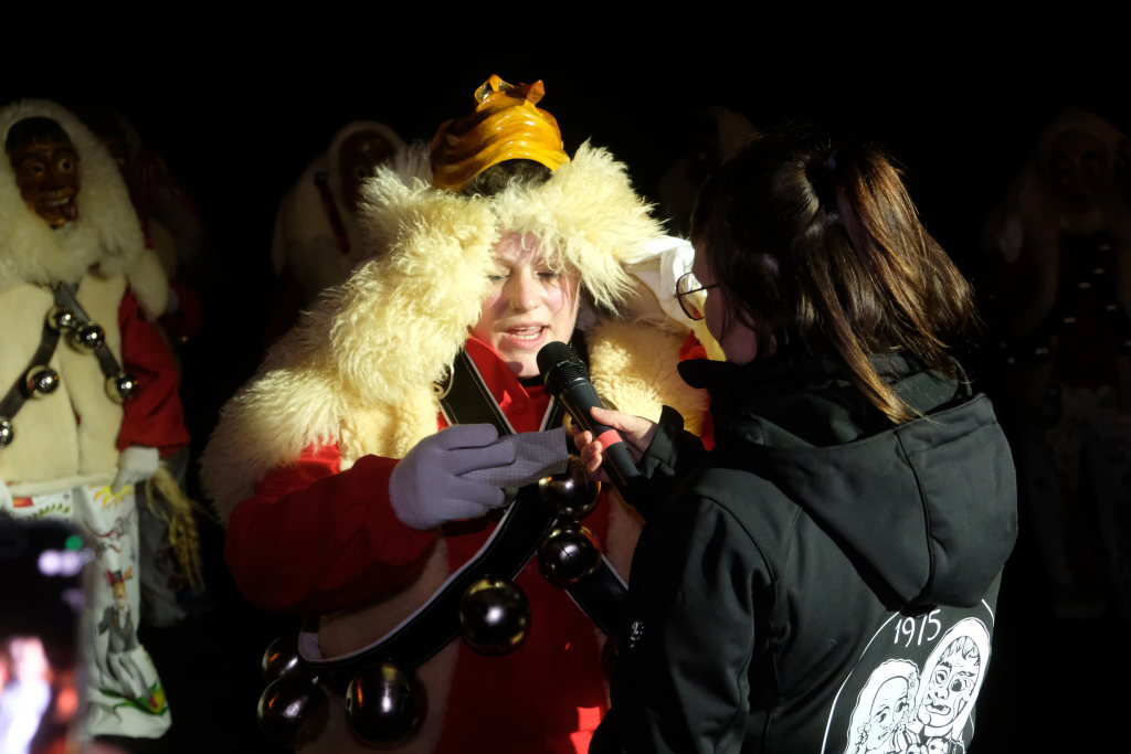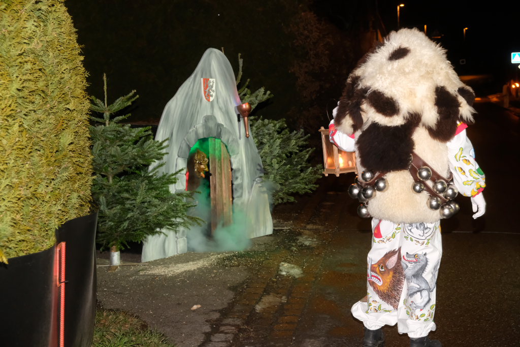 Von – künstlichem – Nebel umwabert stieg der Schwarznarr „Wolfsleib“, von „Wago“ geweckt, der mit seiner Laterne als Erster die Szene betrat, aus seiner Höhle gegenüber des Rathauses. Gemeinsam machten sie sich auf die Suche nach den anderen Narren, die dann von allen Seiten zu ihrem närrischen Treiben zum Haidgauer Rathausplatz strömten. Dort wartete bereits die Schalmeiengruppe D`Hoigamer Schtroßahup`r, die musikalisch – u. a. mit dem Haidgauer Narrenmarsch – die Fasnet miteinläutete. Mit dem alljährlichen von Zunftmeister Daniel Wassner vom Bühnenlädele des Rathauses herabgesprochenen Zaubersatz: „Etz, Ihr Narra, springet zua, und hollet`n raus den Schwanz von dr Kuh!“ wurden die 327 Tage gemeinsam mit den Masken und Häsern in den Truhen ruhenden namensgebenden Accessoires zum kräftigen Auslüften hervorgeholt.