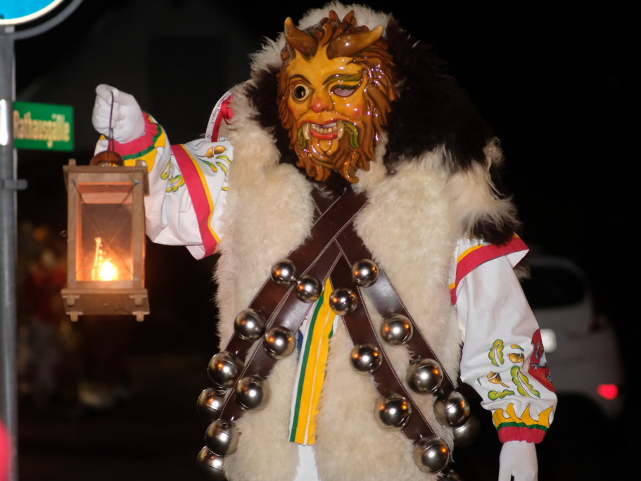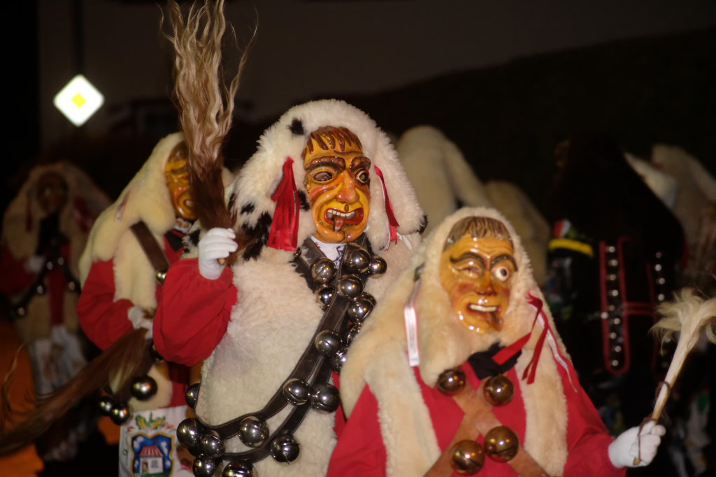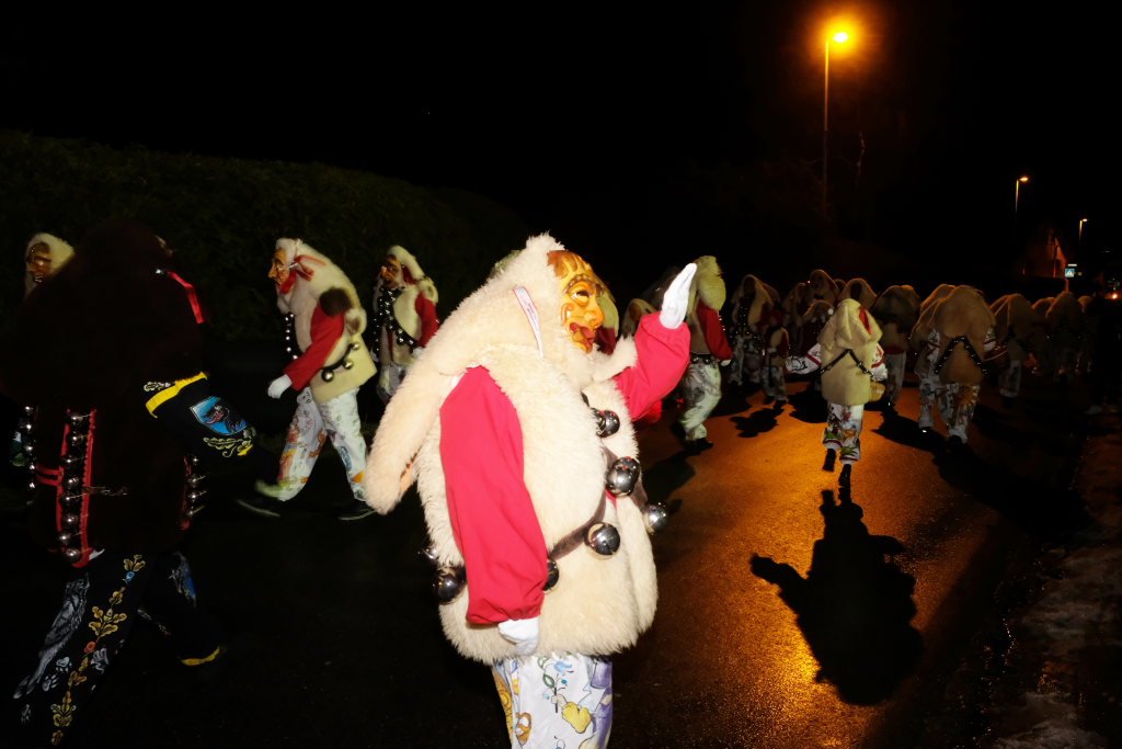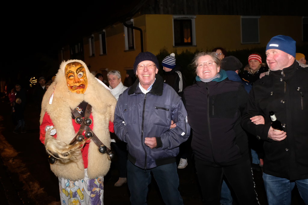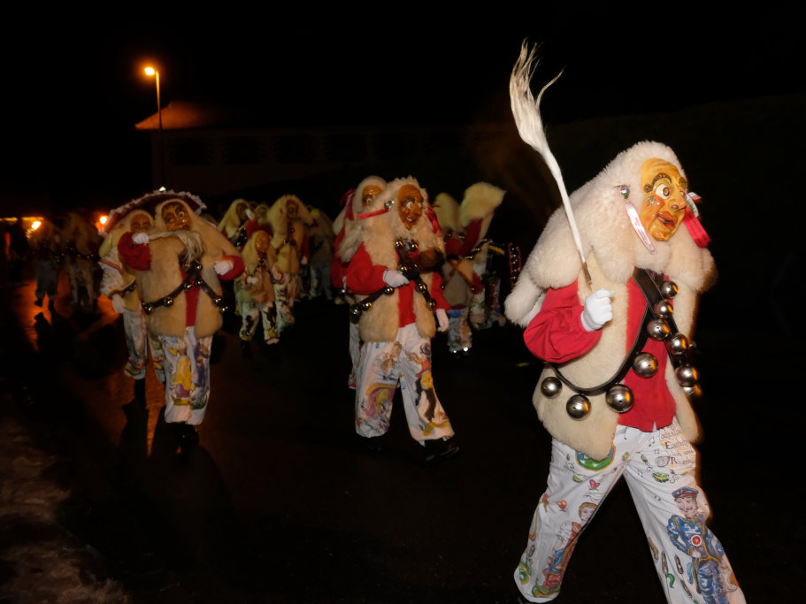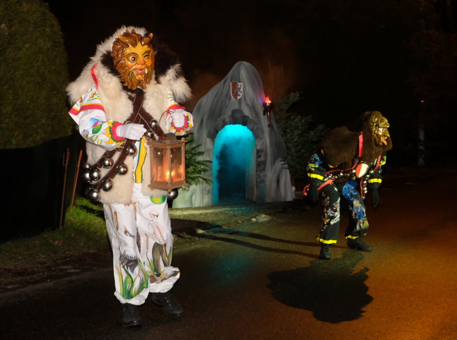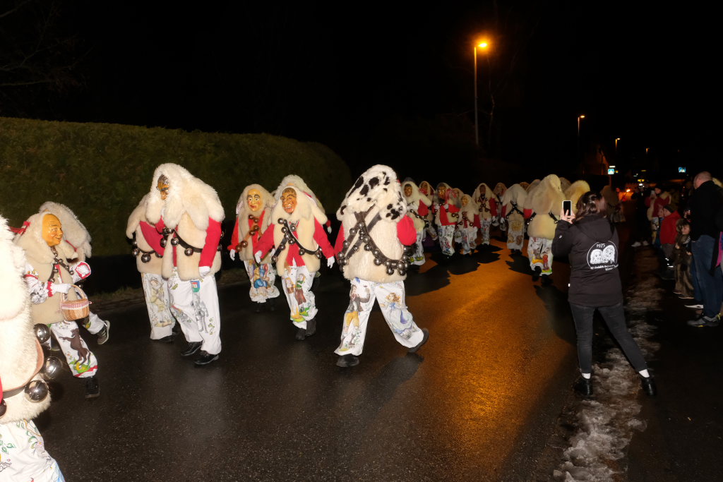 Von – künstlichem – Nebel umwabert stieg der Schwarznarr „Wolfsleib“, von „Wago“ geweckt, der mit seiner Laterne als Erster die Szene betrat, aus seiner Höhle gegenüber des Rathauses. Gemeinsam machten sie sich auf die Suche nach den anderen Narren, die dann von allen Seiten zu ihrem närrischen Treiben zum Haidgauer Rathausplatz strömten. Dort wartete bereits die Schalmeiengruppe D`Hoigamer Schtroßahup`r, die musikalisch – u. a. mit dem Haidgauer Narrenmarsch – die Fasnet miteinläutete. Mit dem alljährlichen von Zunftmeister Daniel Wassner vom Bühnenlädele des Rathauses herabgesprochenen Zaubersatz: „Etz, Ihr Narra, springet zua, und hollet`n raus den Schwanz von dr Kuh!“ wurden die 327 Tage gemeinsam mit den Masken und Häsern in den Truhen ruhenden namensgebenden Accessoires zum kräftigen Auslüften hervorgeholt.