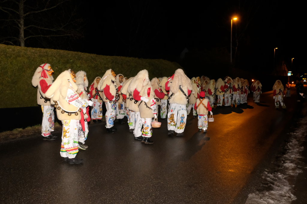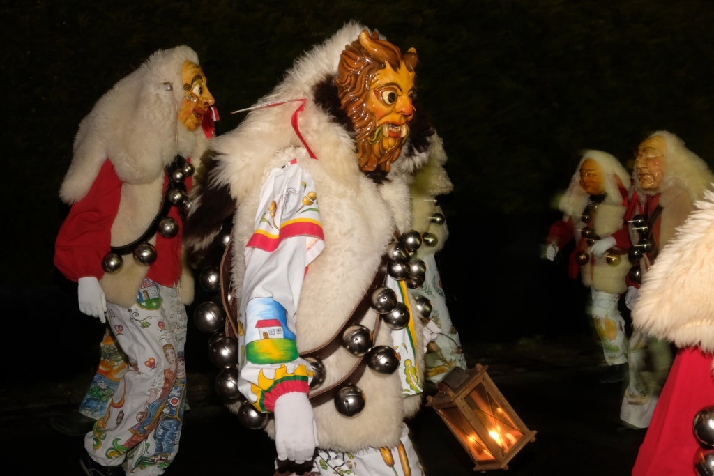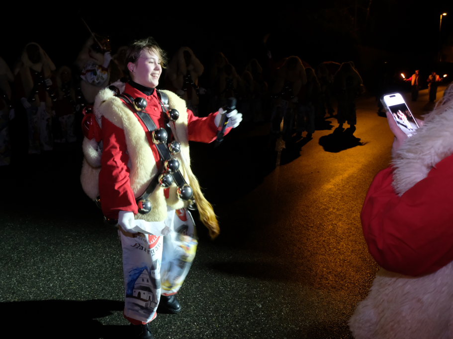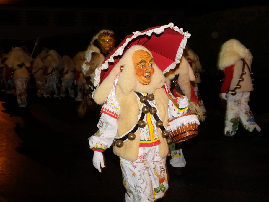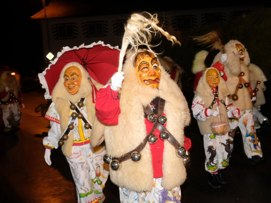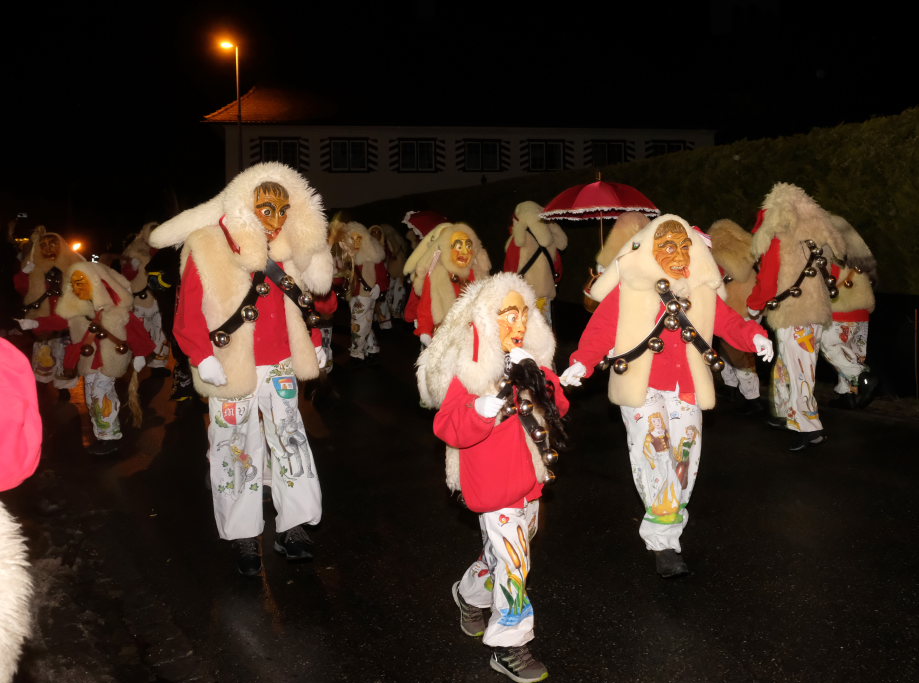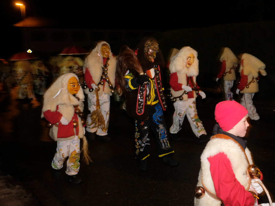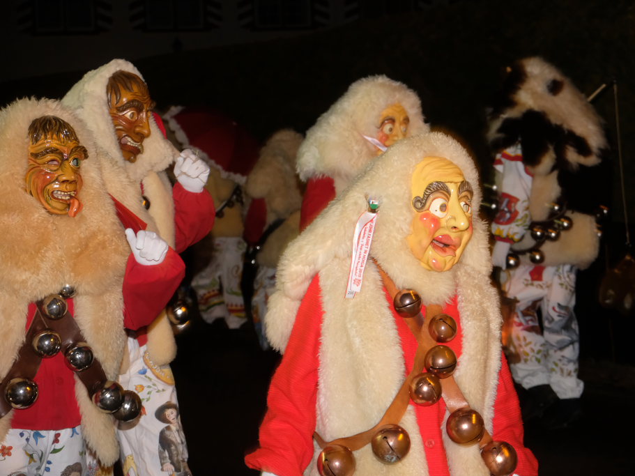 Von – künstlichem – Nebel umwabert stieg der Schwarznarr „Wolfsleib“, von „Wago“ geweckt, der mit seiner Laterne als Erster die Szene betrat, aus seiner Höhle gegenüber des Rathauses. Gemeinsam machten sie sich auf die Suche nach den anderen Narren, die dann von allen Seiten zu ihrem närrischen Treiben zum Haidgauer Rathausplatz strömten. Dort wartete bereits die Schalmeiengruppe D`Hoigamer Schtroßahup`r, die musikalisch – u. a. mit dem Haidgauer Narrenmarsch – die Fasnet miteinläutete. Mit dem alljährlichen von Zunftmeister Daniel Wassner vom Bühnenlädele des Rathauses herabgesprochenen Zaubersatz: „Etz, Ihr Narra, springet zua, und hollet`n raus den Schwanz von dr Kuh!“ wurden die 327 Tage gemeinsam mit den Masken und Häsern in den Truhen ruhenden namensgebenden Accessoires zum kräftigen Auslüften hervorgeholt.