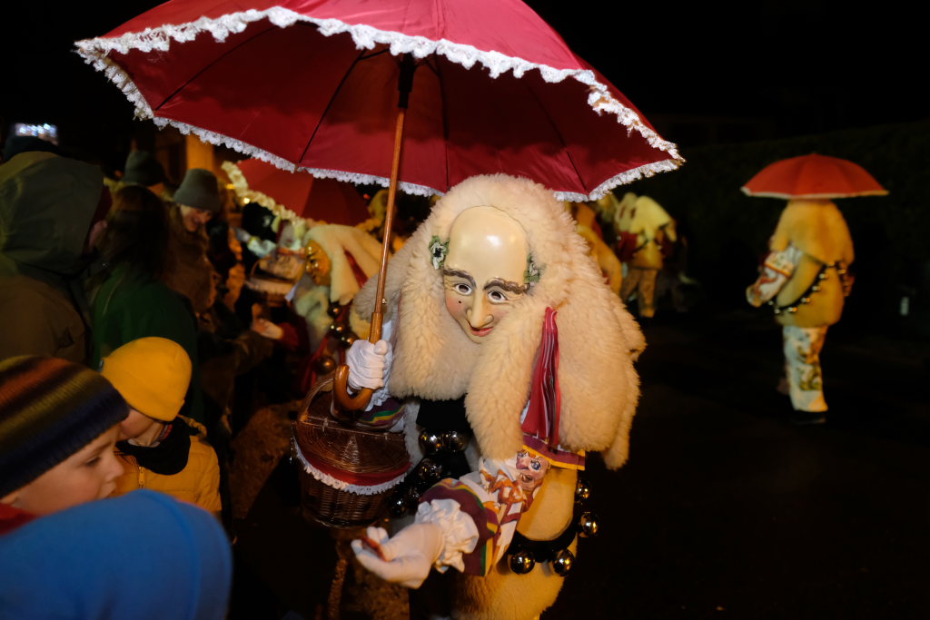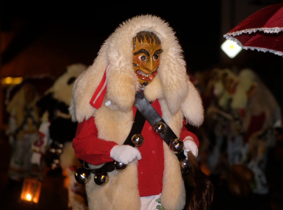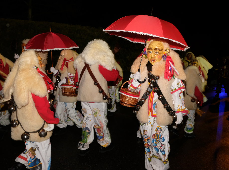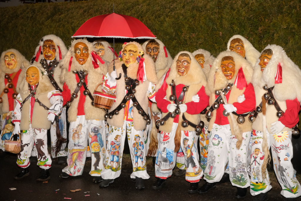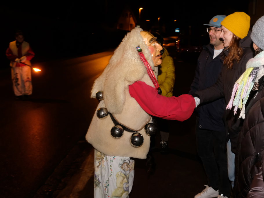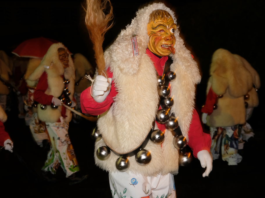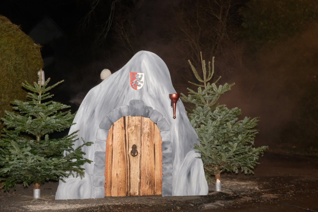 Von – künstlichem – Nebel umwabert stieg der Schwarznarr „Wolfsleib“, von „Wago“ geweckt, der mit seiner Laterne als Erster die Szene betrat, aus seiner Höhle gegenüber des Rathauses. Gemeinsam machten sie sich auf die Suche nach den anderen Narren, die dann von allen Seiten zu ihrem närrischen Treiben zum Haidgauer Rathausplatz strömten. Dort wartete bereits die Schalmeiengruppe D`Hoigamer Schtroßahup`r, die musikalisch – u. a. mit dem Haidgauer Narrenmarsch – die Fasnet miteinläutete. Mit dem alljährlichen von Zunftmeister Daniel Wassner vom Bühnenlädele des Rathauses herabgesprochenen Zaubersatz: „Etz, Ihr Narra, springet zua, und hollet`n raus den Schwanz von dr Kuh!“ wurden die 327 Tage gemeinsam mit den Masken und Häsern in den Truhen ruhenden namensgebenden Accessoires zum kräftigen Auslüften hervorgeholt.
