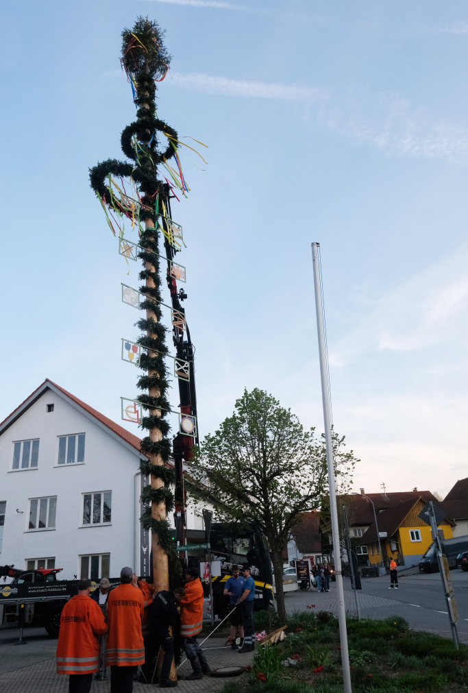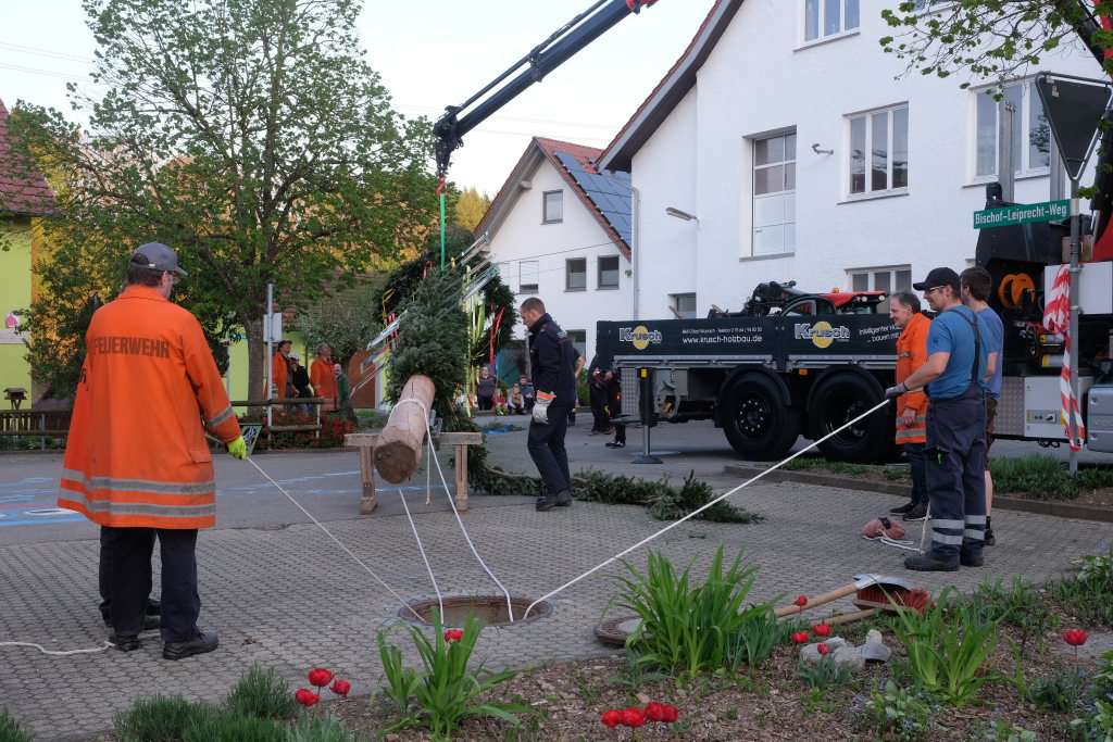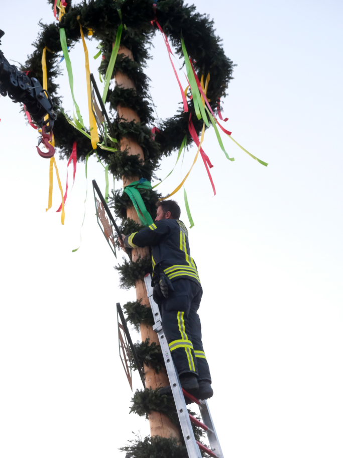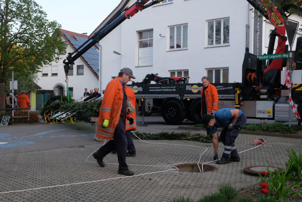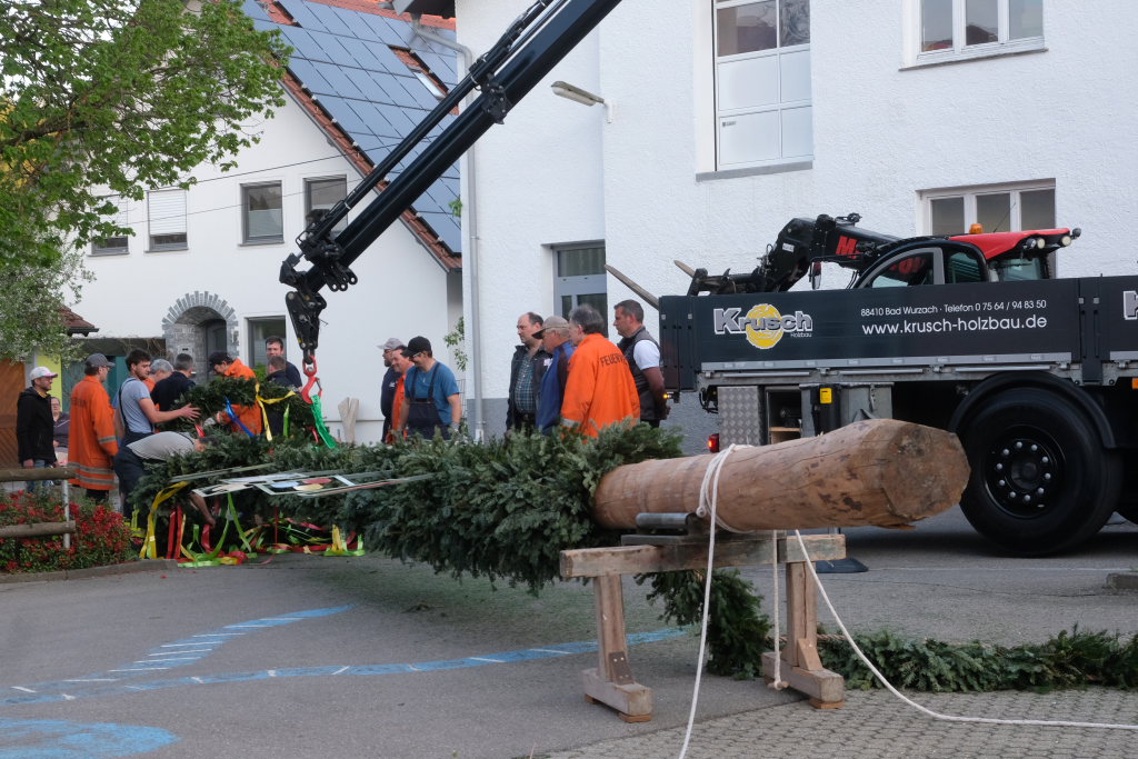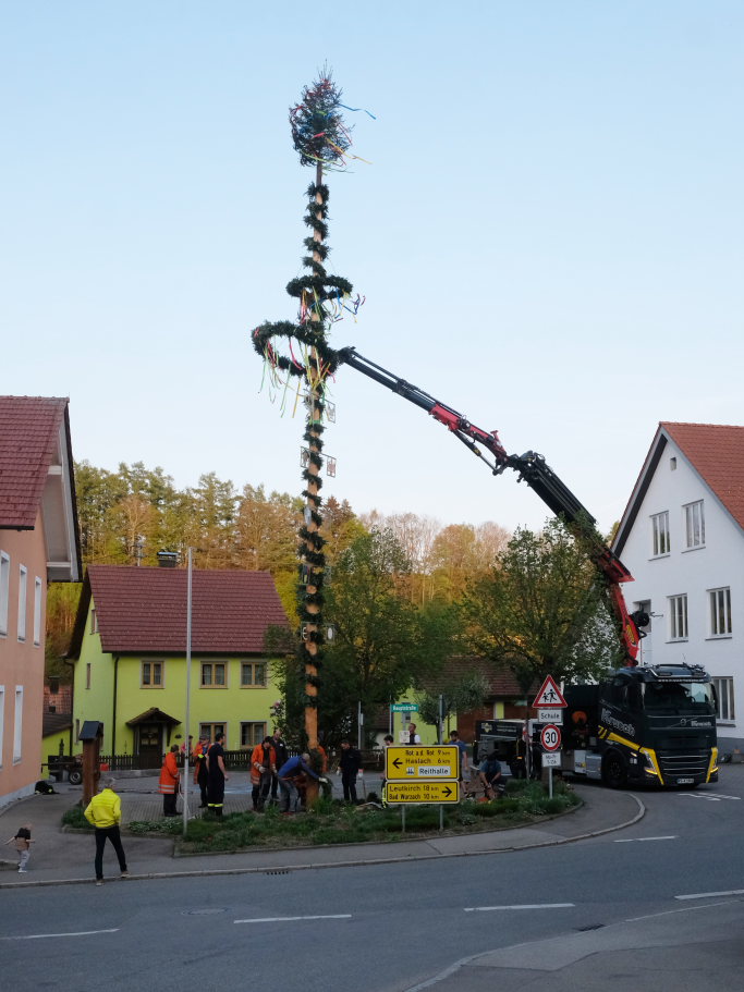 Am Montag, den 28. April lag dann rechtzeitig der prächtige, mit Spitze rund 23 Meter hohe Fichtenstamm mit seinen gekranzten Ringen und den Tafeln des örtlichen Handwerks parat. Nach kleineren Korrekturen an der Spitze konnte der Stamm von Martin Krusch, dem Chef der Firma Krusch- Holzbau persönlich mit dem Lkw-Ladekran, an den dafür verstärkten Gully auf dem Parkplatz beim Rathaus bugsiert werden. Mit am unteren Teil des Stammes angebrachten Seilen steuerten einige Feuerwehrleute ihn per Manpower in die richtige Richtung, sodass der Stamm innerhalb kürzester Zeit vom „Kranführer“ aufgerichtet werden konnte.