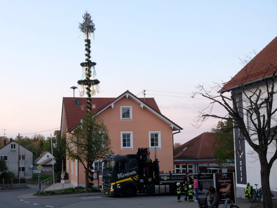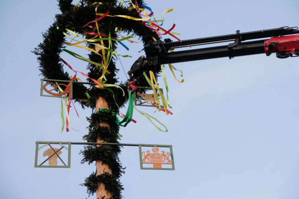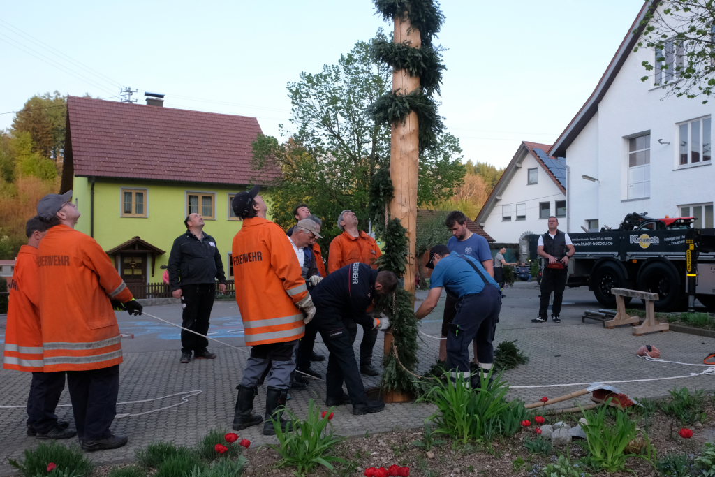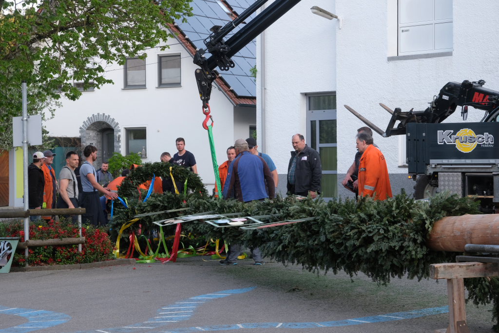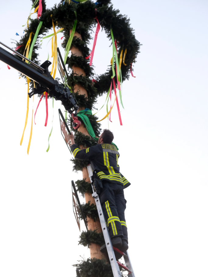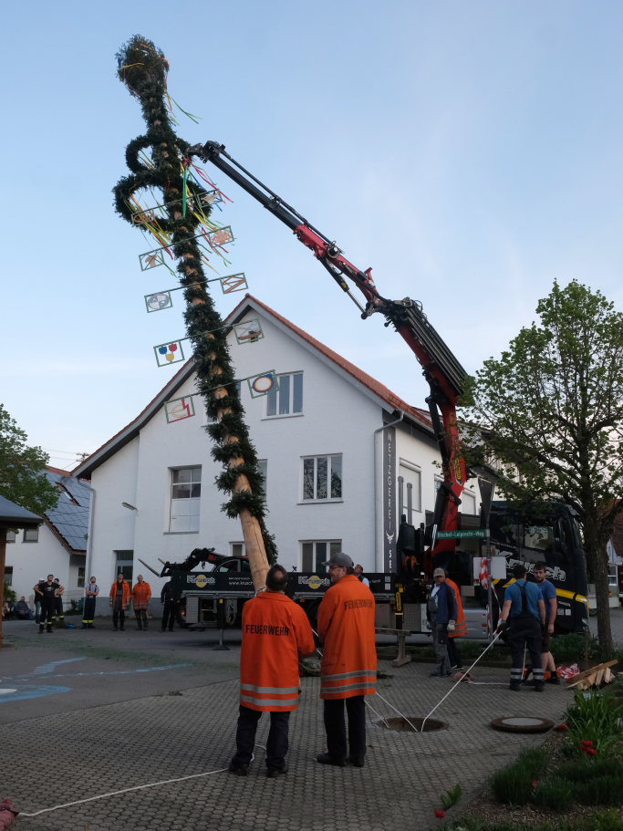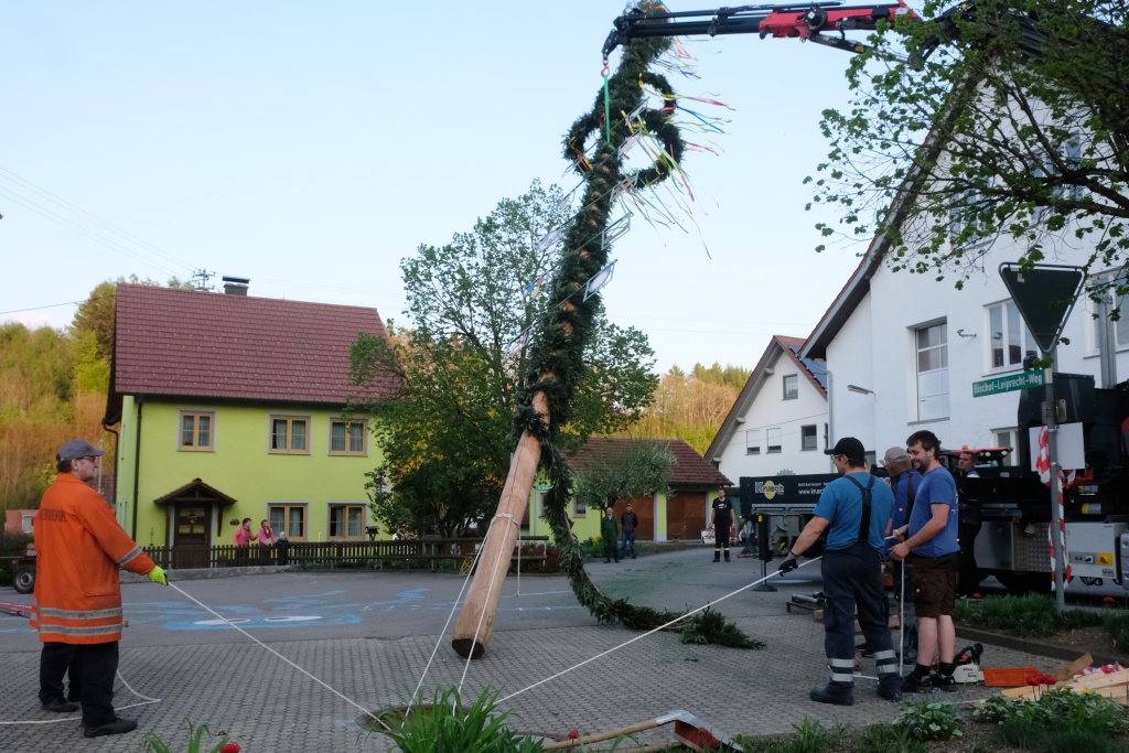 Am Montag, den 28. April lag dann rechtzeitig der prächtige, mit Spitze rund 23 Meter hohe Fichtenstamm mit seinen gekranzten Ringen und den Tafeln des örtlichen Handwerks parat. Nach kleineren Korrekturen an der Spitze konnte der Stamm von Martin Krusch, dem Chef der Firma Krusch- Holzbau persönlich mit dem Lkw-Ladekran, an den dafür verstärkten Gully auf dem Parkplatz beim Rathaus bugsiert werden. Mit am unteren Teil des Stammes angebrachten Seilen steuerten einige Feuerwehrleute ihn per Manpower in die richtige Richtung, sodass der Stamm innerhalb kürzester Zeit vom „Kranführer“ aufgerichtet werden konnte.
