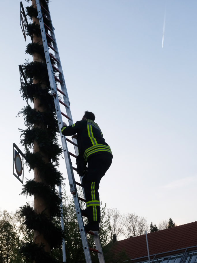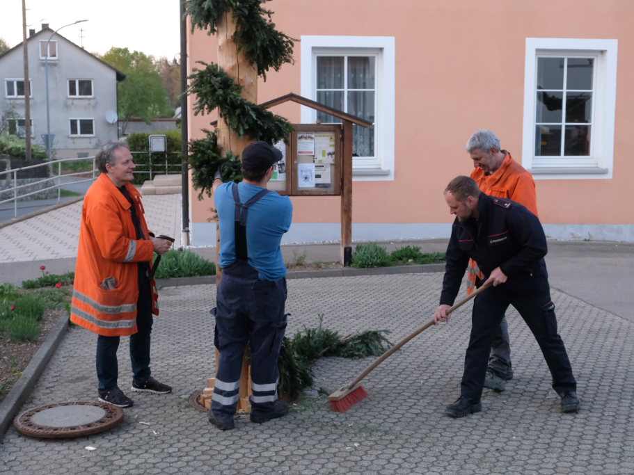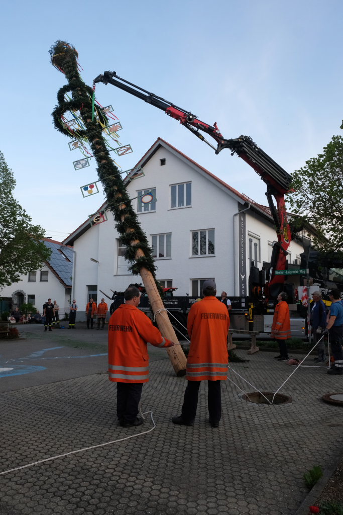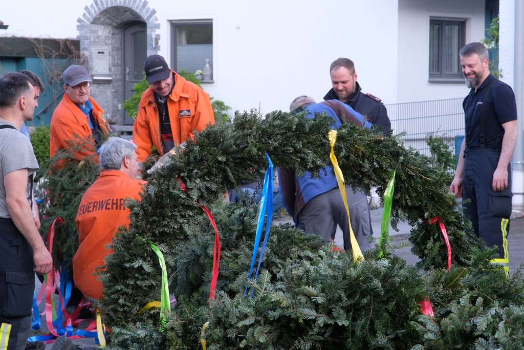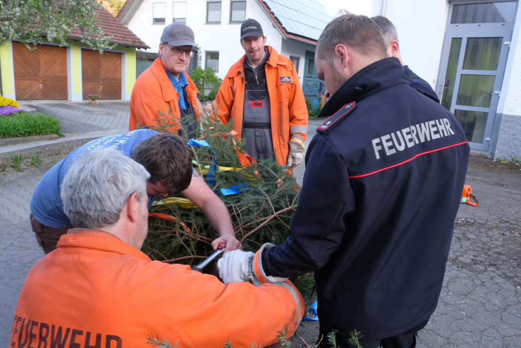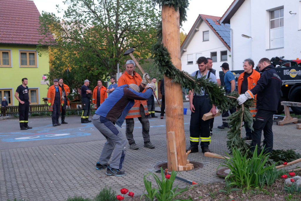 Am Montag, den 28. April lag dann rechtzeitig der prächtige, mit Spitze rund 23 Meter hohe Fichtenstamm mit seinen gekranzten Ringen und den Tafeln des örtlichen Handwerks parat. Nach kleineren Korrekturen an der Spitze konnte der Stamm von Martin Krusch, dem Chef der Firma Krusch- Holzbau persönlich mit dem Lkw-Ladekran, an den dafür verstärkten Gully auf dem Parkplatz beim Rathaus bugsiert werden. Mit am unteren Teil des Stammes angebrachten Seilen steuerten einige Feuerwehrleute ihn per Manpower in die richtige Richtung, sodass der Stamm innerhalb kürzester Zeit vom „Kranführer“ aufgerichtet werden konnte.