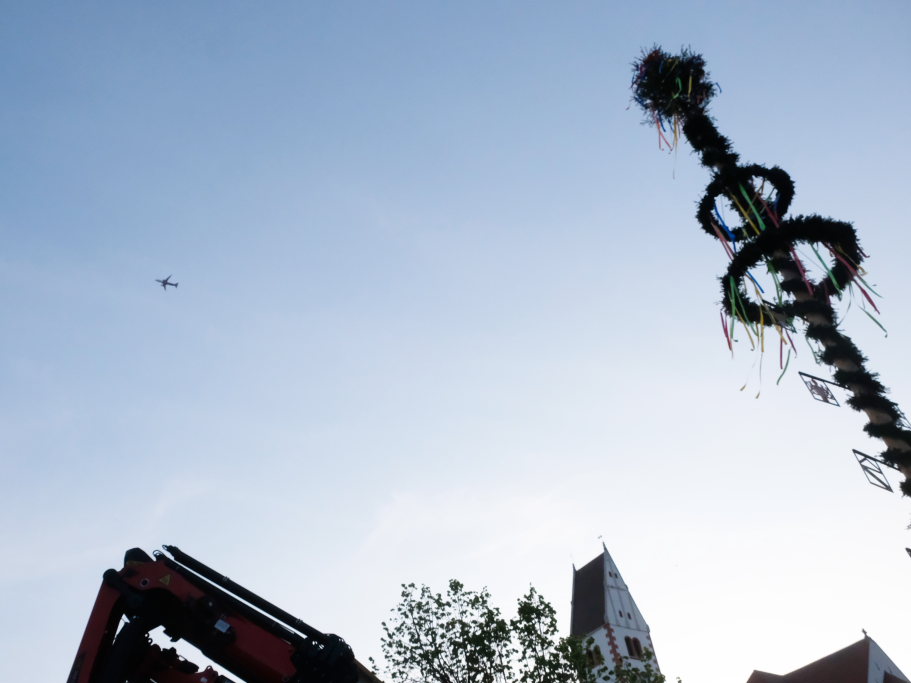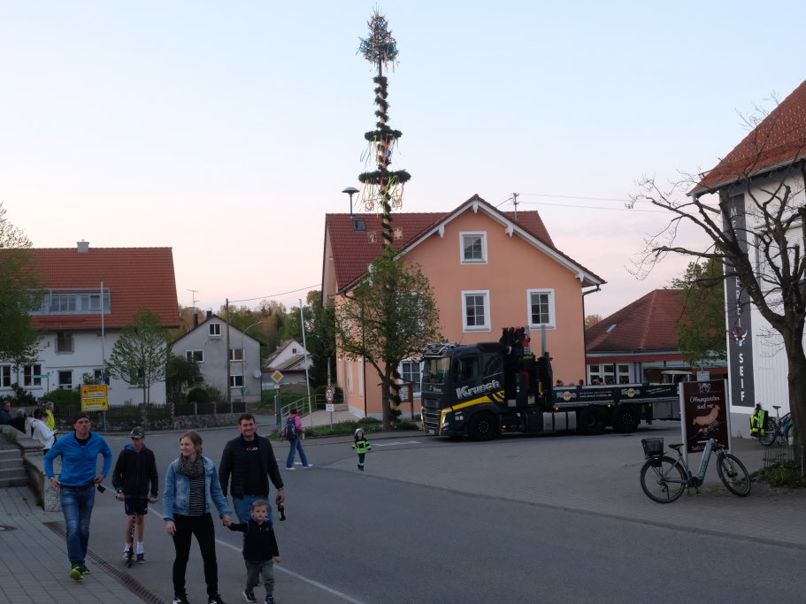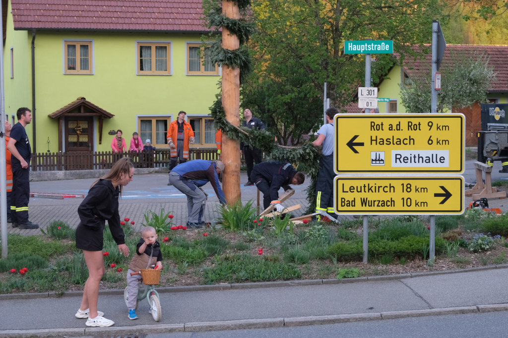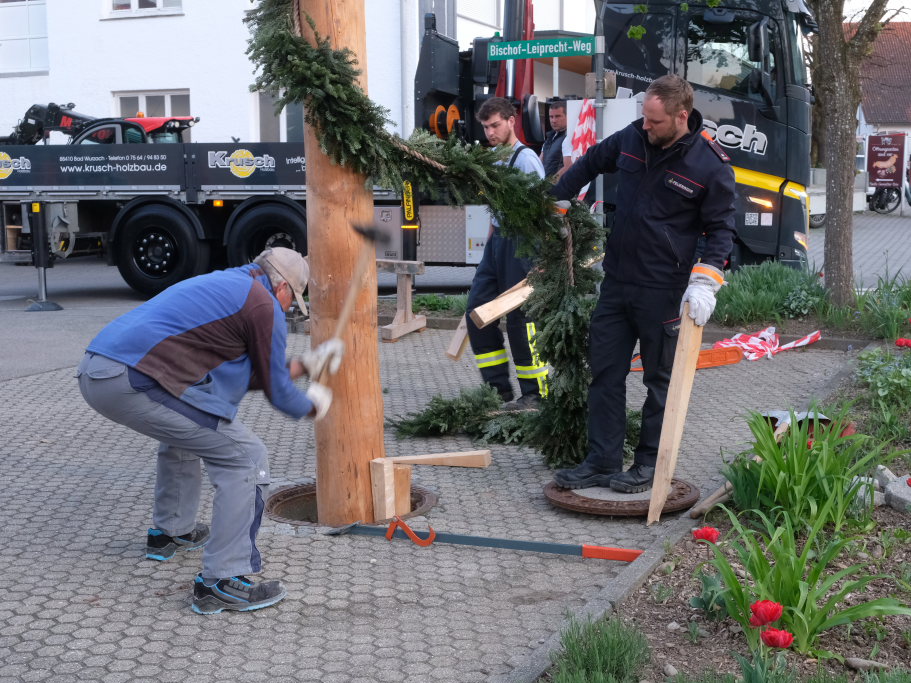 Hauerz – Weil es eine Terminkollision gab, stellte die Feuerwehr ihren traditionellen Maibaum zwischen Bischof-Leiprecht-Weg und dem Rathaus bereits am Montagabend auf. Die Wehrleute waren damit die Schnellsten in der Großgemeinde. In den anderen Ortschaften wurde der Maibaum erst am Nachmittag bzw. Abend vor dem 1. Mai aufgestellt.