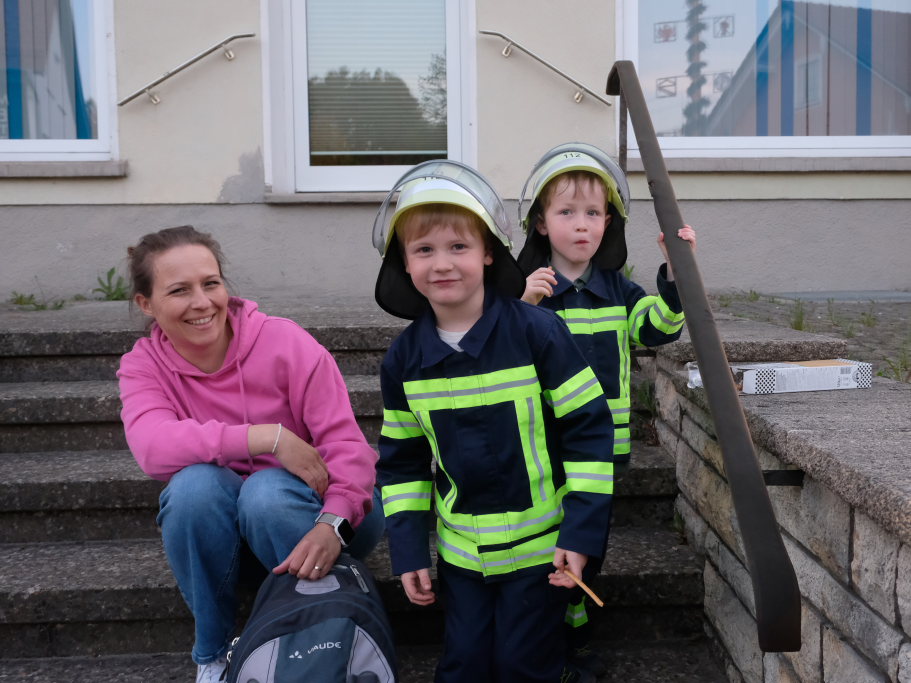 Dann erfolgte die kitzeligste Aktion des Abends: Ein mutiger – und sicherlich schwindelfreier – Feuerwehrmann musste auf die hohe Feuerwehrleiter steigen, um die Befestigung des Kranes zu lösen und Ringe und Tafeln auszurichten. Wofür er nach gelungener Aktion mit einem verdienten Applaus wieder auf dem Boden empfangen wurde.