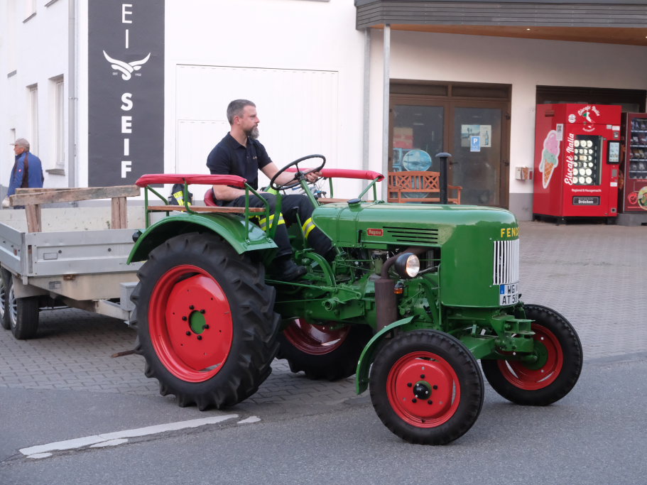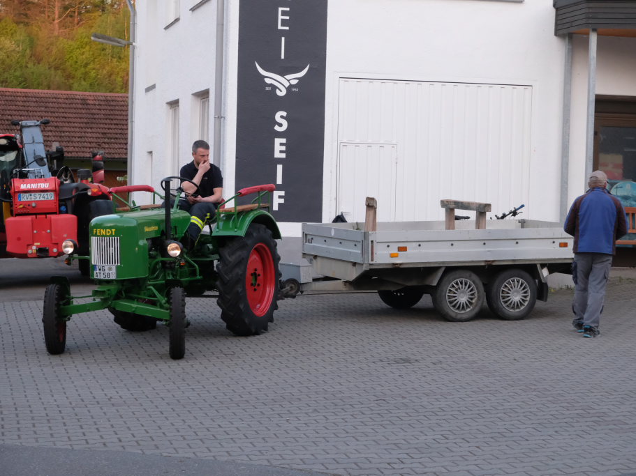 Nachdem vom Feuerwehrchef Frank Weishaupt noch kurz zum Besen gegriffen hatte, um überzähliges Reisig zu entsorgen und der als Materialtransporter dienende Traktor-Oldtimer – ein zirka 55 Jahre alter Fendt-Dieselross wieder in seiner Garage abgestellt war, konnte auch hier zum gemütlichen Teil der „Aftershow-Party“ übergegangen werden. Die Anwohner-Familien Wiest und Seif sorgten beim gemütlichen Beisammensein für Speis‘ und Trank.