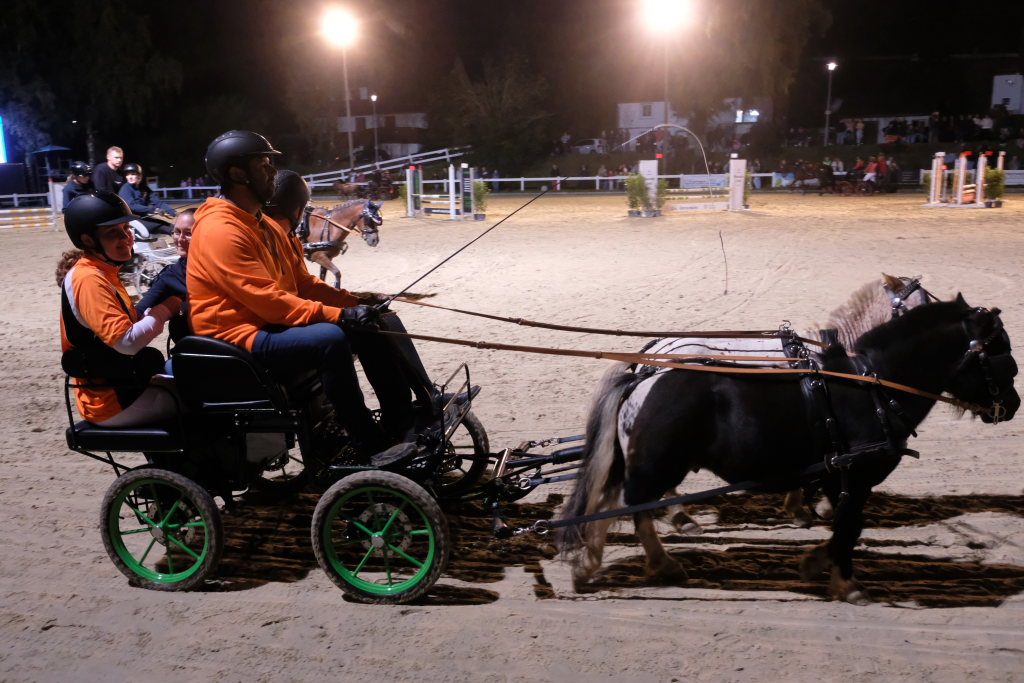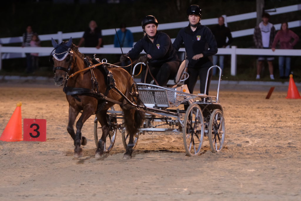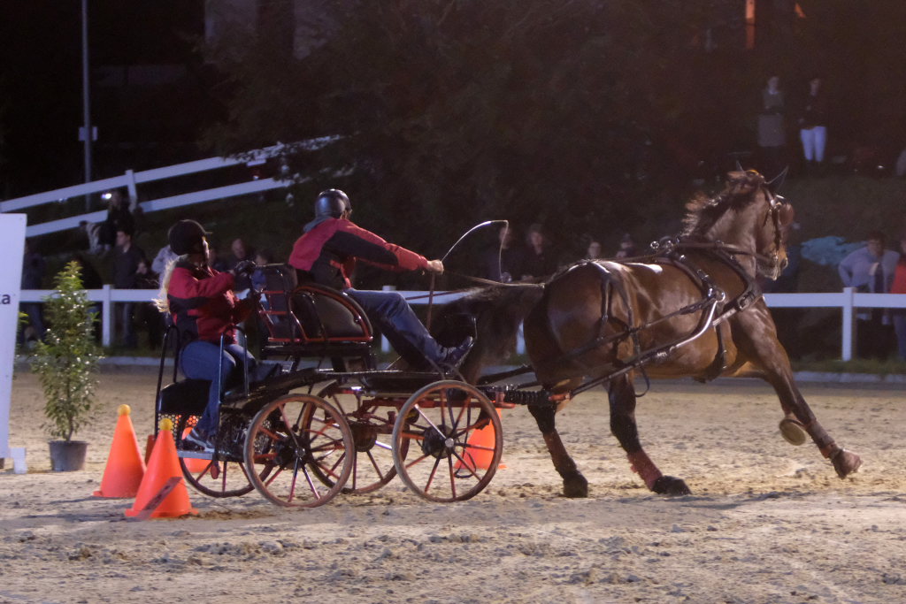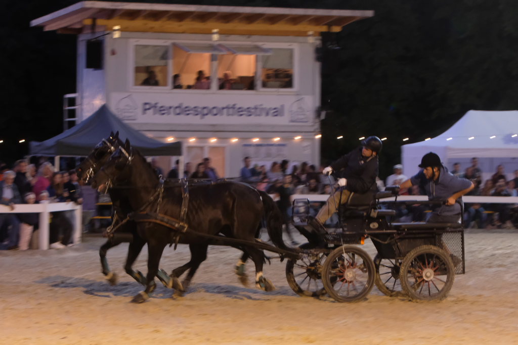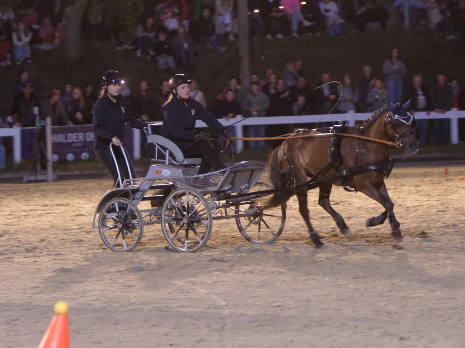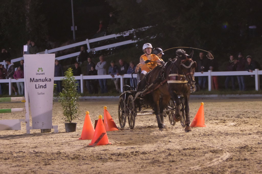 Diese hatten danach einen Parcours zu umrunden, bei dem es vor allem auf Geschicklichkeit und Ausdauer ankam. Dieser bestand aus kleinen Pylonen, auf denen kleine Bälle thronten. Je nach Kutschentyp variierte die Durchfahrtsgröße zwischen 150 und 175 cm. Fiel einer der Bälle, gab es wie bei einem Abwurf im Springparcours 4 Strafsekunden, die sofort auf die Laufzeit aufaddiert wurde und somit nach dem Zieleinlauf bereits das tatsächliche Endergebnis des jeweiligen Teams auf der großen Videoleinwand erschien. Pferdemäßig waren vom Zwergpony-Gespann, sowohl als Einspänner als auch als Zweispänner, bis zum Großpferd alle Pferdegrößen am Start. Der Fahrparcours war für alle sehr fair: Denn während die wendigen Ponygespanne Vorteile in engen Kurven und Kehren hatten, waren die Großpferde naturgemäß bei den Geschwindigkeitsstrecken im Vorteil.