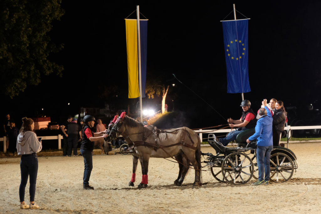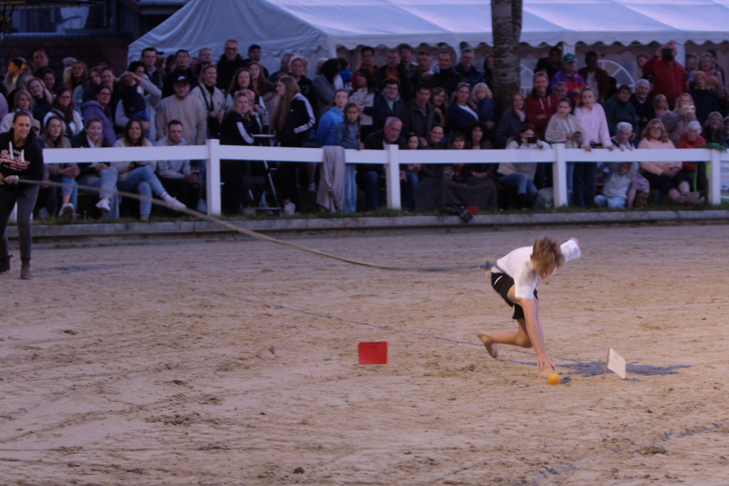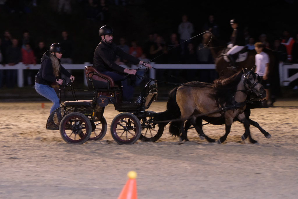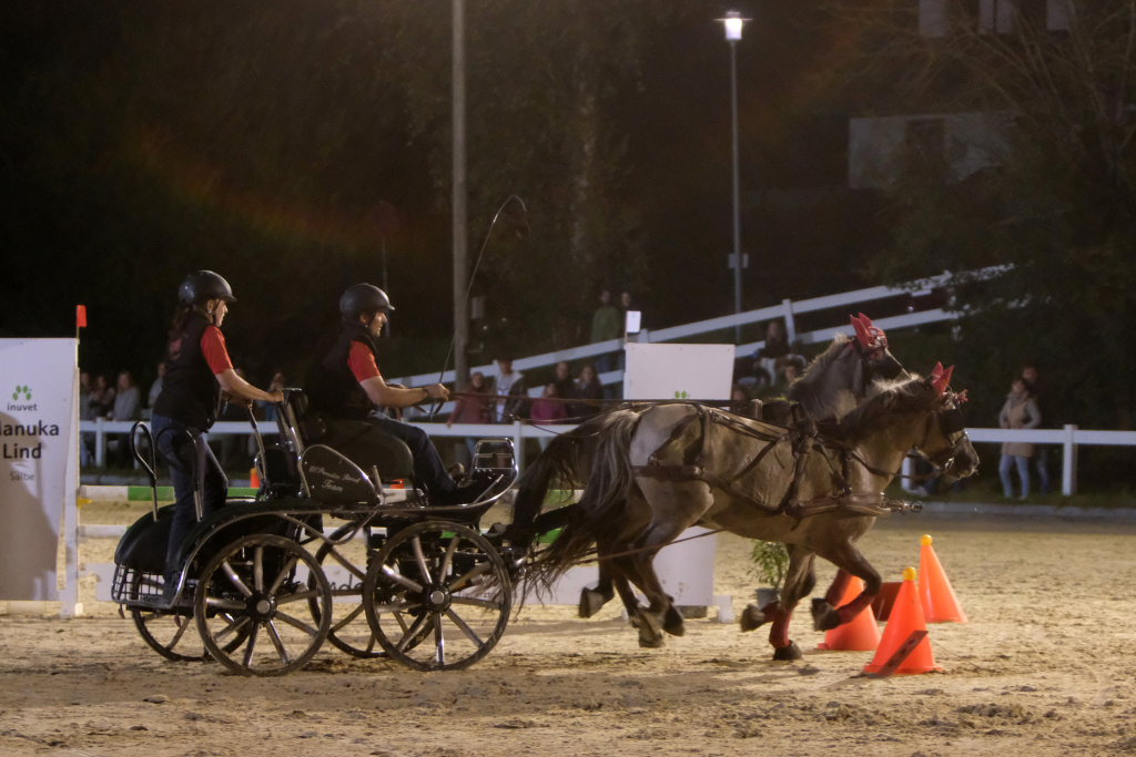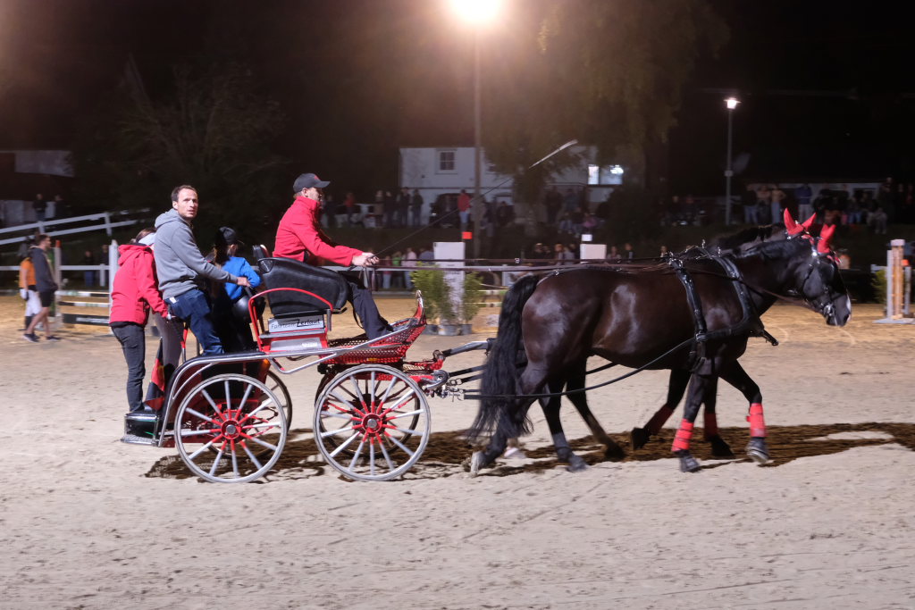 Diese hatten danach einen Parcours zu umrunden, bei dem es vor allem auf Geschicklichkeit und Ausdauer ankam. Dieser bestand aus kleinen Pylonen, auf denen kleine Bälle thronten. Je nach Kutschentyp variierte die Durchfahrtsgröße zwischen 150 und 175 cm. Fiel einer der Bälle, gab es wie bei einem Abwurf im Springparcours 4 Strafsekunden, die sofort auf die Laufzeit aufaddiert wurde und somit nach dem Zieleinlauf bereits das tatsächliche Endergebnis des jeweiligen Teams auf der großen Videoleinwand erschien. Pferdemäßig waren vom Zwergpony-Gespann, sowohl als Einspänner als auch als Zweispänner, bis zum Großpferd alle Pferdegrößen am Start. Der Fahrparcours war für alle sehr fair: Denn während die wendigen Ponygespanne Vorteile in engen Kurven und Kehren hatten, waren die Großpferde naturgemäß bei den Geschwindigkeitsstrecken im Vorteil.