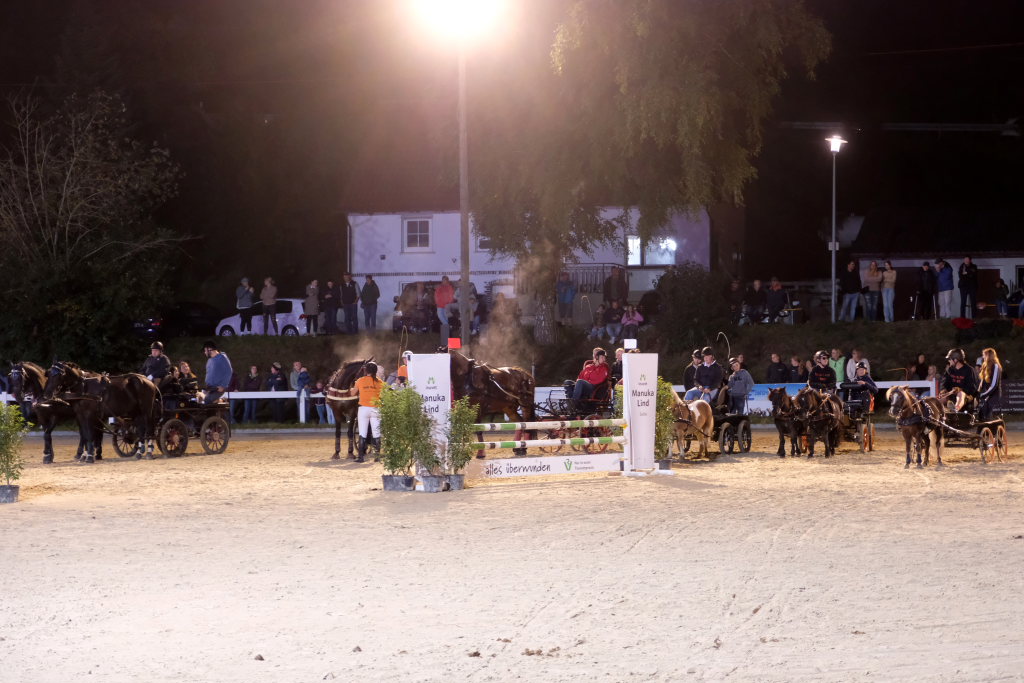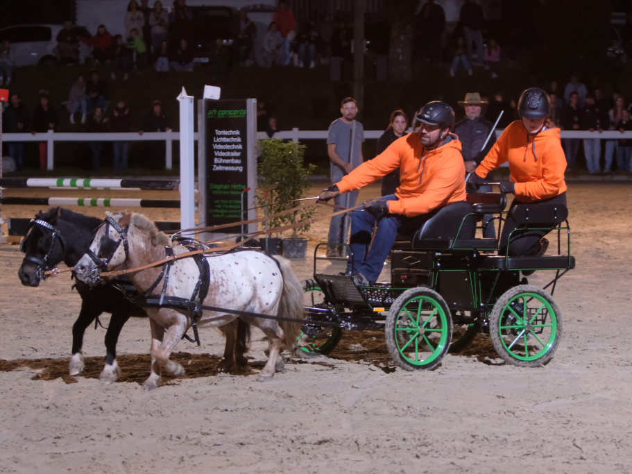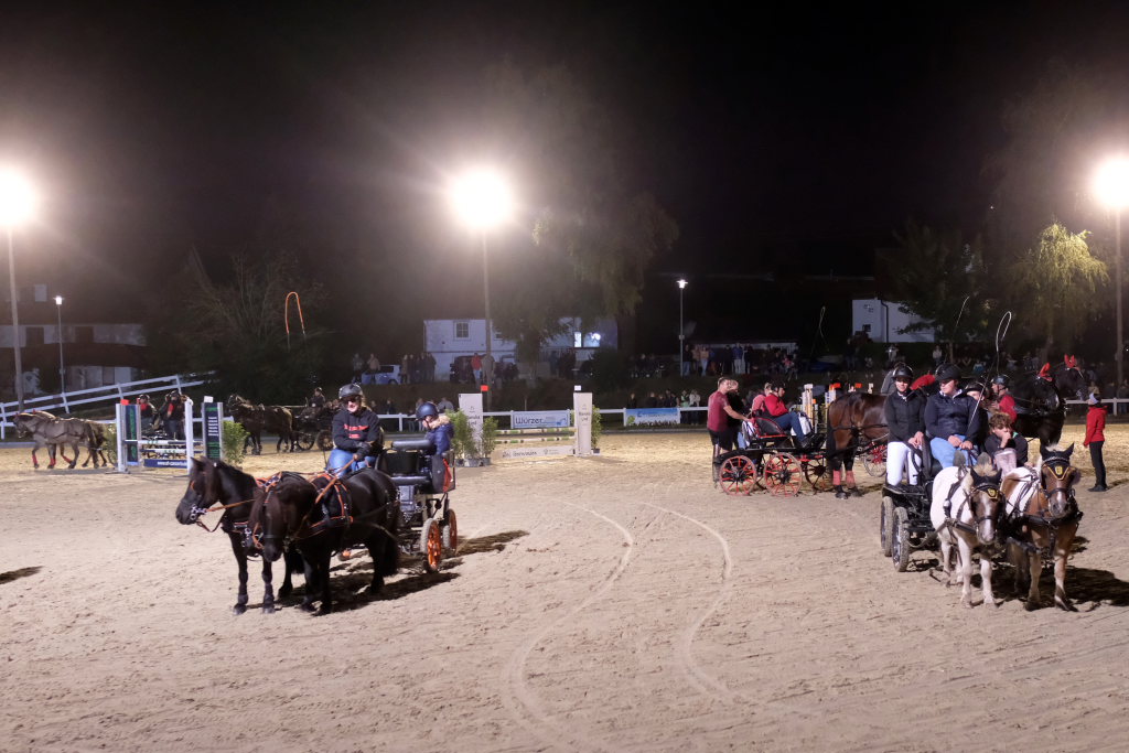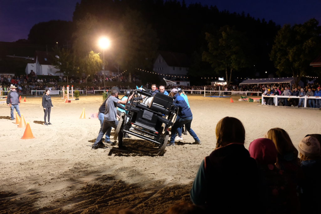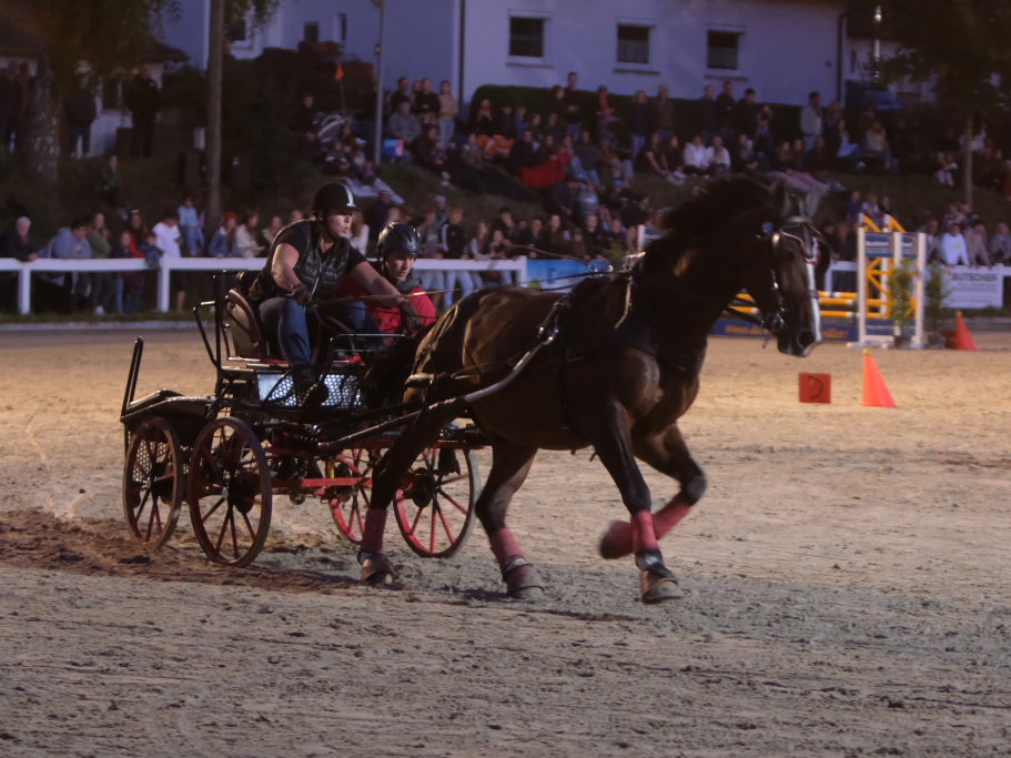 Zuweilen stockte an diesem Abend den rund 1000 Zuschauern, die das Spektakel angelockt hatte, der Atem: Als eine Kutsche, die den finalen Parcours absolvierte in einer der engsten Kurven der Schwerkraft nicht mehr trotzen konnte und Fahrer und Beifahrer abwarf. Sofort waren dann viele helfende Hände bei der jeweiligen Kutsche, um das Pferd aus seinem Geschirr zu befreien, zu beruhigen und die Kutsche wiederaufzurichten. Der anwesende Tierarzt stellte bei seinen späteren Untersuchungen fest, dass die Tiere alle wohlauf waren. Fahrer und Beifahrer trugen außer einer verschmutzten Kleidung keinerlei Blessuren davon. Hier waren aufgrund ihres sehr niedrigen Schwerpunkts die Pony-Gespanne auf der sicheren Seite.