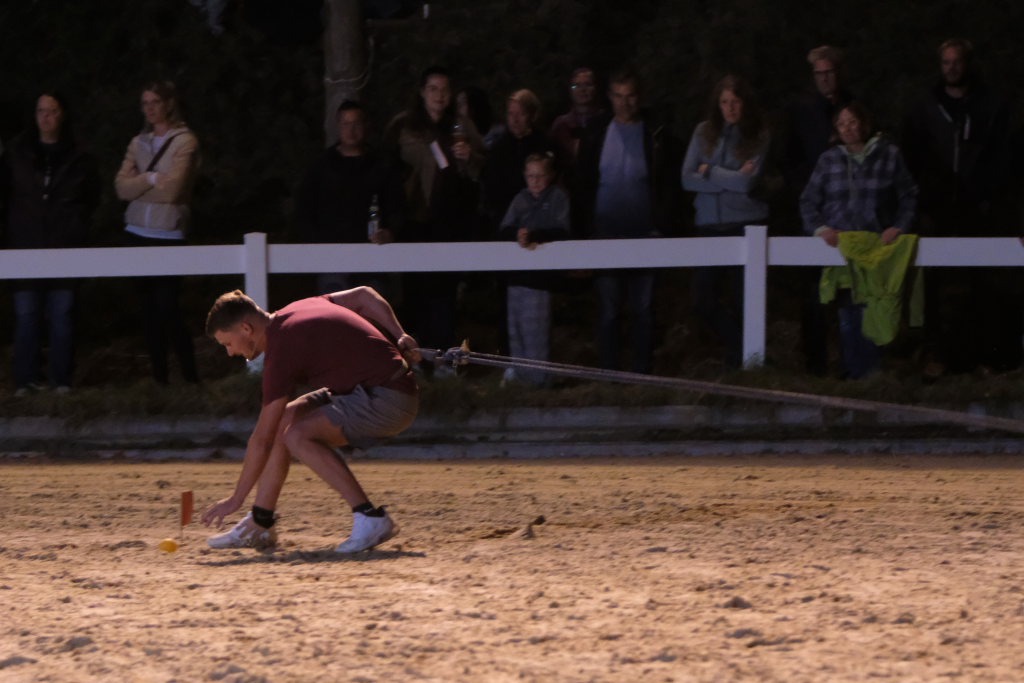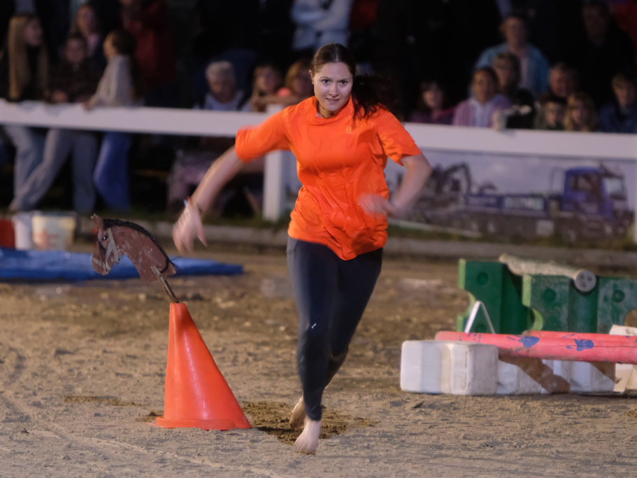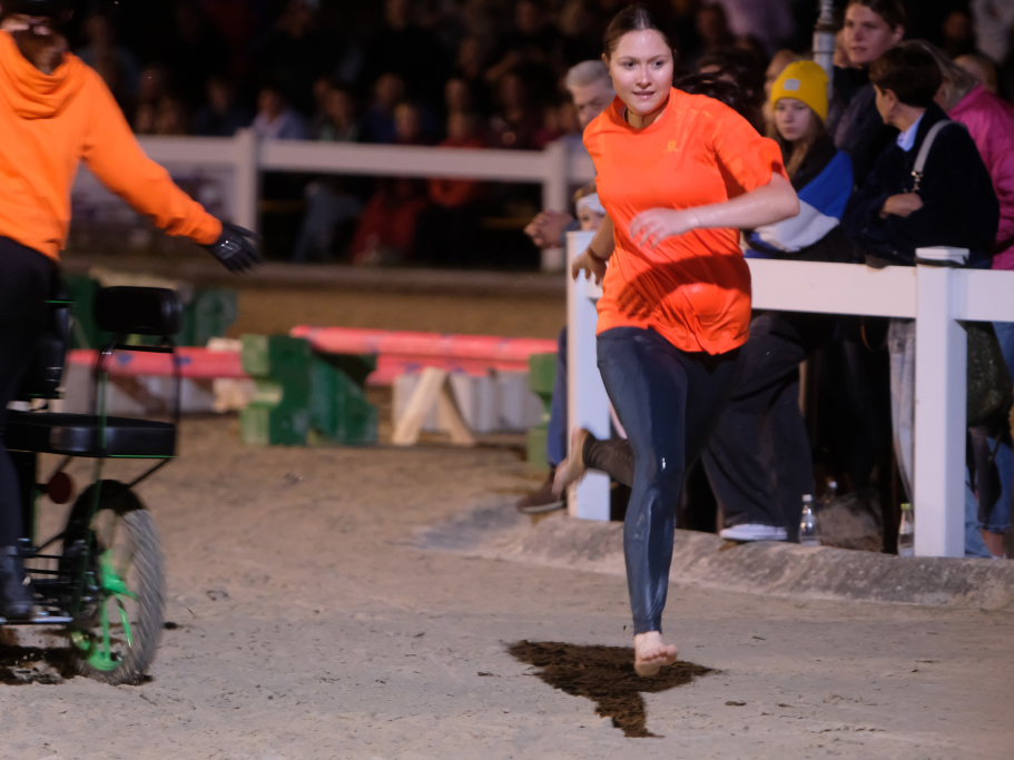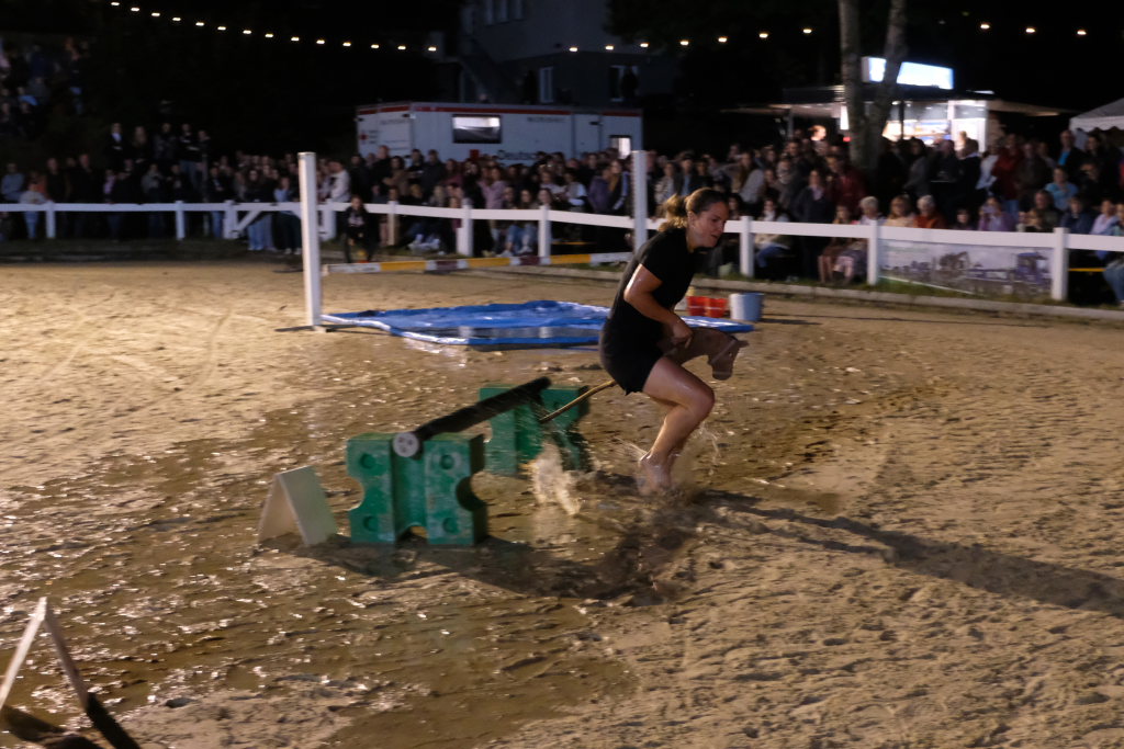 Den Auftakt für jedes Team setzte dabei eine Reiterin oder ein Reiter, die einen Springparcours bewältigen mussten. Nachdem diese(r) die Ziellinie überquert hatte, war der Läufer an der Reihe: Angeseilt an ein knapp bemessenes Bungee-Seil musste er zunächst zwei Bälle einsammeln, danach auf einer Wasserrutsche ein Hindernis unterqueren, um dann auf einem Steckenpferd reitend – quasi als zweibeiniges Pferd – noch einige Hindernisse zu überwinden, ehe er mit dem Abklatschen des Beifahrers der Kutsche den Staffelstab erneut an die vierbeinigen Protagonisten weitergab.