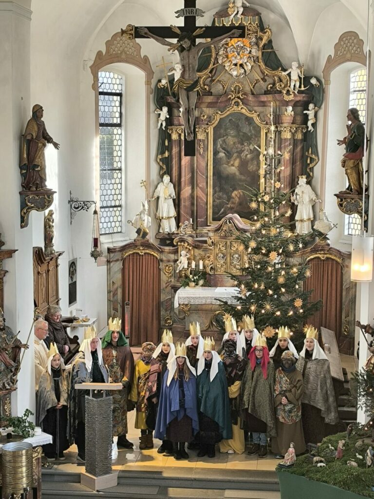 Die Dietmannser Sternsinger in der Pfarrkirche St. Ulrich und Margareta. Links Pfarrer Stefan Maier. Foto: Kirchengemeinde