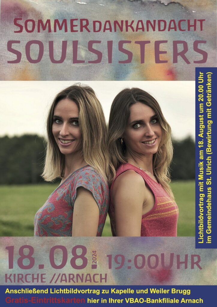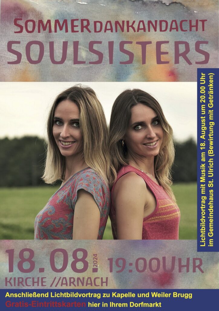 Brugg / Arnach – Das Brugger Rochus-Fest aus Anlass der Ersterwähnung des Weilers vor 750 Jahren hat am Sonntag, 18. August, einen zweiten Höhepunkt (nach Festakt und Rochus-Messe am 16. August): Um 19.00 Uhr gibt es in der Pfarrkirche Arnach eine konzertante Dankandacht unter Leitung von Pfarrer Meschenmoser. Die Soulsisters Angele singen dabei geistliche Lieder. Hierzu ist jedermann aus nah und fern herzlich eingeladen. Spenden sind erbeten. Anschließend (ca. 20.00 Uhr) findet ein Lichtbild-Vortrag im Gemeindehaus St. Ulrich in Arnach statt (Eintritt frei, Zugangskarten gratis erhältlich in Elmars Dorfmarkt und bei der Arnacher Bank).
