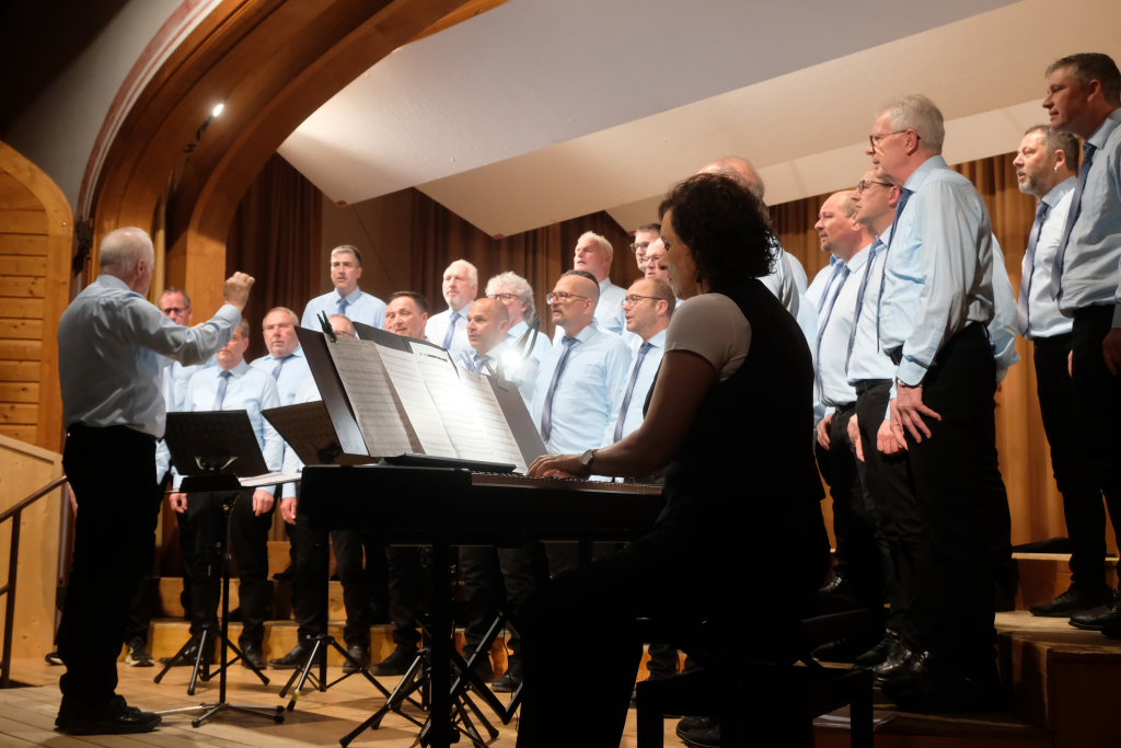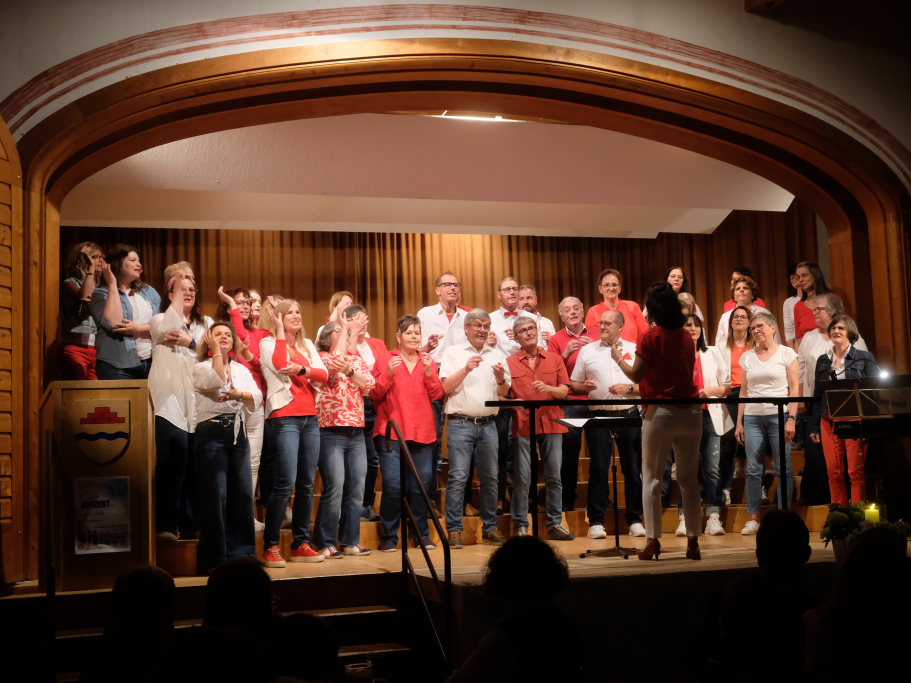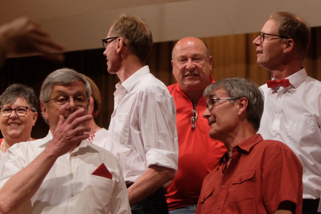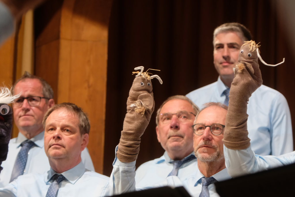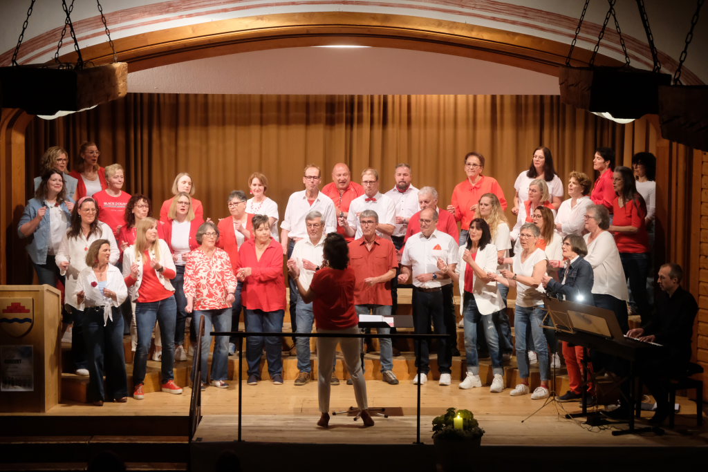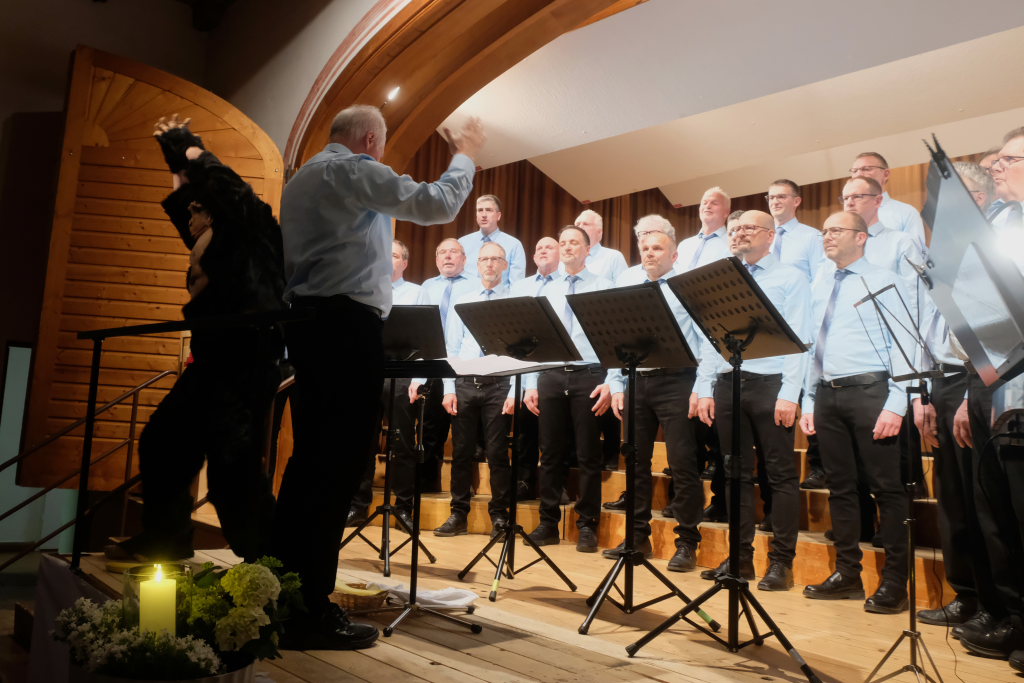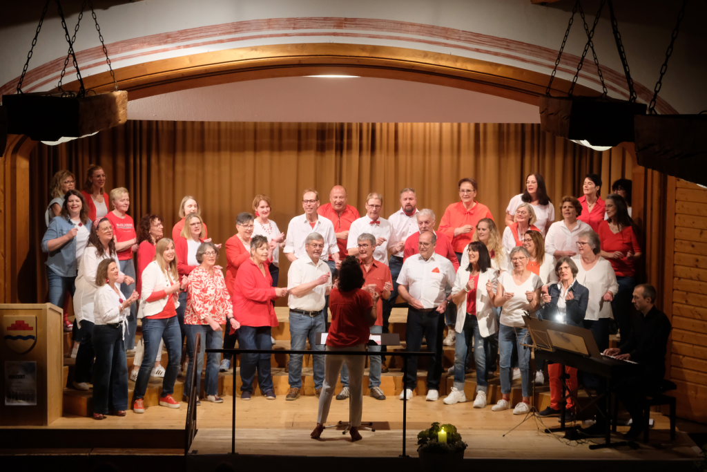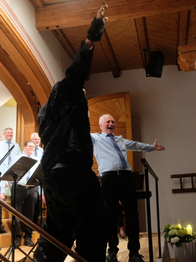 Musikalisch starteten die Sänger unter der Leitung von Erich Minsch und am Piano sicher begleitet von Christiane Pfänder mit einem musikalischen Willkommensgruß „Hallo, Hallo,“ und dem Liebeserklärungs-Klassiker „Aber dich gibt’s nur einmal für mich“. Eine ganz andere Bedeutung hatte ursprünglich ihr nächstes Lied „Bella-Ciao“. Das Lied hat seine Wurzeln in der italienischen Partisanenbewegung während des Zweiten Weltkriegs. Ursprünglich als Volkslied der Reisbauern in der Po-Ebene bekannt, wurde es zu einer wichtigen Hymne des antifaschistischen Widerstands. Heute wird Bella Ciao nicht nur als Mahnung an die dunklen Kapitel der Geschichte angesehen, sondern auch als zeitloses Zeichen für den fortwährenden Kampf gegen Ungerechtigkeit und Tyrannei. „Trag mi Wind“ wurde von der österreichischen Mundartdichterin Brigitte Hubmann kurz vor ihrem Tod 2010 geschrieben. In ihrem Text blickt sie dem Tod entgegen und bittet den Wind, sie zu tragen, heim übers Land, übers Meer. Doch bevor das Publikum in Melancholie versinken konnte, wurden Dirigent, Chor und Publikum beim Dschungelbuch-Medley von einem Schabernack-freudigen Affen – nein, nicht gebissen – aber doch ein wenig auf den Arm genommen.
