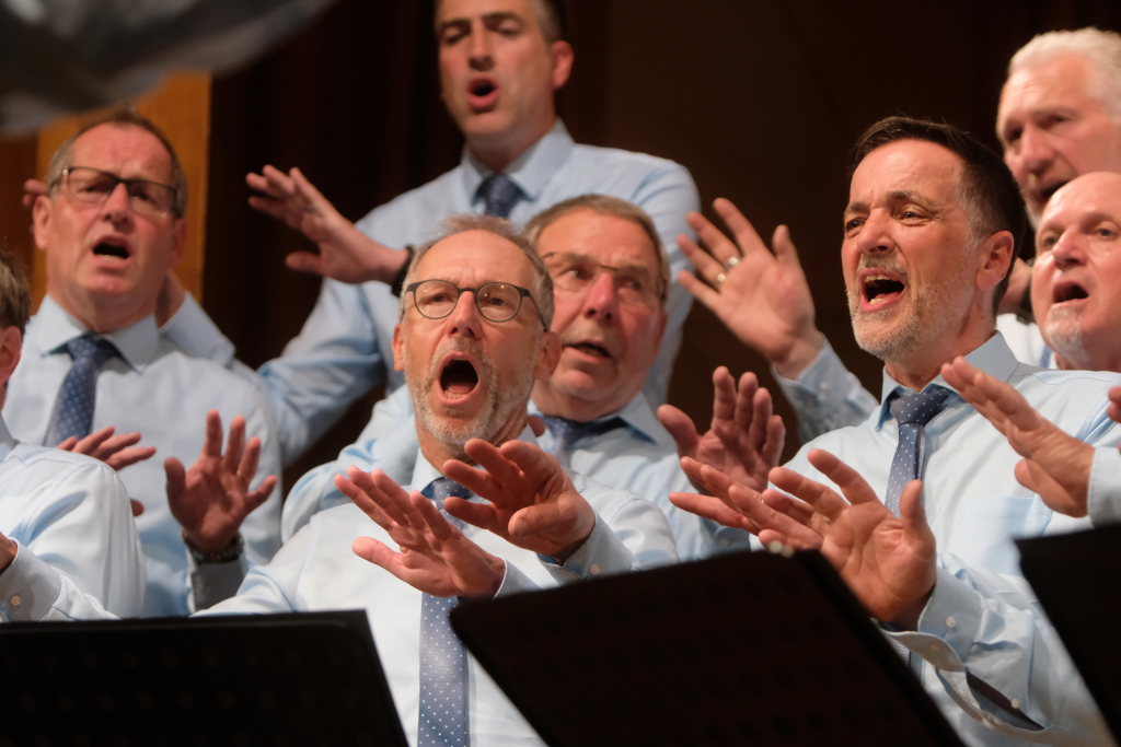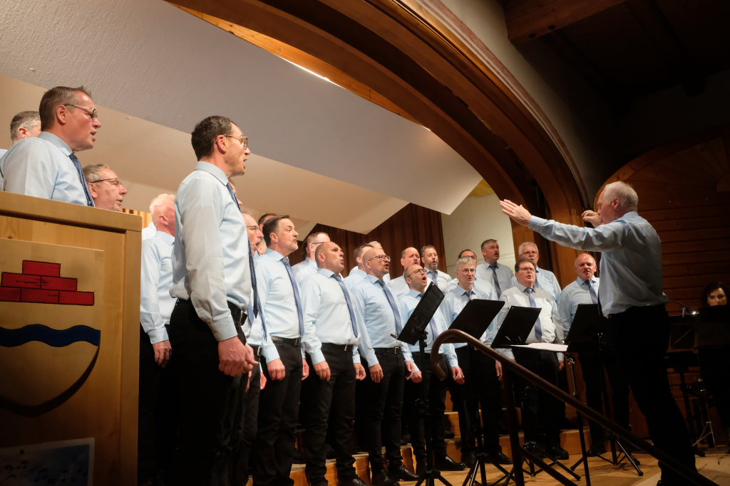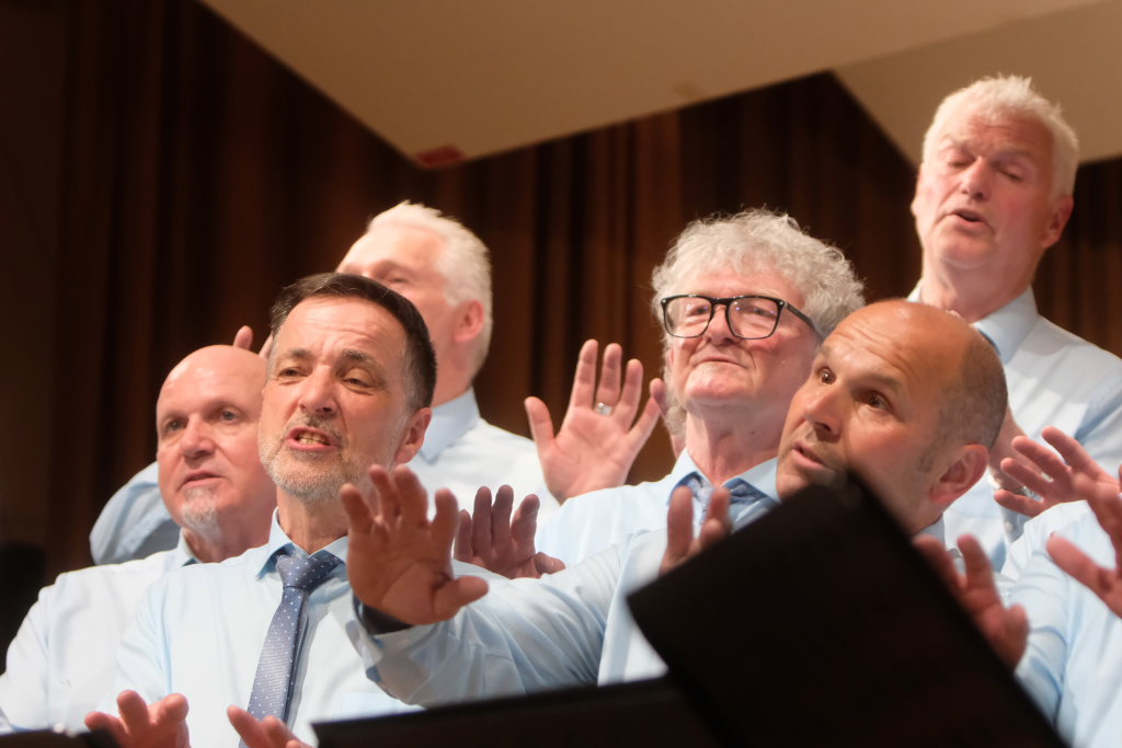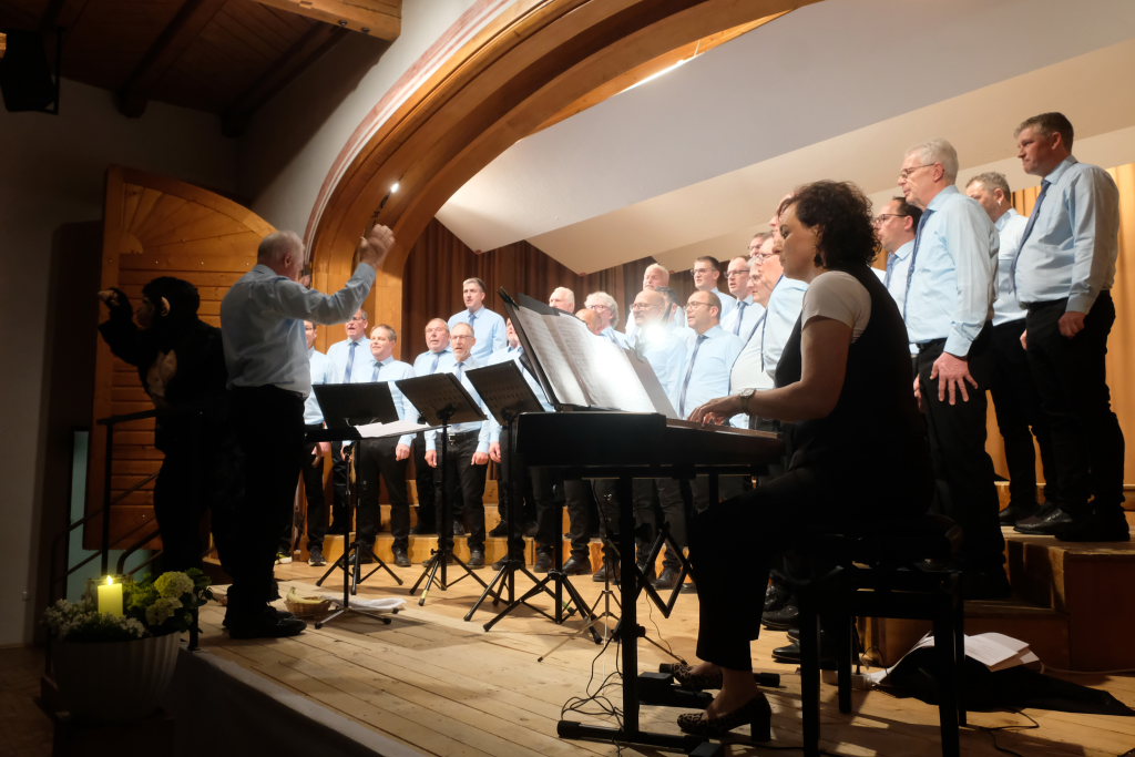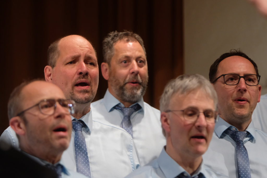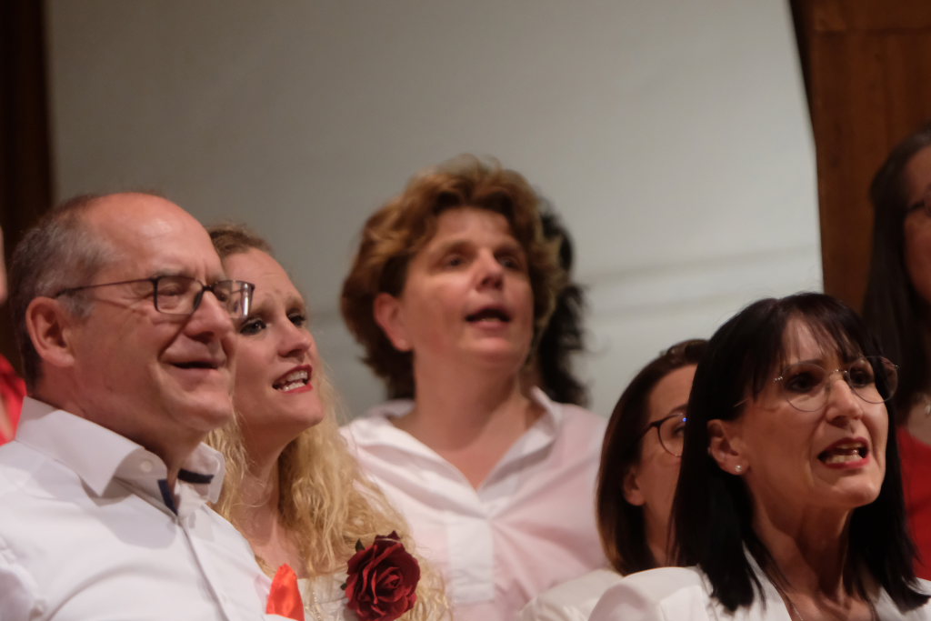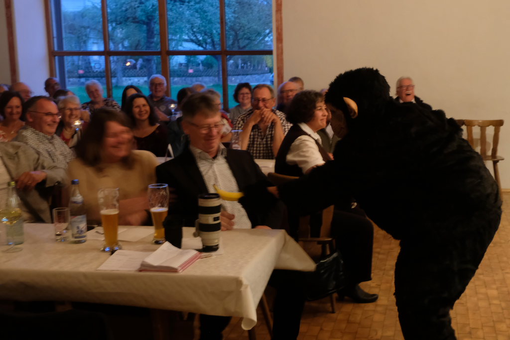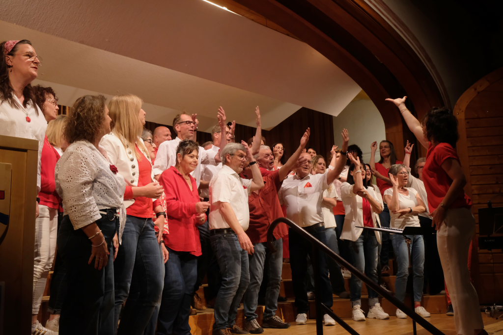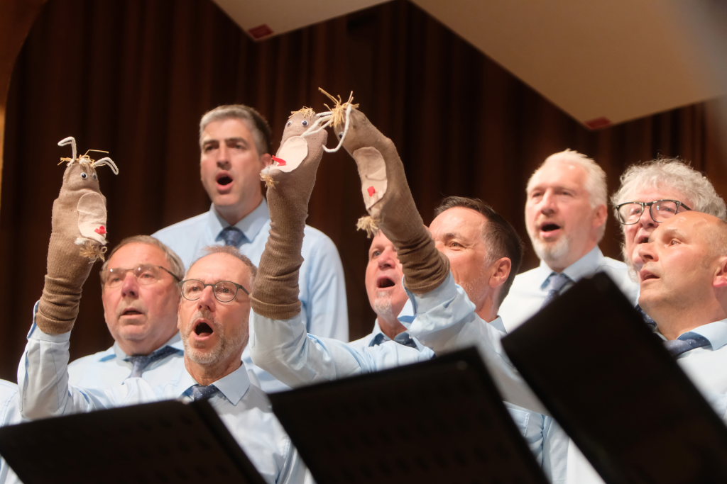 Musikalisch starteten die Sänger unter der Leitung von Erich Minsch und am Piano sicher begleitet von Christiane Pfänder mit einem musikalischen Willkommensgruß „Hallo, Hallo,“ und dem Liebeserklärungs-Klassiker „Aber dich gibt’s nur einmal für mich“. Eine ganz andere Bedeutung hatte ursprünglich ihr nächstes Lied „Bella-Ciao“. Das Lied hat seine Wurzeln in der italienischen Partisanenbewegung während des Zweiten Weltkriegs. Ursprünglich als Volkslied der Reisbauern in der Po-Ebene bekannt, wurde es zu einer wichtigen Hymne des antifaschistischen Widerstands. Heute wird Bella Ciao nicht nur als Mahnung an die dunklen Kapitel der Geschichte angesehen, sondern auch als zeitloses Zeichen für den fortwährenden Kampf gegen Ungerechtigkeit und Tyrannei. „Trag mi Wind“ wurde von der österreichischen Mundartdichterin Brigitte Hubmann kurz vor ihrem Tod 2010 geschrieben. In ihrem Text blickt sie dem Tod entgegen und bittet den Wind, sie zu tragen, heim übers Land, übers Meer. Doch bevor das Publikum in Melancholie versinken konnte, wurden Dirigent, Chor und Publikum beim Dschungelbuch-Medley von einem Schabernack-freudigen Affen – nein, nicht gebissen – aber doch ein wenig auf den Arm genommen.