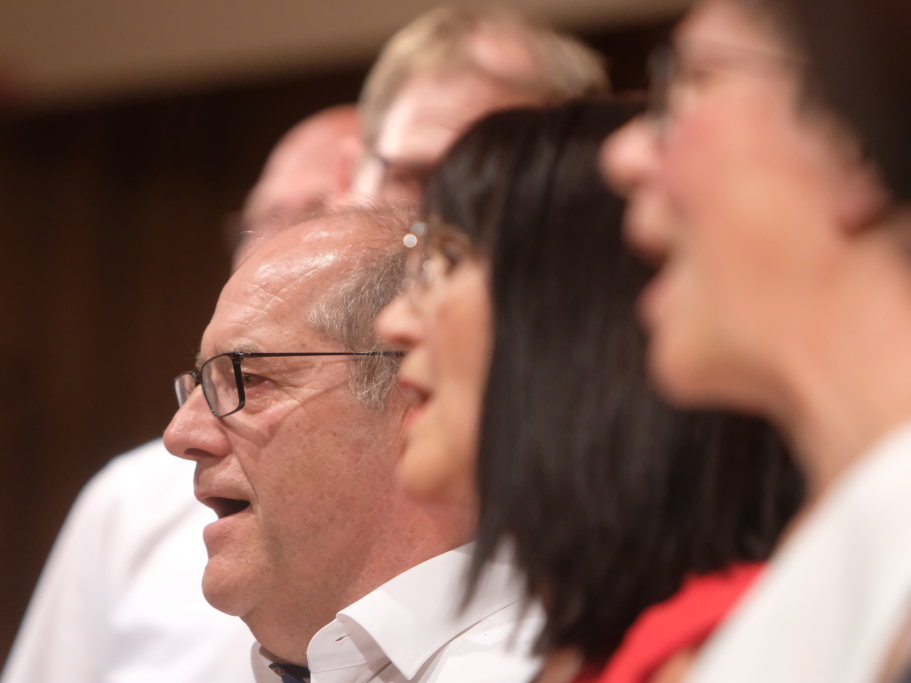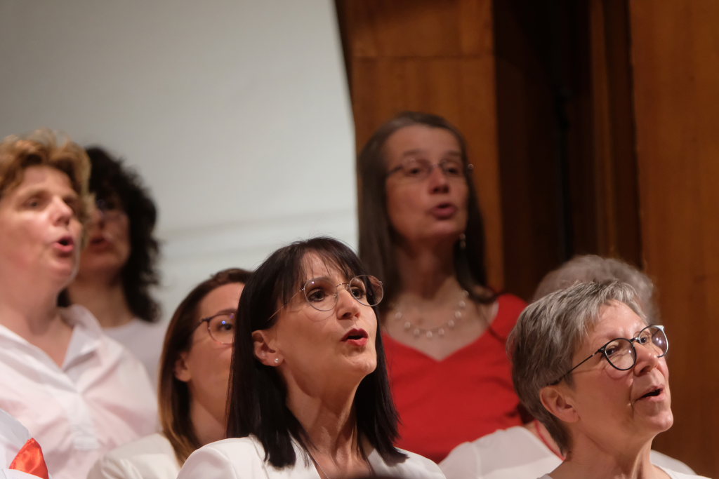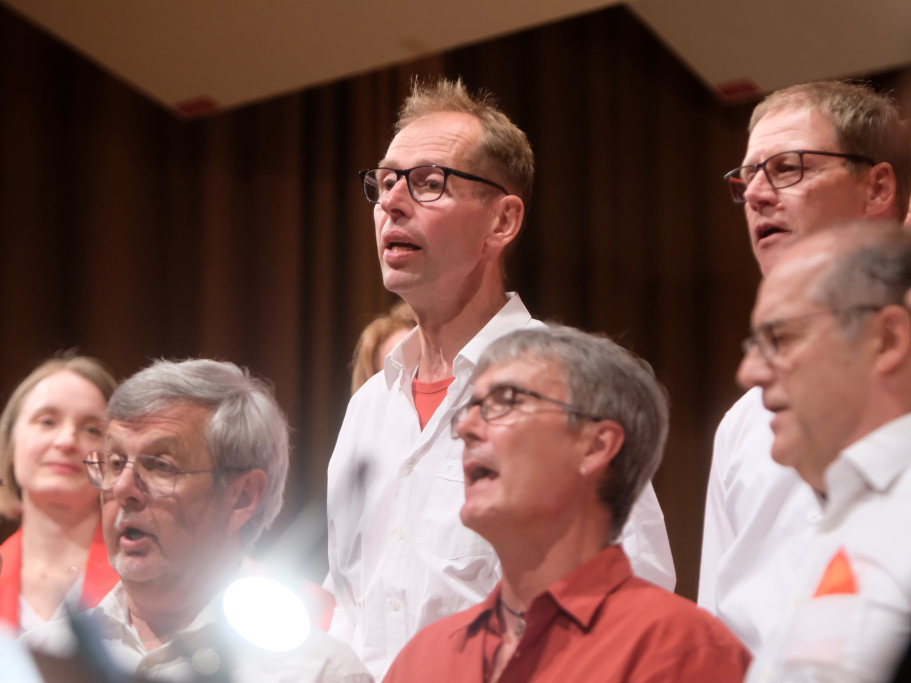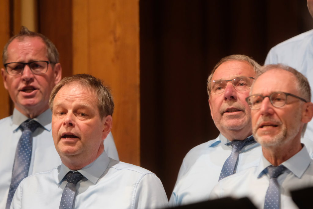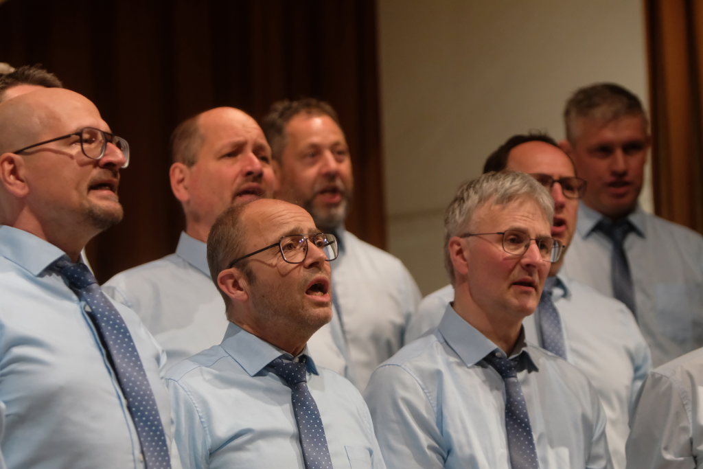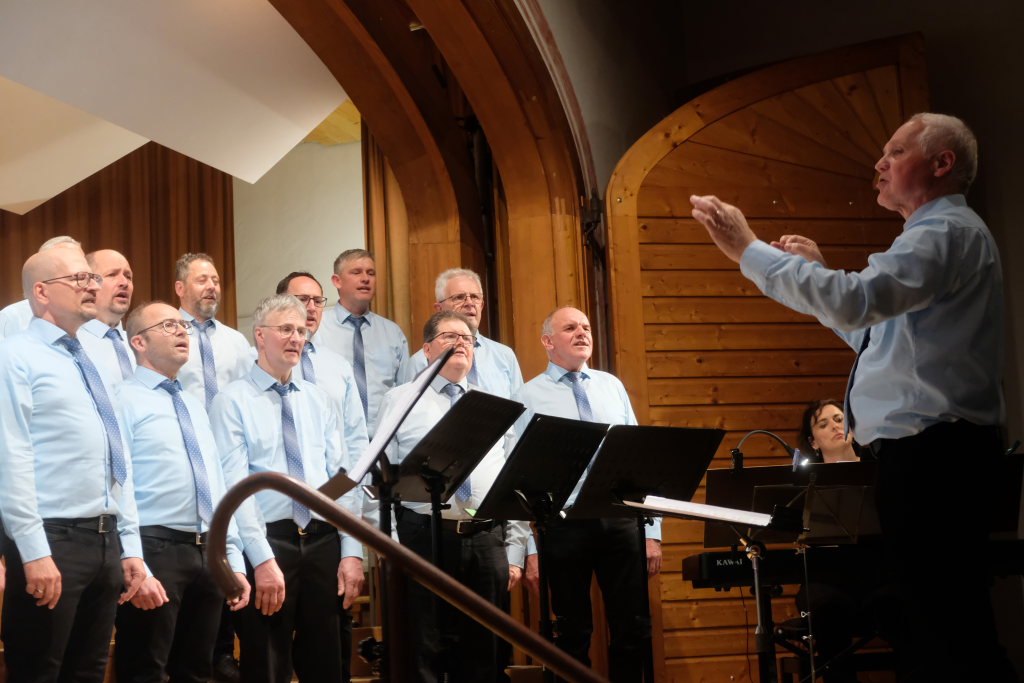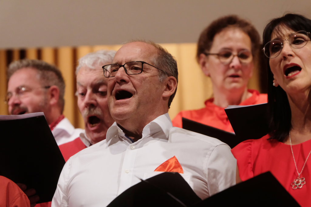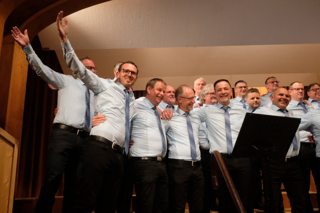 Musikalisch starteten die Sänger unter der Leitung von Erich Minsch und am Piano sicher begleitet von Christiane Pfänder mit einem musikalischen Willkommensgruß „Hallo, Hallo,“ und dem Liebeserklärungs-Klassiker „Aber dich gibt’s nur einmal für mich“. Eine ganz andere Bedeutung hatte ursprünglich ihr nächstes Lied „Bella-Ciao“. Das Lied hat seine Wurzeln in der italienischen Partisanenbewegung während des Zweiten Weltkriegs. Ursprünglich als Volkslied der Reisbauern in der Po-Ebene bekannt, wurde es zu einer wichtigen Hymne des antifaschistischen Widerstands. Heute wird Bella Ciao nicht nur als Mahnung an die dunklen Kapitel der Geschichte angesehen, sondern auch als zeitloses Zeichen für den fortwährenden Kampf gegen Ungerechtigkeit und Tyrannei. „Trag mi Wind“ wurde von der österreichischen Mundartdichterin Brigitte Hubmann kurz vor ihrem Tod 2010 geschrieben. In ihrem Text blickt sie dem Tod entgegen und bittet den Wind, sie zu tragen, heim übers Land, übers Meer. Doch bevor das Publikum in Melancholie versinken konnte, wurden Dirigent, Chor und Publikum beim Dschungelbuch-Medley von einem Schabernack-freudigen Affen – nein, nicht gebissen – aber doch ein wenig auf den Arm genommen.