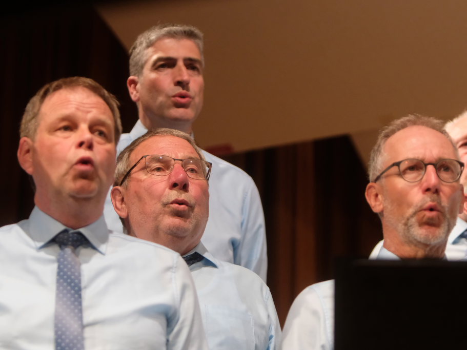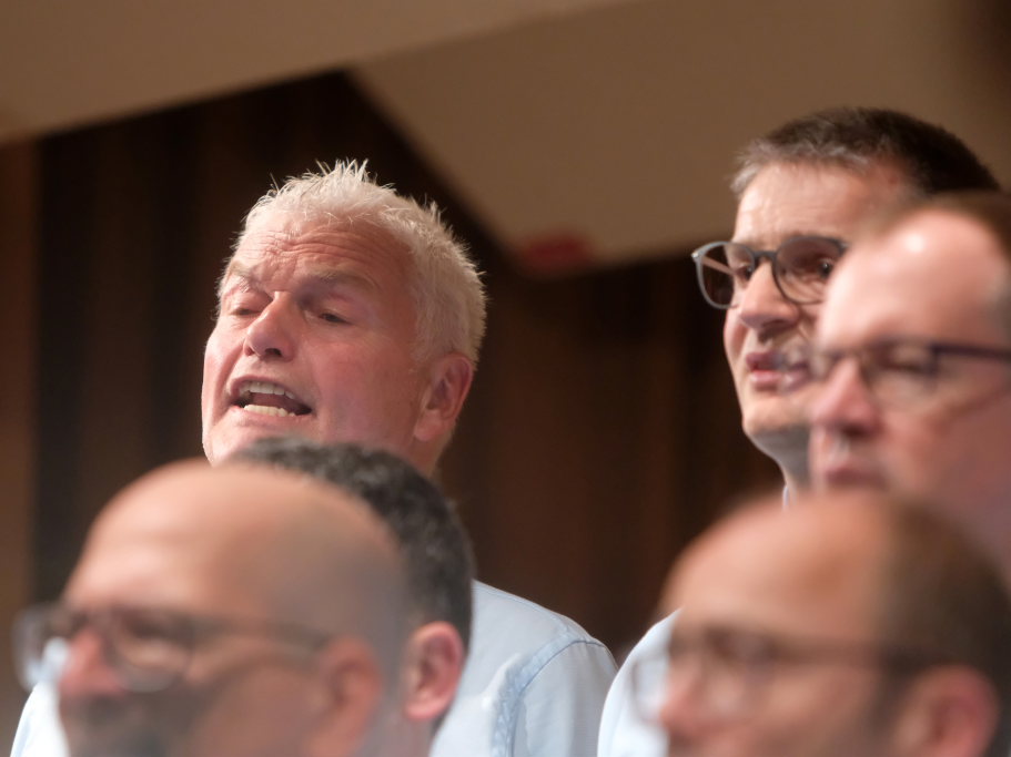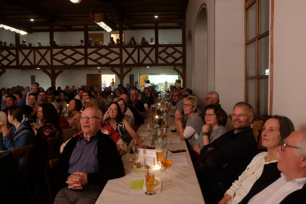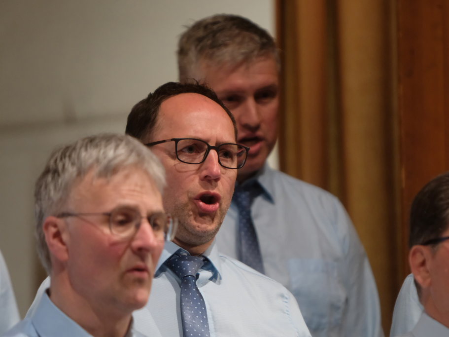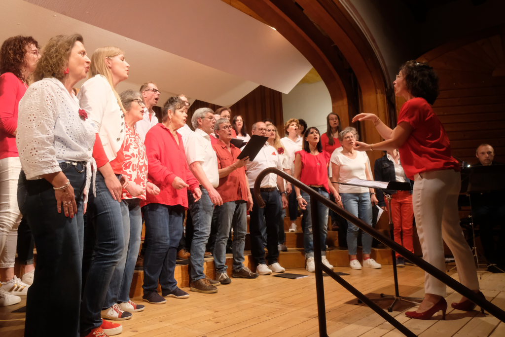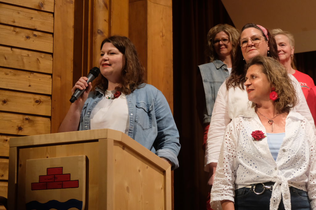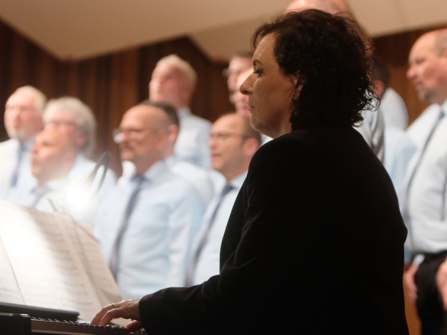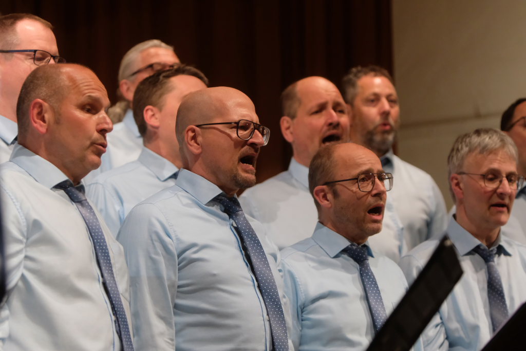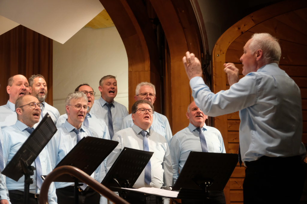 Musikalisch starteten die Sänger unter der Leitung von Erich Minsch und am Piano sicher begleitet von Christiane Pfänder mit einem musikalischen Willkommensgruß „Hallo, Hallo,“ und dem Liebeserklärungs-Klassiker „Aber dich gibt’s nur einmal für mich“. Eine ganz andere Bedeutung hatte ursprünglich ihr nächstes Lied „Bella-Ciao“. Das Lied hat seine Wurzeln in der italienischen Partisanenbewegung während des Zweiten Weltkriegs. Ursprünglich als Volkslied der Reisbauern in der Po-Ebene bekannt, wurde es zu einer wichtigen Hymne des antifaschistischen Widerstands. Heute wird Bella Ciao nicht nur als Mahnung an die dunklen Kapitel der Geschichte angesehen, sondern auch als zeitloses Zeichen für den fortwährenden Kampf gegen Ungerechtigkeit und Tyrannei. „Trag mi Wind“ wurde von der österreichischen Mundartdichterin Brigitte Hubmann kurz vor ihrem Tod 2010 geschrieben. In ihrem Text blickt sie dem Tod entgegen und bittet den Wind, sie zu tragen, heim übers Land, übers Meer. Doch bevor das Publikum in Melancholie versinken konnte, wurden Dirigent, Chor und Publikum beim Dschungelbuch-Medley von einem Schabernack-freudigen Affen – nein, nicht gebissen – aber doch ein wenig auf den Arm genommen.