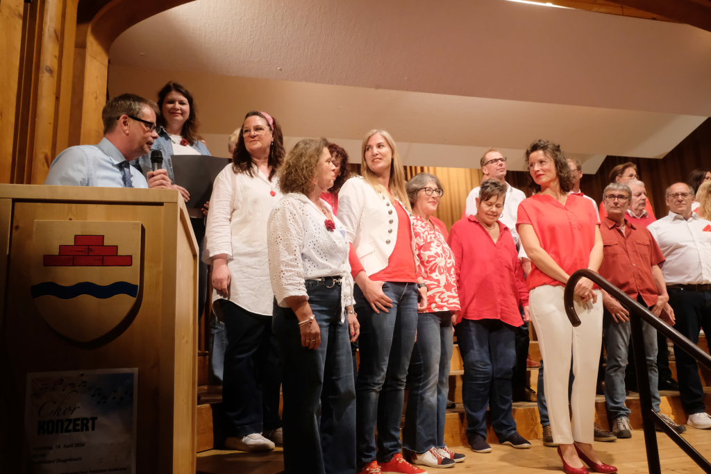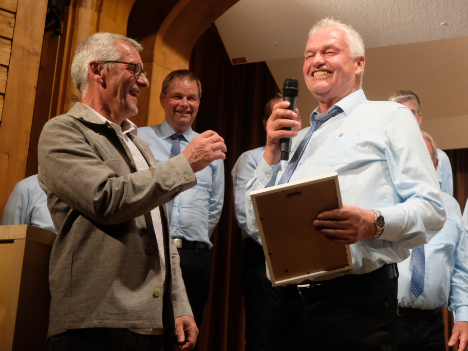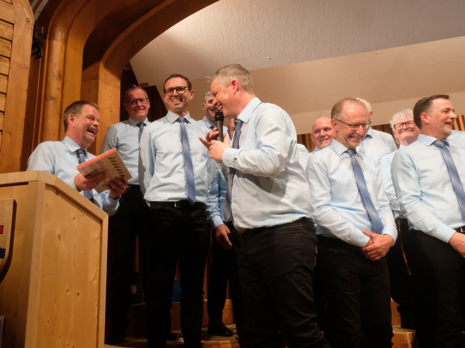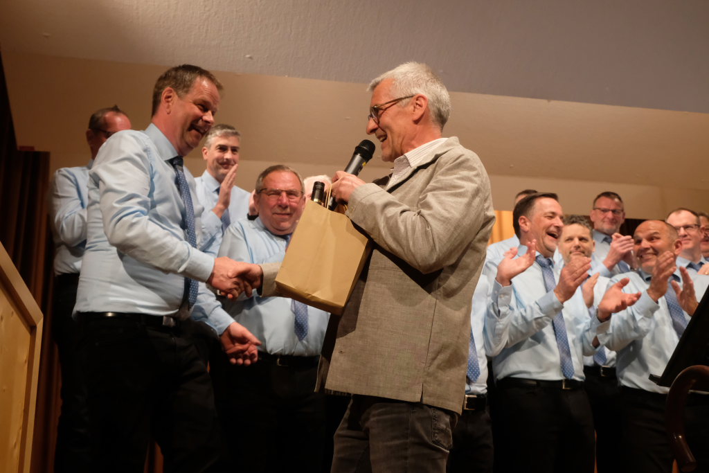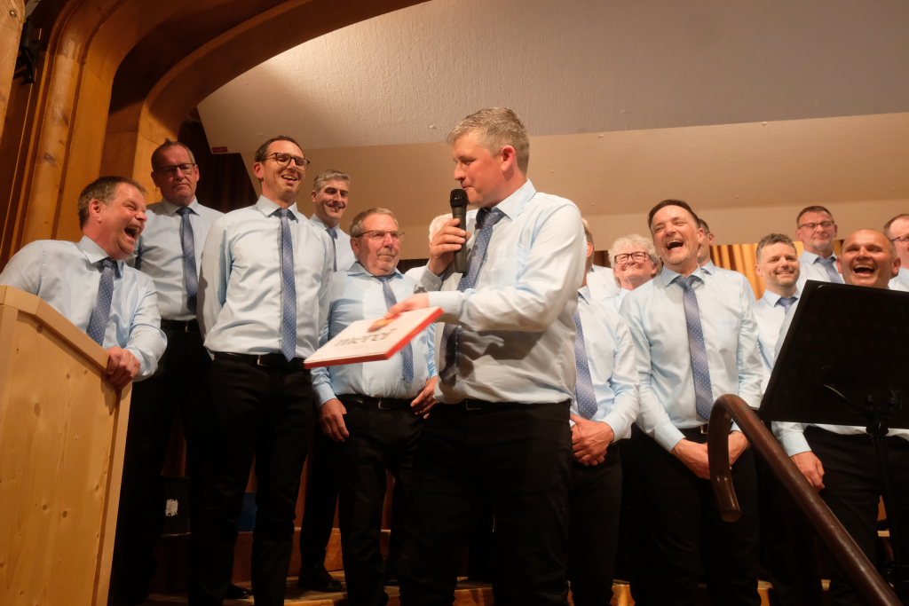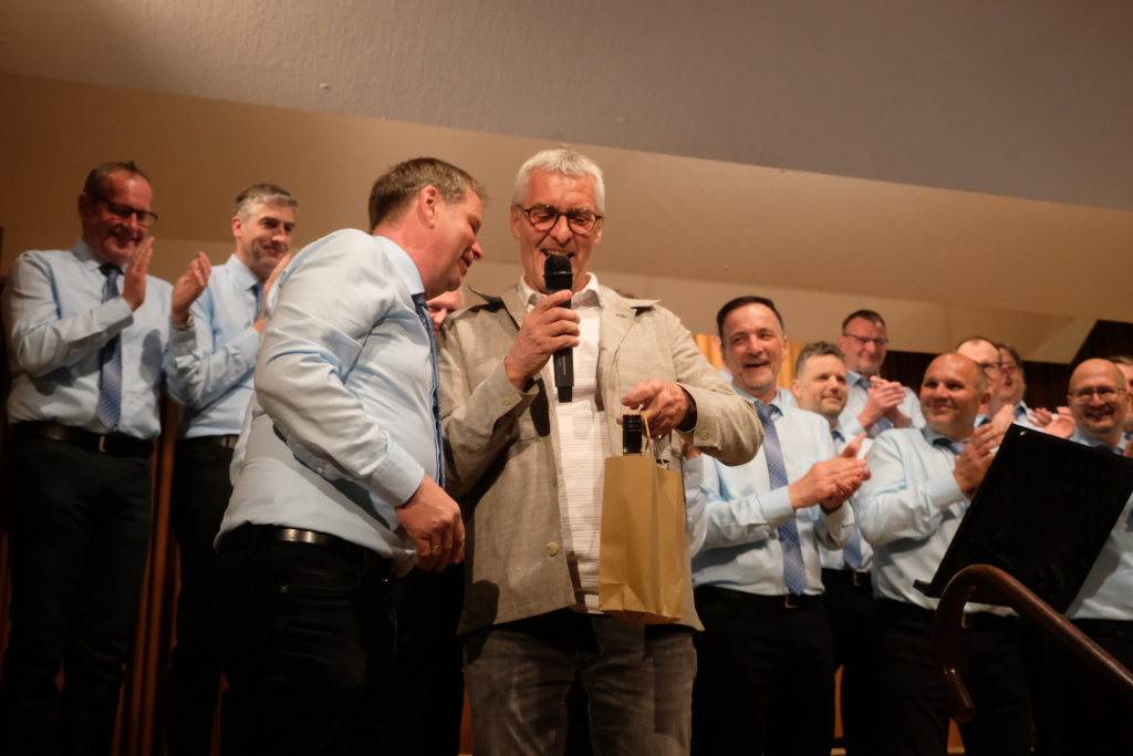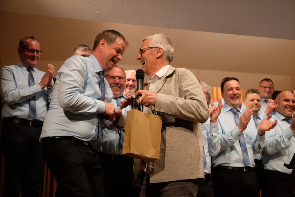 Stefan Veser, der Vorstandssprecher, hatte an diesem Konzertabend Geburtstag. Deswegen wurde nicht nur Leo Stölzle vom stellvertretenden Seibranzer Ortsvorsteher Roland Eisenbarth für sein vierzigjähriges Engagement im Chor geehrt, sondern dieser gratulierte auch Stefan Veser mit einem Geburtstagspräsent. Und natürlich gratulierte auch der ganze Dorfstadel bei so viel geballt vorhandener Sängerpower mit dem berühmtesten Geburtstagslied überhaupt. Leo Stölzle war nach 16 Jahren beim Männerchor Altmannshofen 2002 als zweiter Tenor zum Chor in Seibranz gestoßen und hatte von 2012 bis 2026 dem Vorstandsteam angehört. Der Geehrte wurde von der Ehrung völlig überrascht, gab er später zu Protokoll.