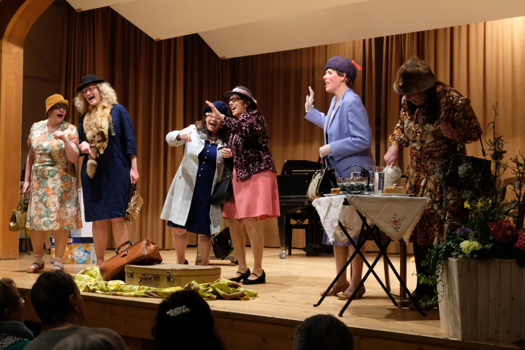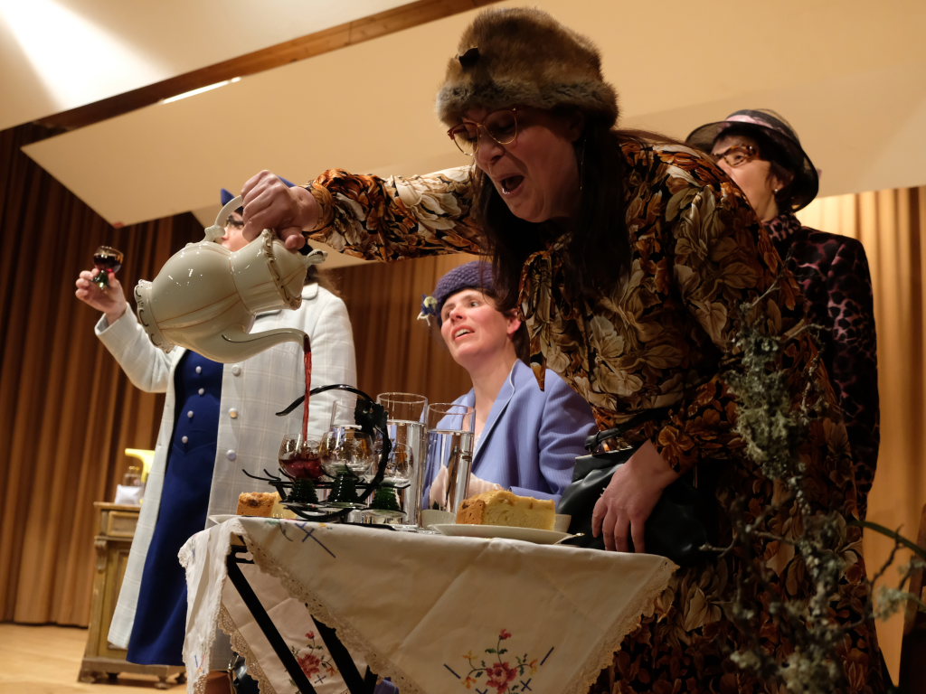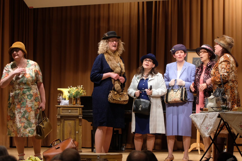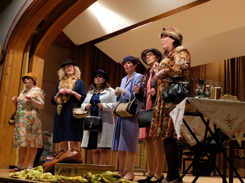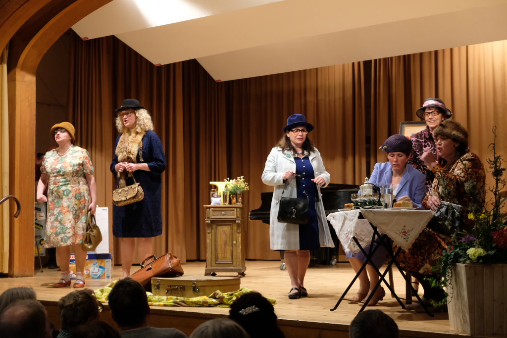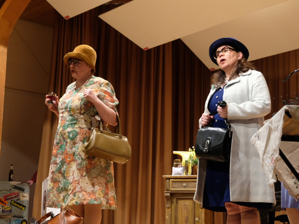 Bei Halba Drui ist eigentlich nichts, wie es zu sein scheint. Die „alten“ Damen sind im wirklichen Leben eine Generation jünger als ihre Bühnenpräsenz. Und anstelle von Kaffee rinnt Rotwein durch den Schwanenhals der Kaffeekanne des Porzellan-Services beim Kaffeekränzchen. Und die kleinen Römer-Weingläser stammen aus der Zeit, als die auf der Bühne dargestellten Damen noch jung waren. Gerne nahmen die sechs Damen aus Unteropfingen, die aufgrund mehrerer legendärer Auftritte beim A-Cappella-Abend des Kirchenchors Ziegelbach hierzulande keine Unbekannten sind, die Steilvorlage an, die die Mannen um Peter Schad ihnen mit ihrem letzten Lied geliefert hatten.