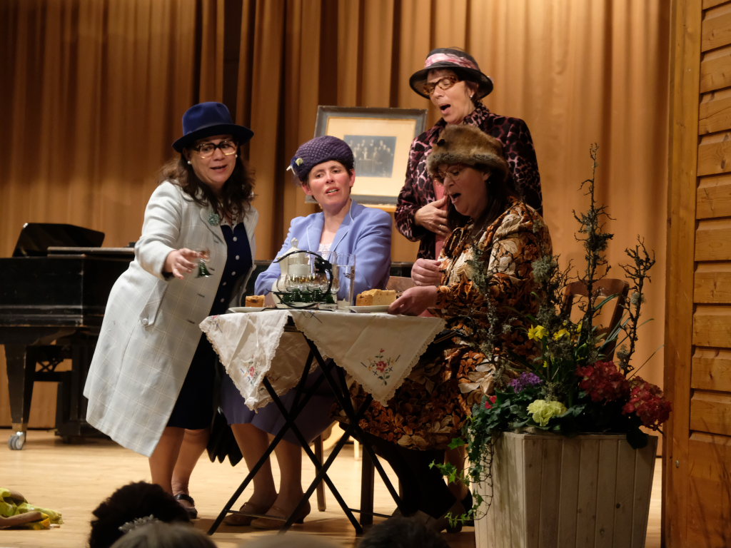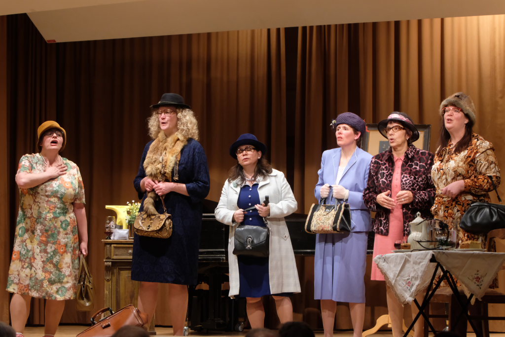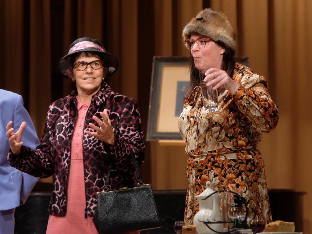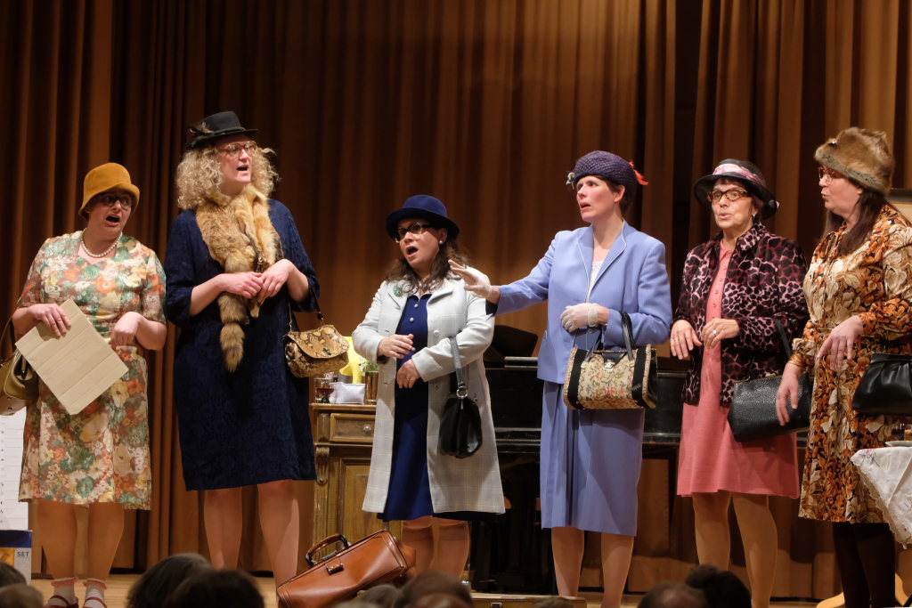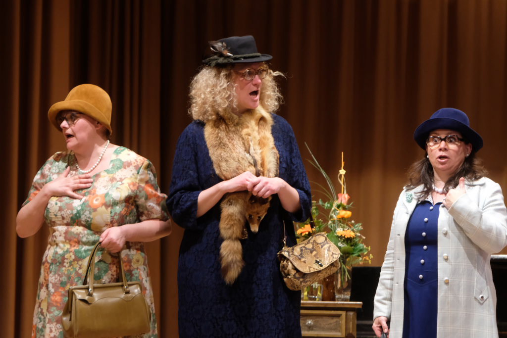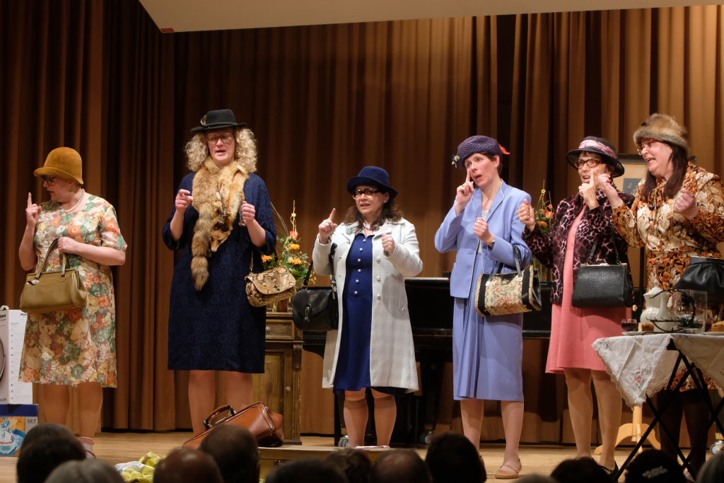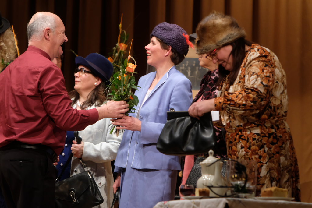 Bei Halba Drui ist eigentlich nichts, wie es zu sein scheint. Die „alten“ Damen sind im wirklichen Leben eine Generation jünger als ihre Bühnenpräsenz. Und anstelle von Kaffee rinnt Rotwein durch den Schwanenhals der Kaffeekanne des Porzellan-Services beim Kaffeekränzchen. Und die kleinen Römer-Weingläser stammen aus der Zeit, als die auf der Bühne dargestellten Damen noch jung waren. Gerne nahmen die sechs Damen aus Unteropfingen, die aufgrund mehrerer legendärer Auftritte beim A-Cappella-Abend des Kirchenchors Ziegelbach hierzulande keine Unbekannten sind, die Steilvorlage an, die die Mannen um Peter Schad ihnen mit ihrem letzten Lied geliefert hatten.