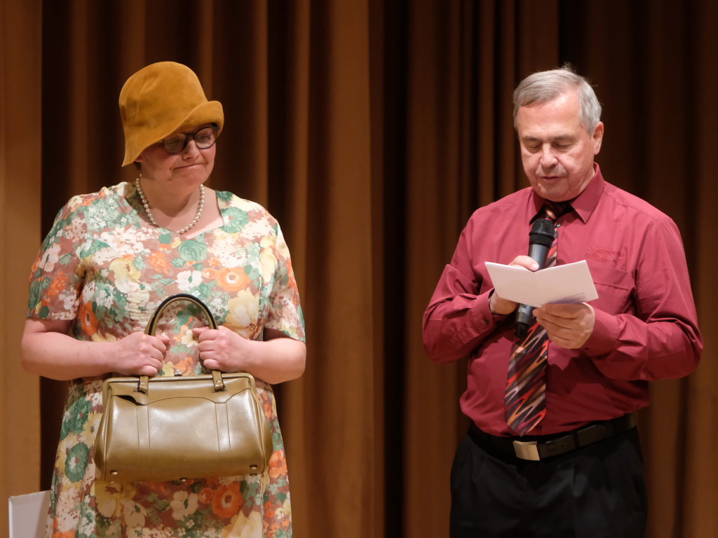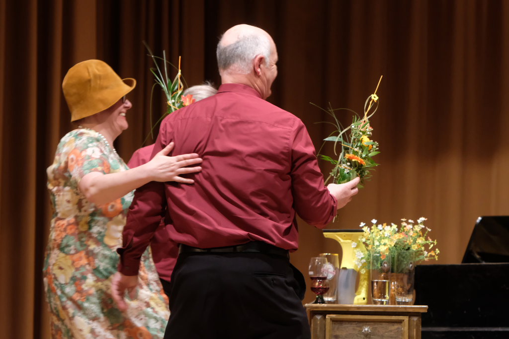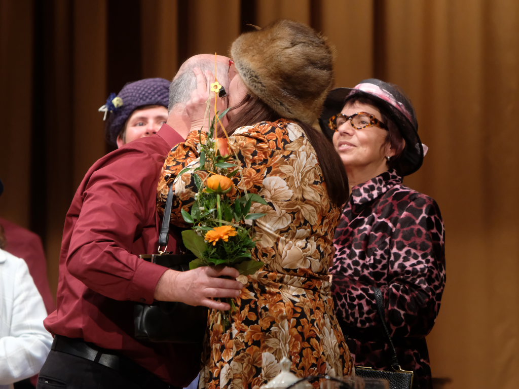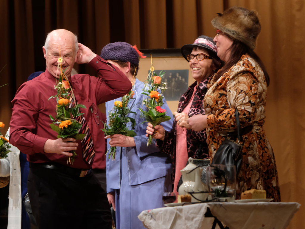 Es war also ein höchst amüsanter Abend im Dorfstadel, für das sich Männerchor-Vorstand Karl Notz bei allen Beteiligten, den Musiker und Musikerinnen, aber auch allen an der Organisation Beteiligten bedankte. Bruno Häfele, der im Auftrag des Männerchores den „Mordsweibern“ aus Unteropfingen (O-Ton Häfele) einen Blumengruß überreichte, wurde dafür mit einem ganz besonderen Geschenk von extra nachgezogenen Lippen bedacht….