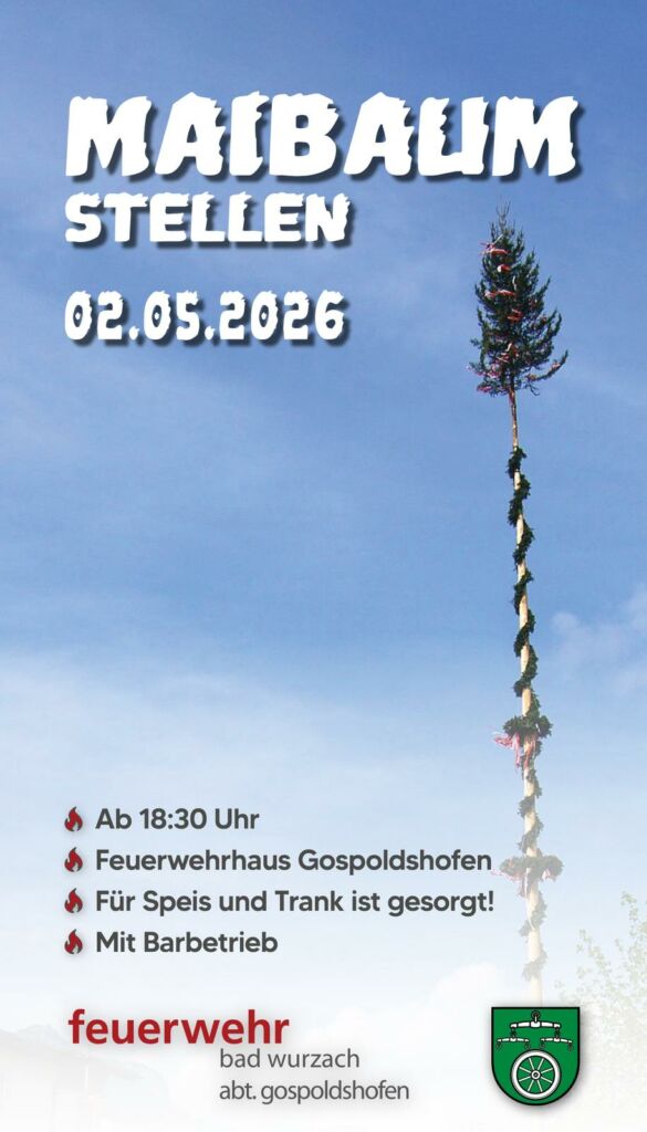 Gospoldshofen – In diesem Jahr soll wie gewohnt ein Maibaum den Ort schmücken. Wir, die Feuerwehr Bad Wurzach, Abt. Gospoldshofen, freuen uns in diesem Jahr am Samstag, 2. Mai, ab 19.00 Uhr den Maibaum in Gospoldhofen am Feuerwehrhaus zu stellen und unsere Gäste mit Speis und Trank zu verköstigen. Später öffnet im 1. Stock dann unsere „Spritzen Bar“. Hierzu laden wir Euch alle ein und freuen uns über zahlreiche Gäste. Eure Feuerwehr Bad Wurzach, Abt. Gospoldshofen
