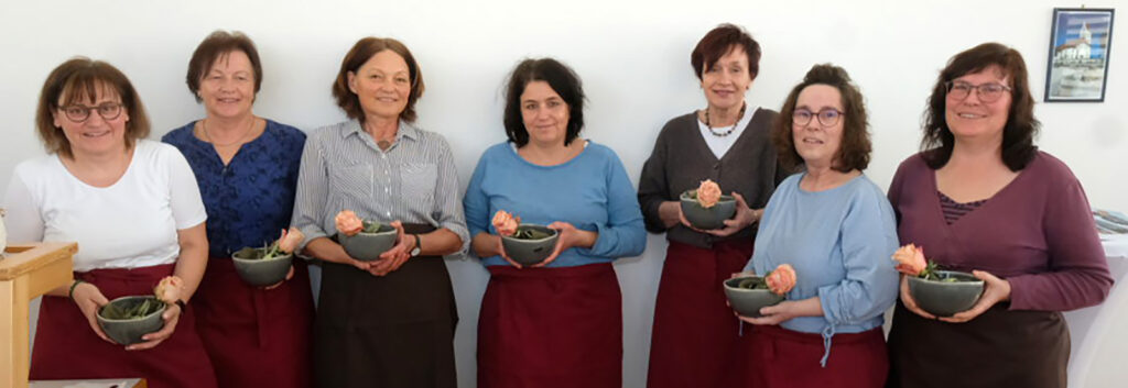 Blumen für die Teamerinnen: Anerkennung seitens der Pfarrei für die wertvolle Arbeit. Jetzt macht das Begegnungsnachmittagsteam Pause; im Herbst lädt das Team wieder ein.