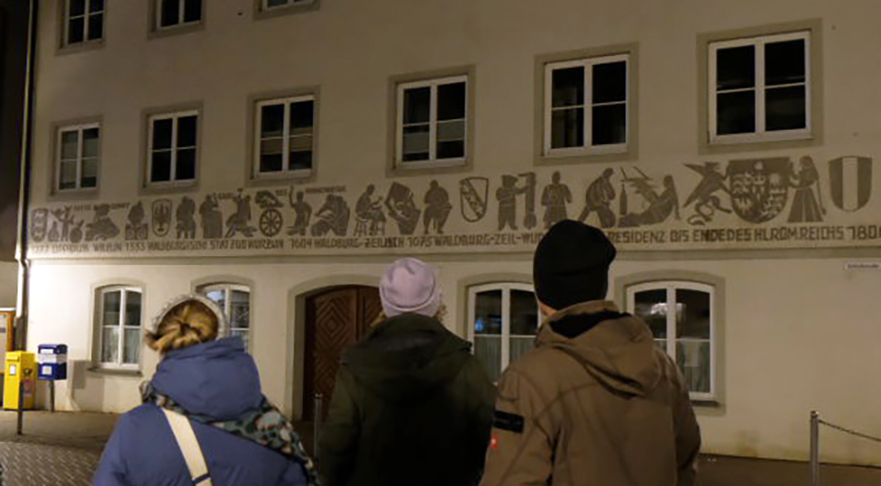 Schlusspunkt der Führung war auf dem Platz beim Marienbrunnen und dem Rathaus. Dort erläuterte der „Nachtwächter“ Peter Koerver, was die einzelnen Sgraffiti rund um das Rathaus zu bedeuten haben und wies besonders auf den Spruch auf der Seite zum Café Steinhauser hin, der da lautet: „Es zwicke Dich, der Himmel geb´s, nur so ein kleiner Wurzach Krebs, denn es gibt noch grössre Nummern, denke an die Riesen-Hummern.“ Unter den Sgraffiti sind auch die Symbole der Fetten Zunft und des großen Handwerks. Dessen Zunftfahne wurde auch zur Stadtfahne erhoben. Aus diesem Grund ist Bad Wurzach die einzige Stadt in der Bundesrepublik mit einer echten Trikolore, denn die Stadtfarben sind Rot, Gelb und Blau.
