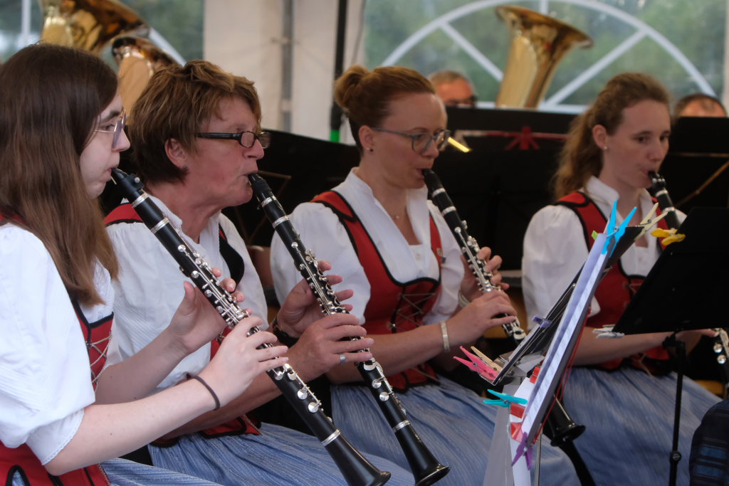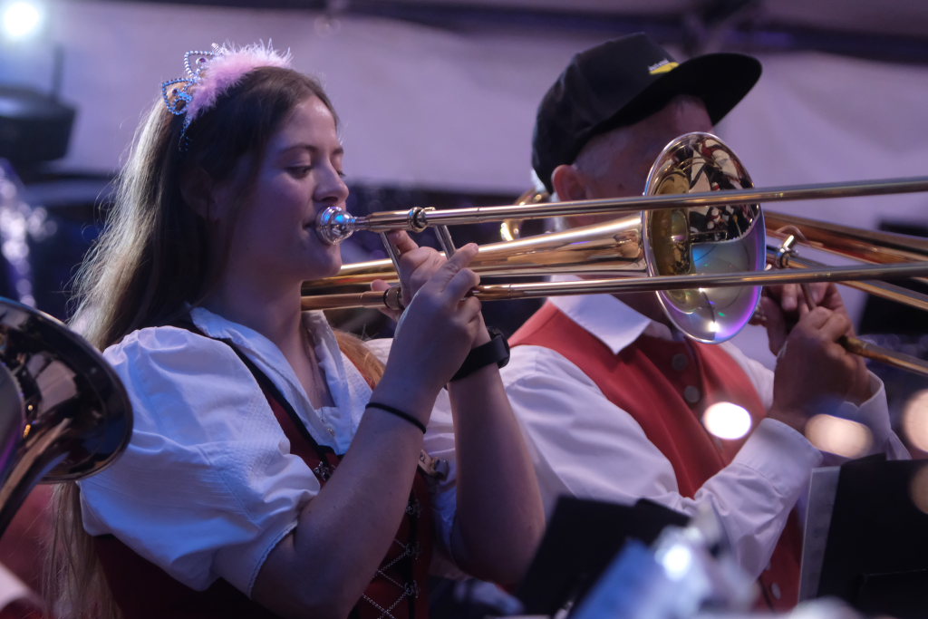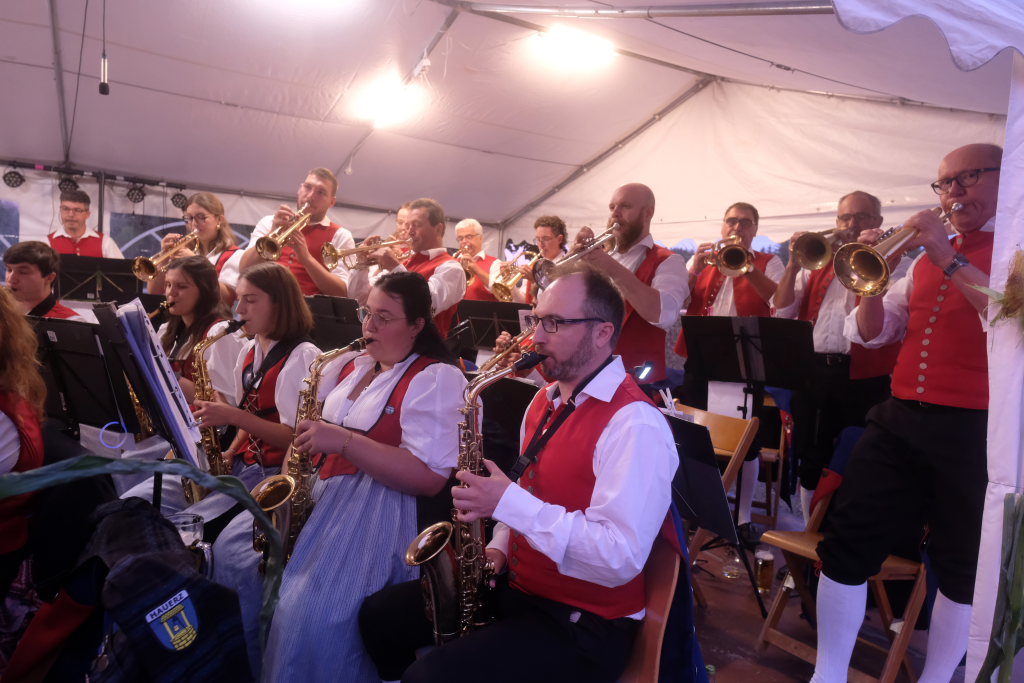 Nach diesem Ausflug in die Welt von Pop und Rock, mit dem sie auch die Jüngeren im inzwischen fast vollständig gefüllten Zelt ansprachen, ging es wieder zurück zur klassischen Festzelt Blasmusik, etwa mit der Kuschelpolka von Peter Schad, und natürlich der „Vogelwiese“, dem böhmischen Traum oder „Dem Land Tirol die Treue“.