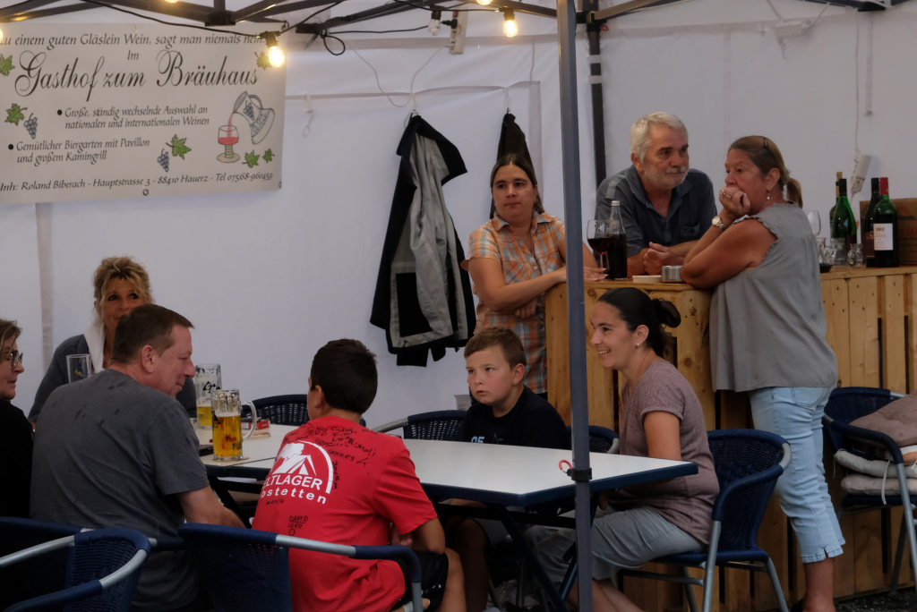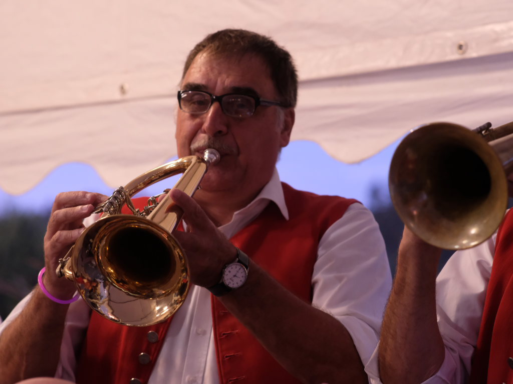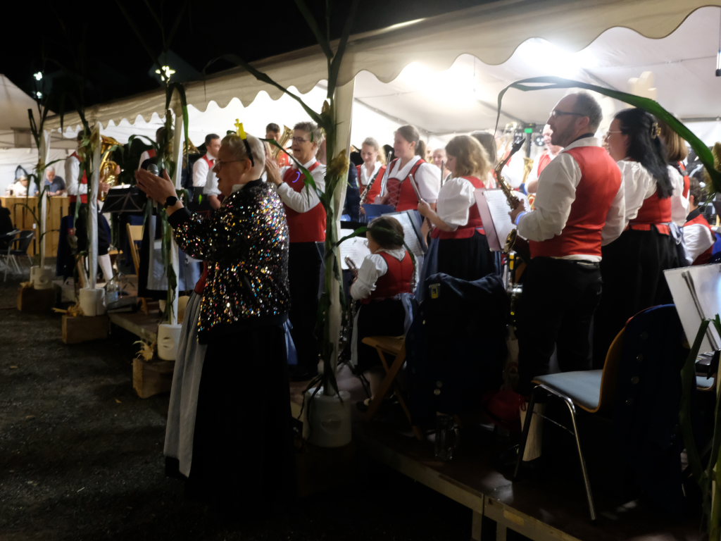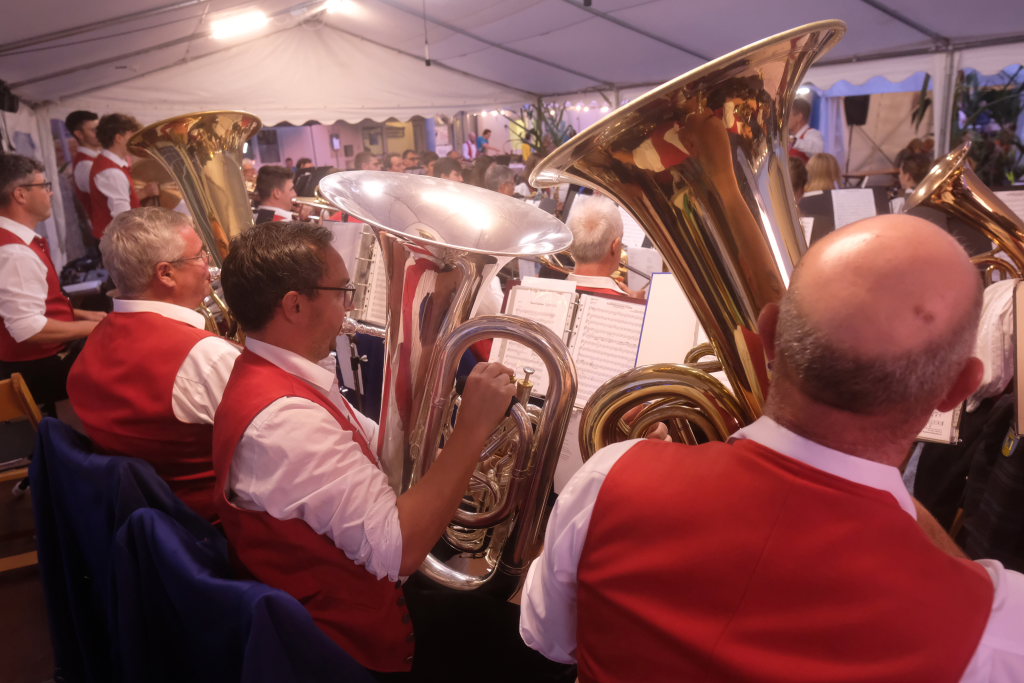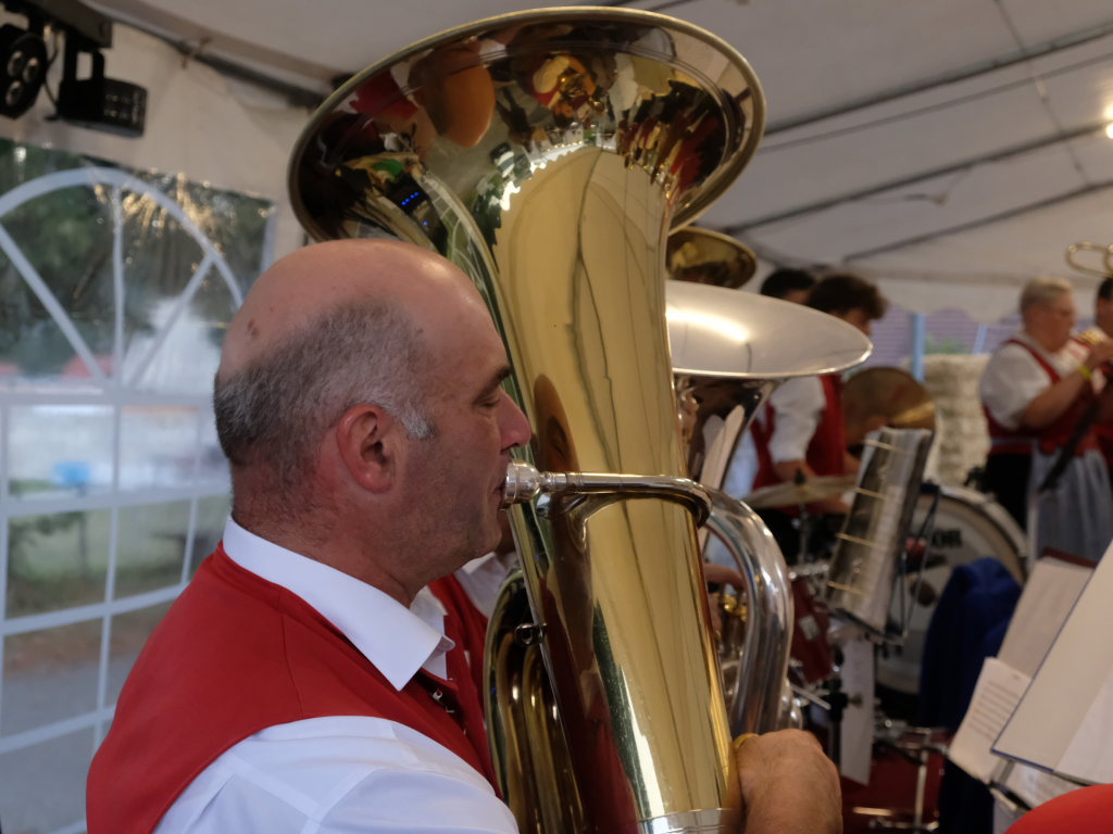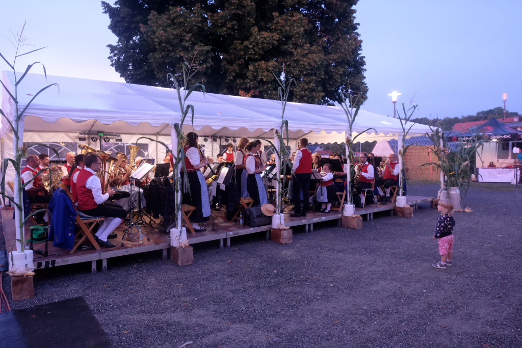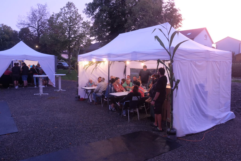 Gerade als die Musikanten am Samstagabend begannen, sich einzuspielen, konnten sie sich zu der Entscheidung für die Festzeltlösung gratulieren, denn es begann zu regnen. Aber weil sowohl der Catering-Bereich mit der Weinlaube, in welcher „der Obere Wirt“ Roland Biberach edle Tropfen ausschenkte, wie auch die Musikantenbühne überdacht waren, stellte das kein allzu großes Problem dar.