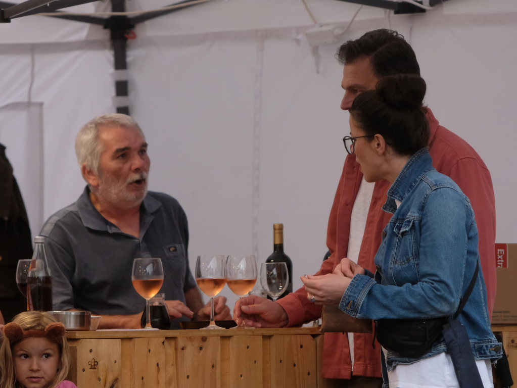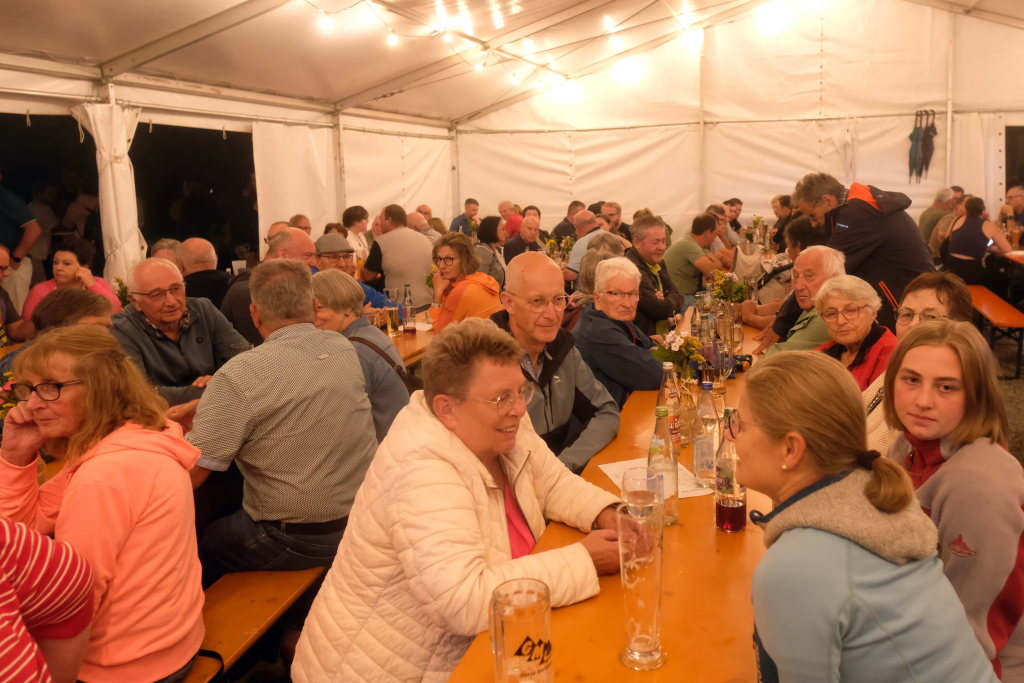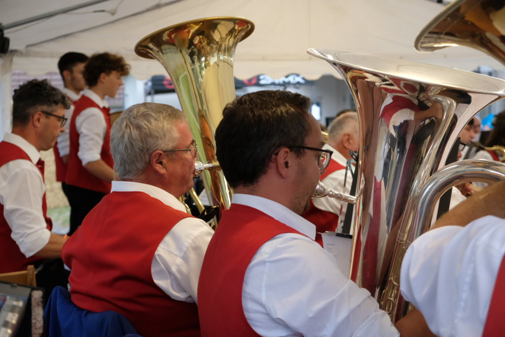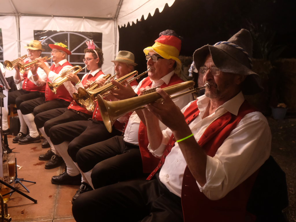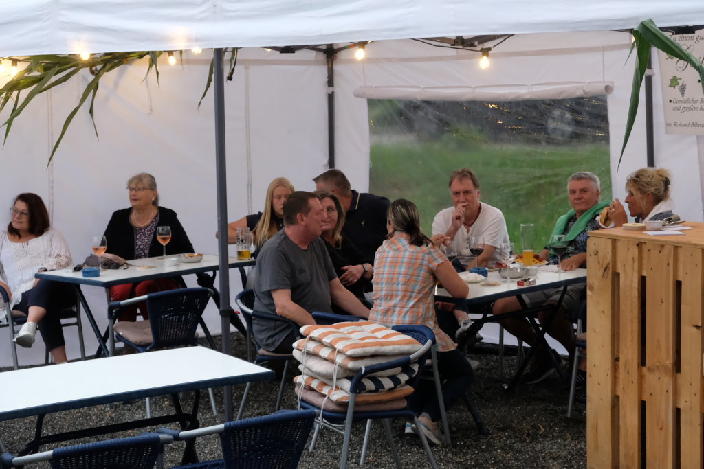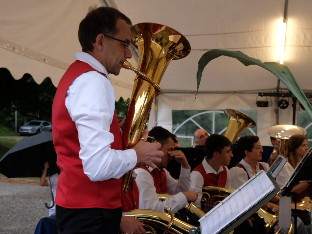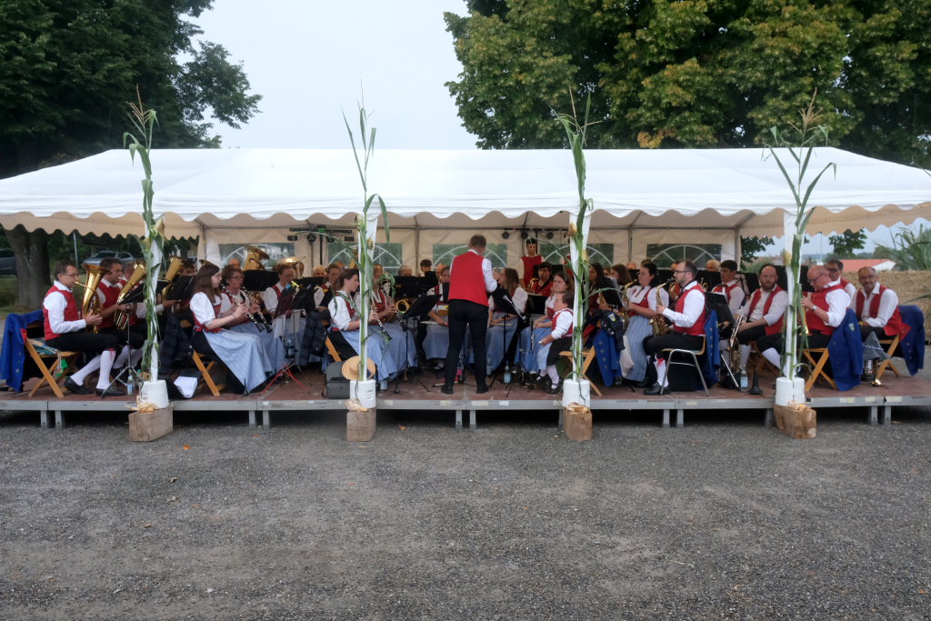 Gerade als die Musikanten am Samstagabend begannen, sich einzuspielen, konnten sie sich zu der Entscheidung für die Festzeltlösung gratulieren, denn es begann zu regnen. Aber weil sowohl der Catering-Bereich mit der Weinlaube, in welcher „der Obere Wirt“ Roland Biberach edle Tropfen ausschenkte, wie auch die Musikantenbühne überdacht waren, stellte das kein allzu großes Problem dar.