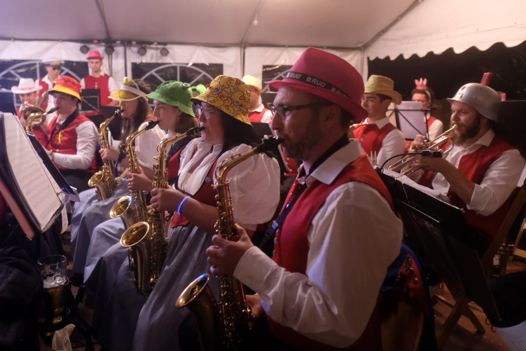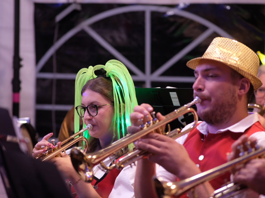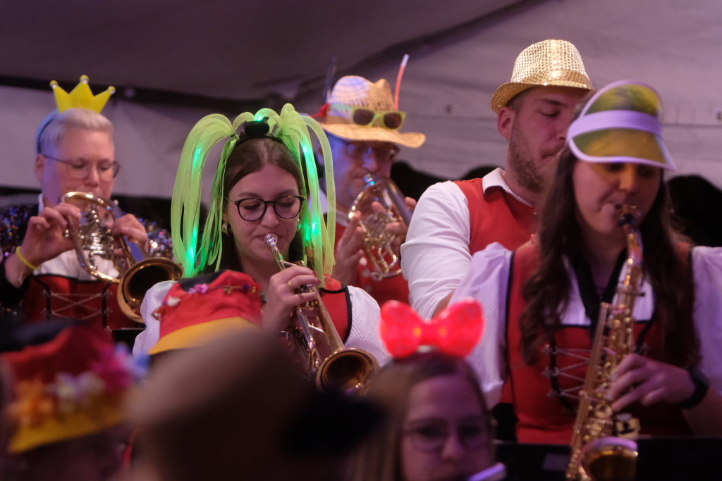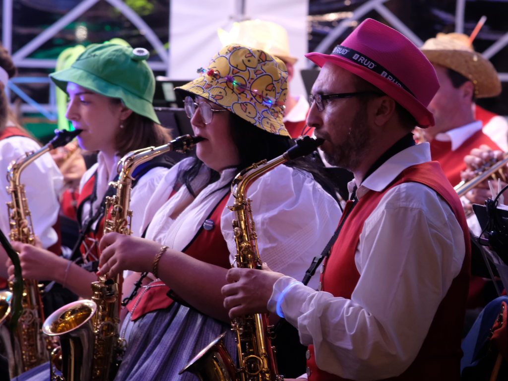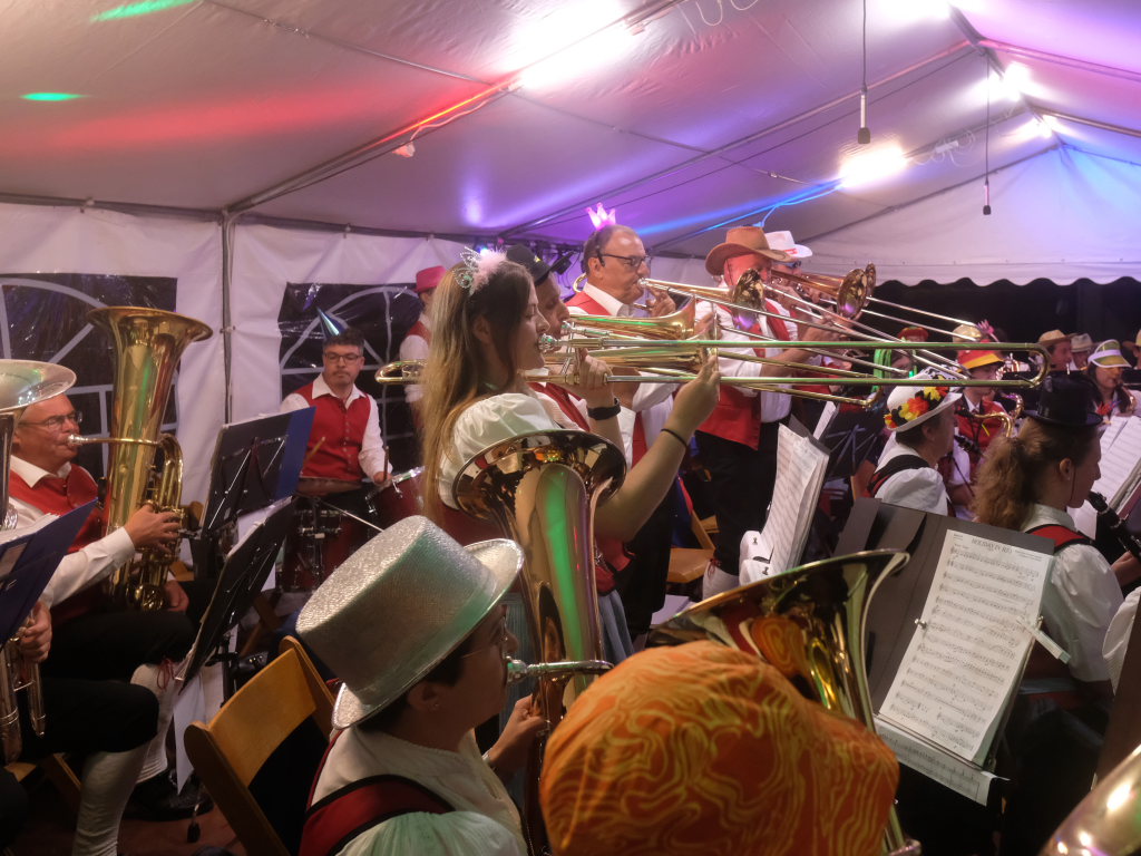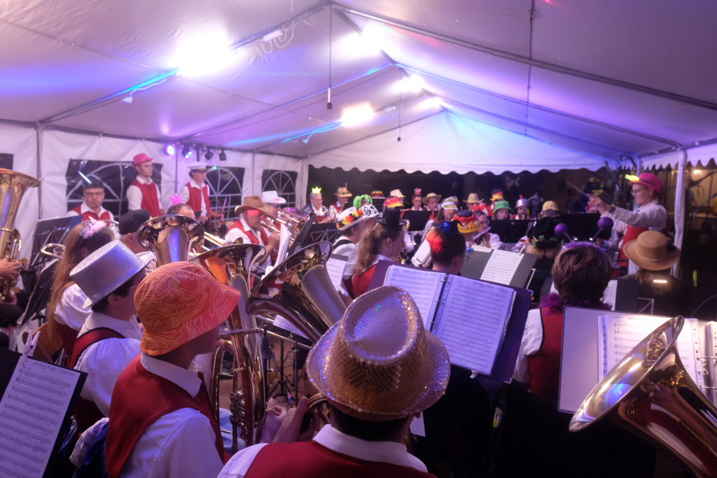 Am Samstagabend spielte der Musikverein Hauerz letztmals unter dem Interims-Dirigat von Anja Vincon, die den Abend mit einem bulgarischen Marsch eröffnete. Neben solch „exotischen“ Blasmusiktiteln boten die rund 40 Musiker im ersten Teil natürlich auch Klassiker wie die Lottchen-Polka, die Scharnagl-Polkas „Von Freund zu Freund“, und „Ehrenwert“ oder die Konzertmärsche Medici und Abel Tasman. Und weil das Fest auch ein Fest für die ganze Familie ist, hatten sie natürlich auch neben den Blasmusik-Klassikern auch Pop und Schlagertitel im Programm, zu dem sie sich auch mit witzigen Kopfbedeckungen eindeckten. Und so bekamen die Festbesucher etwa die Hits der Les Humphries Singers, Italo Pop Classics oder vom Partyplanet von Musikern geboten, deren Häupter bunt glitzernde Partyhüte, das eine oder andere Prinzessinnenkrönchen, Strohhüte, aber auch Märchenhaftes oder aus dem Fußballstadion bekannte Deutschlandkappen krönten.