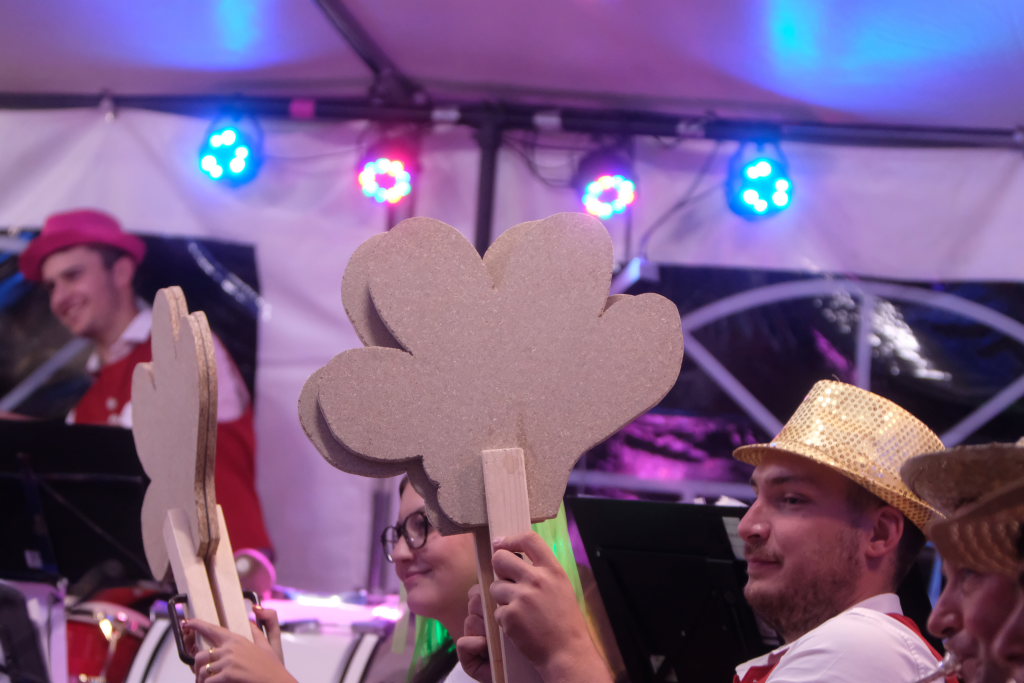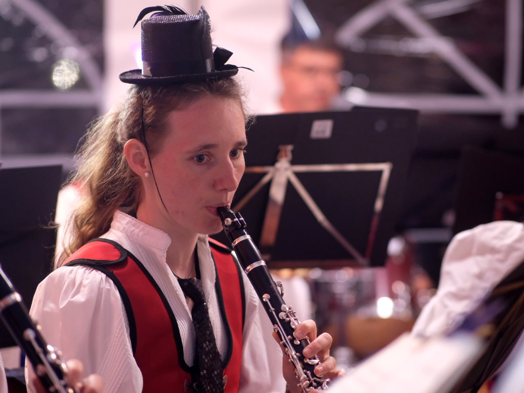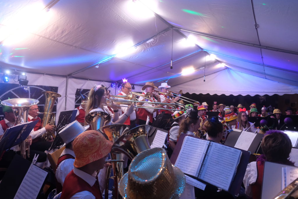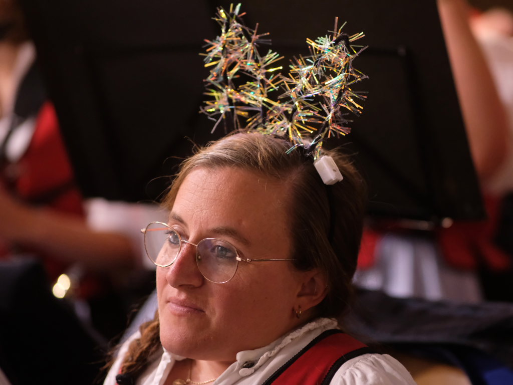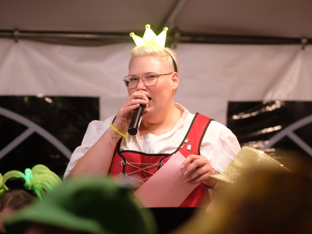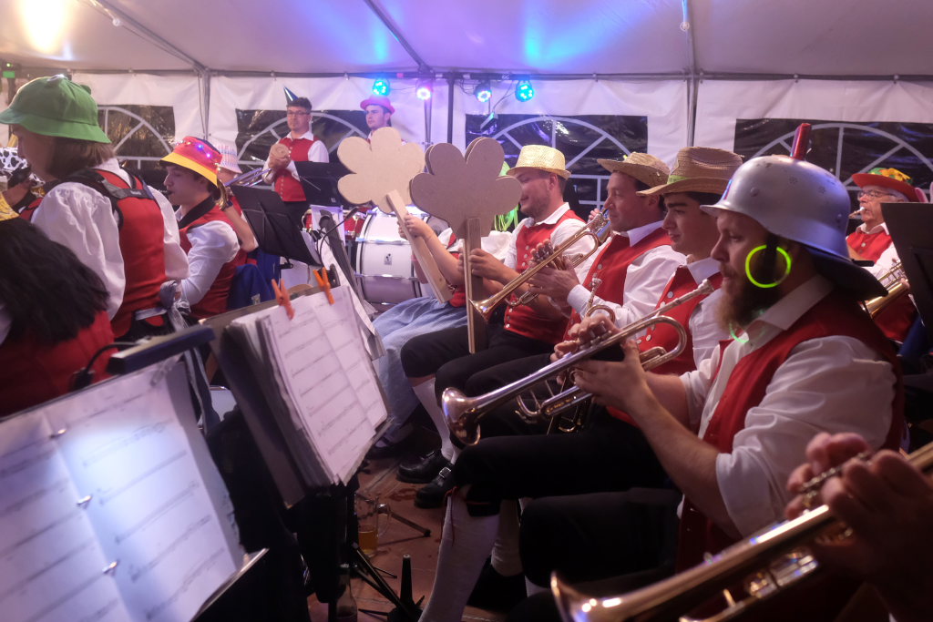 Am Samstagabend spielte der Musikverein Hauerz letztmals unter dem Interims-Dirigat von Anja Vincon, die den Abend mit einem bulgarischen Marsch eröffnete. Neben solch „exotischen“ Blasmusiktiteln boten die rund 40 Musiker im ersten Teil natürlich auch Klassiker wie die Lottchen-Polka, die Scharnagl-Polkas „Von Freund zu Freund“, und „Ehrenwert“ oder die Konzertmärsche Medici und Abel Tasman. Und weil das Fest auch ein Fest für die ganze Familie ist, hatten sie natürlich auch neben den Blasmusik-Klassikern auch Pop und Schlagertitel im Programm, zu dem sie sich auch mit witzigen Kopfbedeckungen eindeckten. Und so bekamen die Festbesucher etwa die Hits der Les Humphries Singers, Italo Pop Classics oder vom Partyplanet von Musikern geboten, deren Häupter bunt glitzernde Partyhüte, das eine oder andere Prinzessinnenkrönchen, Strohhüte, aber auch Märchenhaftes oder aus dem Fußballstadion bekannte Deutschlandkappen krönten.